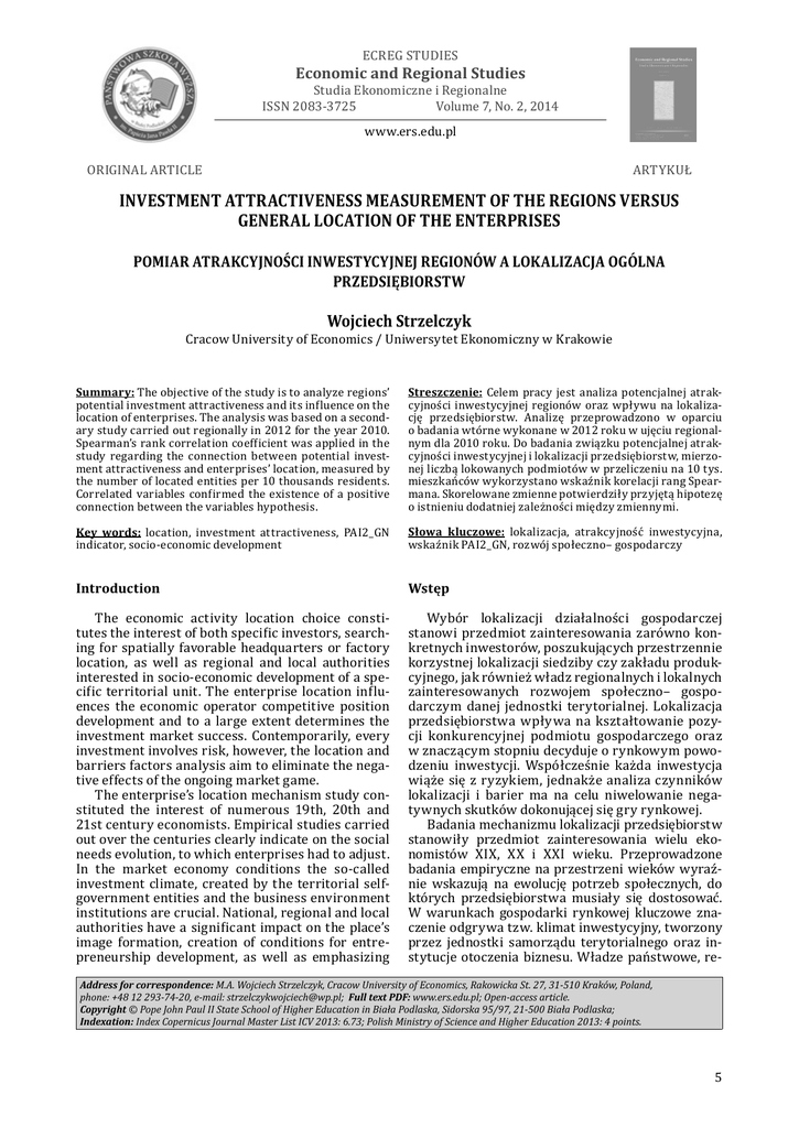 ECREG STUDIES Economic and Regional Studies Studia Ekonomiczne i Regionalne ISSN 2083-3725 Volume 7, No. 2, 2014 ORIGINAL ARTICLE www.ers.edu.pl ARTYKUŁ INVESTMENT ATTRACTIVENESS MEASUREMENT OF THE REGIONS VERSUS GENERAL LOCATION OF THE ENTERPRISES POMIAR ATRAKCYJNOŚCI INWESTYCYJNEJ REGIONÓW A LOKALIZACJA OGÓLNA PRZEDSIĘBIORSTW Wojciech Strzelczyk Cracow University of Economics / Uniwersytet Ekonomiczny w Krakowie Summary: The objective of the study is to analyze regions’ potential investment attractiveness and its influence on the location of enterprises. The analysis was based on a secondary study carried out regionally in 2012 for the year 2010. Spearman’s rank correlation coefficient was applied in the study regarding the connection between potential investment attractiveness and enterprises’ location, measured by the number of located entities per 10 thousands residents. Correlated variables confirmed the existence of a positive connection between the variables hypothesis. Streszczenie: Celem pracy jest analiza potencjalnej atrakcyjności inwestycyjnej regionów oraz wpływu na lokalizację przedsiębiorstw. Analizę przeprowadzono w oparciu o badania wtórne wykonane w 2012 roku w ujęciu regionalnym dla 2010 roku. Do badania związku potencjalnej atrakcyjności inwestycyjnej i lokalizacji przedsiębiorstw, mierzonej liczbą lokowanych podmiotów w przeliczeniu na 10 tys. mieszkańców wykorzystano wskaźnik korelacji rang Spearmana. Skorelowane zmienne potwierdziły przyjętą hipotezę o istnieniu dodatniej zależności między zmiennymi. Introduction Wstęp Key words: location, investment attractiveness, PAI2_GN indicator, socio-economic development The economic activity location choice constitutes the interest of both specific investors, searching for spatially favorable headquarters or factory location, as well as regional and local authorities interested in socio-economic development of a specific territorial unit. The enterprise location influences the economic operator competitive position development and to a large extent determines the investment market success. Contemporarily, every investment involves risk, however, the location and barriers factors analysis aim to eliminate the negative effects of the ongoing market game. The enterprise’s location mechanism study constituted the interest of numerous 19th, 20th and 21st century economists. Empirical studies carried out over the centuries clearly indicate on the social needs evolution, to which enterprises had to adjust. In the market economy conditions the so-called investment climate, created by the territorial selfgovernment entities and the business environment institutions are crucial. National, regional and local authorities have a significant impact on the place’s image formation, creation of conditions for entrepreneurship development, as well as emphasizing Słowa kluczowe: lokalizacja, atrakcyjność inwestycyjna, wskaźnik PAI2_GN, rozwój społeczno– gospodarczy Wybór lokalizacji działalności gospodarczej stanowi przedmiot zainteresowania zarówno konkretnych inwestorów, poszukujących przestrzennie korzystnej lokalizacji siedziby czy zakładu produkcyjnego, jak również władz regionalnych i lokalnych zainteresowanych rozwojem społeczno– gospodarczym danej jednostki terytorialnej. Lokalizacja przedsiębiorstwa wpływa na kształtowanie pozycji konkurencyjnej podmiotu gospodarczego oraz w znaczącym stopniu decyduje o rynkowym powodzeniu inwestycji. Współcześnie każda inwestycja wiąże się z ryzykiem, jednakże analiza czynników lokalizacji i barier ma na celu niwelowanie negatywnych skutków dokonującej się gry rynkowej. Badania mechanizmu lokalizacji przedsiębiorstw stanowiły przedmiot zainteresowania wielu ekonomistów XIX, XX i XXI wieku. Przeprowadzone badania empiryczne na przestrzeni wieków wyraźnie wskazują na ewolucję potrzeb społecznych, do których przedsiębiorstwa musiały się dostosować. W warunkach gospodarki rynkowej kluczowe znaczenie odgrywa tzw. klimat inwestycyjny, tworzony przez jednostki samorządu terytorialnego oraz instytucje otoczenia biznesu. Władze państwowe, re- Address for correspondence: M.A. Wojciech Strzelczyk, Cracow University of Economics, Rakowicka St. 27, 31-510 Kraków, Poland, phone: +48 12 293-74-20, e-mail: [email protected]; Full text PDF: www.ers.edu.pl; Open-access article. Copyright © Pope John Paul II State School of Higher Education in Biała Podlaska, Sidorska 95/97, 21-500 Biała Podlaska; Indexation: Index Copernicus Journal Master List ICV 2013: 6.73; Polish Ministry of Science and Higher Education 2013: 4 points. 5 ECREG STUDIES, Vol. 7, No 2, 2014, Investment attractiveness measurement... spatial and tax location benefits. State and territorial self-governments here constitute the demand side of the market offer location potential, which forms investment attractiveness. On the other side, the entrepreneurs, who represent the market’s demand side as information recipients and investment analysts decide on the effective location over a long period of time. A significant connection between the regions investment attractiveness and economic operator’s location is being outlined in this context. The main article’s objective is to examine the regions investment attractiveness interdependence and the enterprises general location in 2010 measured by the number of economic operators registered in REGON (National Business Registry Number in Poland). The main focus will be on the verification of hypotheses which can be formulated in the following way: strong connection exists between the provinces potential investment attractiveness, emphasizing location values and the number of enterprises located on the territory of individual provinces. The study is focused on the general location, i.e. economic operator positioning on the territories of provinces for example, irrespective of specific plot location values. Locati