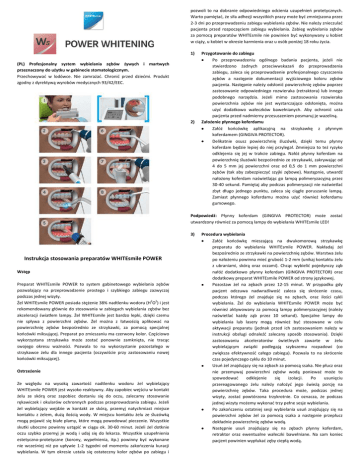 pozwoli to na dobranie odpowiedniego odcienia uzupełnień protetycznych. Warto pamiętać, że siła adhezji wszystkich pracy może być zmniejszona przez 2-3 dni po przeprowadzeniu zabiegu wybielania zębów. Nie należy znieczulać pacjenta przed rozpoczęciem zabiegu wybielania. Zabieg wybielania zębów za pomocą preparatów WHITEsmile nie powinien być wykonywany u kobiet w ciąży, u kobiet w okresie karmienia oraz u osób poniżej 18 roku życia. 1) (PL) Profesjonalny system wybielania zębów żywych i martwych przeznaczony do użytku w gabinecie stomatologicznym. Przechowywać w lodówce. Nie zamrażać. Chronić przed dziećmi. Produkt zgodny z dyrektywą wyrobów medycznych 93/42/EEC. 2) Przygotowanie do zabiegu Po przeprowadzeniu ogólnego badania pacjenta, jeżeli nie stwierdzono żadnych przeciwwskazań do przeprowadzenia zabiegu, zaleca się przeprowadzenie profesjonalnego czyszczenia zębów a następnie dokumentacji wyjściowego koloru zębów pacjenta. Następnie należy odsłonić powierzchnię zębów poprzez zastosowanie odpowiedniego rozwieraka (retraktora) lub innego podobnego narzędzia. Jeżeli mimo zastosowania rozwieraka powierzchnia zębów nie jest wystarczająco odsłonięta, można użyć dodatkowo wałeczków bawełnianych. Aby ochronić usta pacjenta przed nadmierny przesuszeniem posmaruj je wazeliną. Założenie płynnego koferdamu Załóż końcówkę aplikacyjną na strzykawkę z płynnym koferdamem (GINGIVA PROTECTOR). Delikatnie osusz powierzchnię śluzówki, dzięki temu płynny koferdam będzie lepiej do niej przylegał. Zmniejsza to też ryzyko odklejenia się jej w trakcie zabiegu. Nałóż płynny koferdam na powierzchnię śluzówki bezpośrednio ze strzykawki, zakrywając od 4 do 5 mm jej powierzchni oraz od 0,5 do 1 mm powierzchni zębów (tak aby zabezpieczyć szyjki zębowe). Następnie, utwardź nałożony koferdam naświetlając go lampą polimeryzacyjną przez 30-40 sekund. Pamiętaj aby podczas polimeryzacji nie naświetlać zbyt długo jednego punktu, zaleca się ciągłe poruszanie lampą. Zamiast płynnego koferdamu można użyć również koferdamu gumowego. Podpowiedź: Płynny koferdam (GINGIVA PROTECTOR) może zostać utwardzony również za pomocą lampy do wybielania WHITEsmile LED! 3) Instrukcja stosowania preparatów WHITEsmile POWER Wstęp Preparat WHITEsmile POWER to system gabinetowego wybielania zębów pozwalający na przeprowadzenie prostego i szybkiego zabiegu zazwyczaj podczas jednej wizyty. Żel WHITEsmile POWER posiada stężenie 38% nadtlenku wodoru (H2O2) i jest rekomendowany głównie do stosowania w zabiegach wybielania zębów bez akceleracji światłem lampy. Żel WHITEsmile jest bardzo lepki, dzięki czemu nie spływa z powierzchni zębów. Żel można z łatwością aplikować na powierzchnię zębów bezpośrednio ze strzykawki, za pomocą specjalnej końcówki miksującej. Preparat po zmieszaniu ma czerwony kolor. Częściowo wykorzystana strzykawka może zostać ponownie zamknięta, nie tracąc swojego okresu ważności. Pozwala to na wykorzystanie pozostałego w strzykawce żelu dla innego pacjenta (oczywiście przy zastosowaniu nowej końcówki miksującej). Ostrzeżenie Ze względu na wysoką zawartość nadtlenku wodoru żel wybielający WHITEsmile POWER jest wysoko reaktywny. Aby zapobiec wejściu w kontakt żelu ze skórą oraz zapobiec dostaniu się do oczu, zalecamy stosowanie rękawiczek i okularów ochronnych podczas przeprowadzania zabiegu. Jeżeli żel wybielający wejdzie w kontakt ze skórą, przemyj natychmiast miejsce kontaktu z żelem, dużą ilością wody. W miejscu kontaktu żelu ze śluzówką mogą pojawić się białe plamy, które mogą powodować pieczenie. Wszystkie skutki uboczne powinny ustąpić w ciągu ok. 30-60 minut. Jeżeli żel dotknie oczu szybko przemyj je wodą i udaj się do lekarza. Wszystkie uzupełnienia estetyczno-protetyczne (korony, wypełnienia, itp.) powinny być wykonane nie wcześniej niż po upływie 1-2 tygodni od momentu zakończenia kuracji wybielania. W tym okresie ustala się ostateczny kolor zębów po zabiegu i Procedura wybielania Załóż końcówkę mieszającą na dwukomorową strzykawkę preparatu do wybielania WHITEsmile POWER. Nakładaj żel bezpośrednio ze strzykawki na powierzchnię zębów. Warstwa żelu po nałożeniu powinna mieć grubość 1-2 mm (unikaj kontaktu żelu z ubraniami, skórą oraz oczami). Chcąc wybielić pojedynczy ząb nałóż dodatkowo płynny koferdam (GINGIVA PROTECTOR) oraz dodatkowy preparat WHITEsmile POWER od strony językowej. Pozostaw żel na zębach przez 12-15 minut. W przypadku gdy pacjent odczuwa nadwrażliwość zaleca się skrócenie czasu, podczas którego żel znajduje się na zębach, oraz ilości cykli wybielania. Żel do wybielania WHITEsmile POWER może być również aktywowany za pomocą lampy polimeryzacyjnej (należy naświetlać każdy ząb przez 10 sekund). Specjalne lampy do wybielania lub lasery mogą również być stosowane w celu aktywacji preparatu (jednak przed ich zastosowaniem należy w instrukcji obsługi odnaleźć zalecany sposób stosowania). Dzięki zastosowaniu akceleratorów świetlnych zawarte w żelu wybielającym związki podlegają szybszemu rozpadowi (co zwiększa efektywność całego zabiegu). Pozwala to na skrócenie czas pojedynczego cyklu do 10 minut. Usuń żel znajdujący się na zębach za pomocą ssaka. Nie płucz oraz nie przemywaj powierzchni zębów wodą ponieważ może to spowodować odklejenie się izolacji. Po usunięciu przereagowanego żelu należy nałożyć jego świeżą porcję na powierzchnię zębów. Taka procedura może, podczas jednej wizyty, zostać powtórzona trzykrotnie. Co oznacza, że podczas jednej wizyty możemy wykonać trzy pełne sesje wybielania. Po zakończeniu ostatniej sesji wybielania usuń znajdujący się na powierzchni zębów żel za pomocą ssaka a następnie przepłucz dokładnie powierzchnię zębów wodą. Następnie