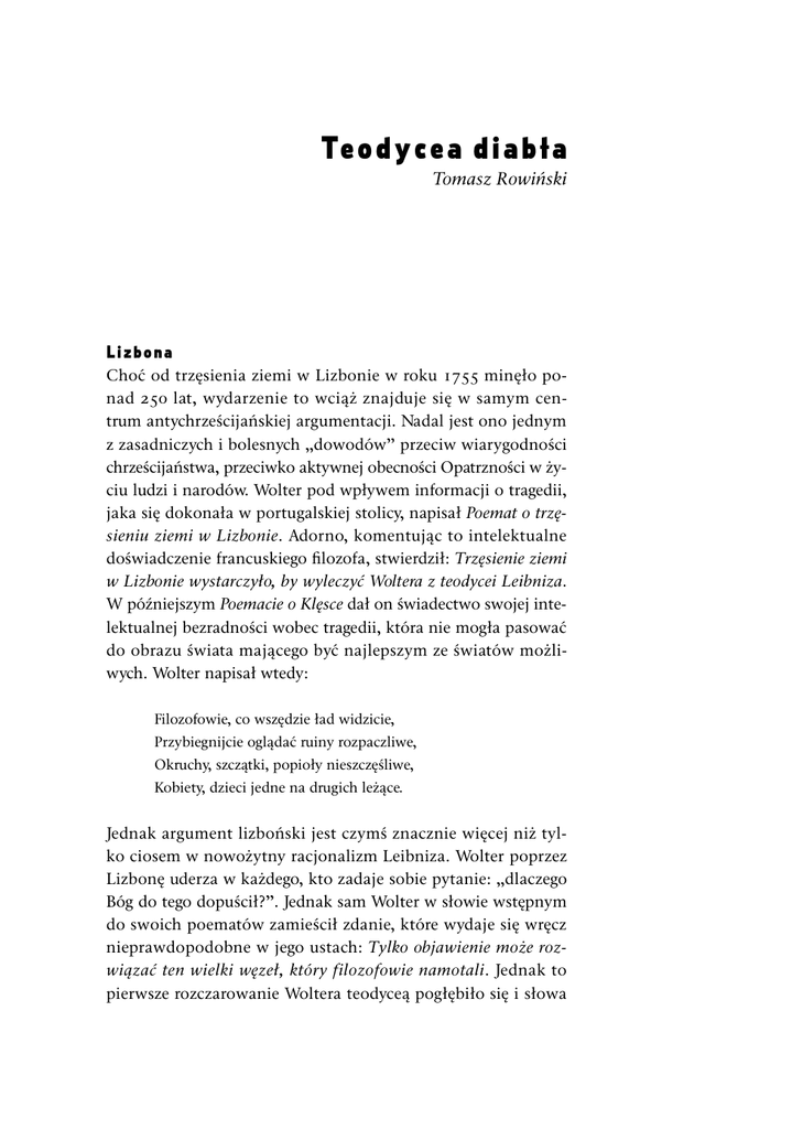 Te o d y c e a d i a b ł a Tomasz Rowiński Lizbona Choć od trzęsienia ziemi w Lizbonie w roku 1755 minęło ponad 250 lat, wydarzenie to wciąż znajduje się w samym centrum antychrześcijańskiej argumentacji. Nadal jest ono jednym z zasadniczych i bolesnych „dowodów” przeciw wiarygodności chrześcijaństwa, przeciwko aktywnej obecności Opatrzności w życiu ludzi i narodów. Wolter pod wpływem informacji o tragedii, jaka się dokonała w portugalskiej stolicy, napisał Poemat o trzęsieniu ziemi w Lizbonie. Adorno, komentując to intelektualne doświadczenie francuskiego filozofa, stwierdził: Trzęsienie ziemi w Lizbonie wystarczyło, by wyleczyć Woltera z teodycei Leibniza. W późniejszym Poemacie o Klęsce dał on świadectwo swojej intelektualnej bezradności wobec tragedii, która nie mogła pasować do obrazu świata mającego być najlepszym ze światów możliwych. Wolter napisał wtedy: Filozofowie, co wszędzie ład widzicie, Przybiegnijcie oglądać ruiny rozpaczliwe, Okruchy, szczątki, popioły nieszczęśliwe, Kobiety, dzieci jedne na drugich leżące. Jednak argument lizboński jest czymś znacznie więcej niż tylko ciosem w nowożytny racjonalizm Leibniza. Wolter poprzez Lizbonę uderza w każdego, kto zadaje sobie pytanie: „dlaczego Bóg do tego dopuścił?”. Jednak sam Wolter w słowie wstępnym do swoich poematów zamieścił zdanie, które wydaje się wręcz nieprawdopodobne w jego ustach: Tylko objawienie może rozwiązać ten wielki węzeł, który filozofowie namotali. Jednak to pierwsze rozczarowanie Woltera teodyceą pogłębiło się i słowa 86 Christianitas 52/2013 ODCIELEŚNIENIE o objawieniu szybko poszły w niepamięć. Przekonanie wzięte od Leibniza, że świat jest tylko układem matematycznym, systemem mechanicznym, w którym jego Stwórca dąży do maksymalizacji dobrych zdarzeń i minimalizacji obecności złych, doprowadziło do specyficznej konwersji Woltera. Opisał ją Rousseau w swoich Wyznaniach: Wolter, zdając się wciąż wierzyć w Boga, w rzeczywistości zawsze wierzył tylko w diabła, gdyż swojego Boga uważał za złośliwego ducha, który jego zdaniem znajduje przyjemność jedynie w tym, by szkodzić. I tak Wolter porzucił myśl, że świat stworzony może być dobry w jakimkolwiek sensie. To, co w świecie widzialne, nie zdało egzaminu wysokiej duchowości. Czas dojrzał do rewolucji. Wolter i diabeł Wolter znalazł dziś jednak adwersarza, który mówi staremu antyklerykałowi prosto i bez ogródek: W całej swojej krytyce Wolter nie wspomniał o udziale diabła […]. Zapomnieć o diable, by myśleć tylko o złu, to nieświadomie zacząć wierzyć tylko w diabła. O wydarzeniu tym [trzęsieniu ziemi w Lizbonie – przyp. T. R.] i śladzie, który pozostawił w myśleniu, wspomniałem właśnie dlatego, że widać w nim wyraźnie pazur eksperta. Demon kryje się za kataklizmem. Lecz krył się także za teodyceą. I znajdziemy go również w jej negacji. To on zasugerował racjonalistyczne wytłumaczenie Boga, takie, które wymagałoby już tylko […] całkowitego zamknięcia się na otchłań Krzyża. To on skoordynował wściekłe ataki żywiołów i drobne ludzkie zaniedbania, by osiągnąć klęskę, jakoby naturalną, która miałaby zanegować pierwotną zasadę. To on wreszcie, niszcząc wiarę w Opatrzność, skłonił człowieka do całkowitego wzięcia na siebie sprawy swojego zbawienia. Optymizm teodycei, pesymizm antyteodycei, progresizm ateizmu (albo jeszcze racjonalizm deizmu, fideizm irracjonalizmu, niewiara racjonalizmu), wstrząs koszmaru i błędu pozwoliły mu prowadzić rozgrywkę, włączając do gry wszystkie karty. Ratunek i niebezpieczeństwo Słowa te pochodzą z książki Wiara demonów Fabrice’a Hadjadja – głośnej we Francji, nie tylko w świecie katolickim. Autor, jak mówi o sobie, jest Żydem o arabskim nazwisku katolickiego wyznania. Jednak nie interesuje go składanie pocieszających 87 To m a s z R o w i ń s k i Te o d y c e a d i a b ł a świadectw wiary, do tego powinien być jeszcze narkomanem, homoseksualistą, płatnym mordercą czy choćby aktorem w filmie porno – z drewnianą nogą [...]. Jego świadectwo powinno okazać się na tyle atrakcyjne, by – jak pisze – czytelnicy nie żałowali, że zrezygnowali z wieczornego wyjścia do kina – ironizuje. Interesuje go diagnoza kondycji współczesnego człowieka oraz dzisiejszego stanu cywilizacji wywodzącej się z chrześcijaństwa. Interesuje go też Bóg i diabeł. Wydana niedawno w Polsce Wiara demonów jest pierwszą odsłoną rozważań, jakie Hadjadj prowadzi także w innych swoich pracach. Hadjadj w Wierze demonów porusza się po krawędzi tematów niebezpiecznych i ma tego świadomość, gdy przywołuje fragment z Hölderlina: Gdzie jest ratunek, Wzrasta także Niebezpieczeństwo1. 1 Lecz gdzie jest niebezpieczeństwo, / Rośnie Niebezpieczeństwo, jakie podejmuje, polega na tym, że wychodzi on poza proste oraz wygodne rozróżnienie na wierzących i ateistów i zmierza w kierunku nowego opisania postaw wobec wiary. Poza wiernymi, którzy znaleźli Boga i jemu służą, ateistami, którzy Boga nie znaleźli lub wciąż Go szukają, i ateistami, którzy Boga nie znaleźli, ale go nie szukają, są jeszcze tacy, którzy Boga znaleźli, a mimo to Bogu nie służą. Postawa ta zagraża każdemu z nas, wierzących, ale jest przecież doskonale analogiczna do tytułowej wiary demonów, które także wierzą i… drżą. Hadjadj przytacza w tym kontekście słowa przypisywane opatowi cysterskiemu Arnaudowi Amaury’emu z czasów krucjaty przeciwko katarom: Zabijajcie wszystkich, Bóg rozpozna swoich. Zaraz jednak dodaje, że bylibyśmy w błędzie, gdybyśmy diabła widzieli tylko po stronie katolickiej: Otóż ten spryciarz jest w obu obozach. Diabeł doskonale wie, że nie stworzył świata widzialnego, wie, że ciało jest z natury dobre [co wprost negowali albigensi – przyp. T. R.], że Kośció