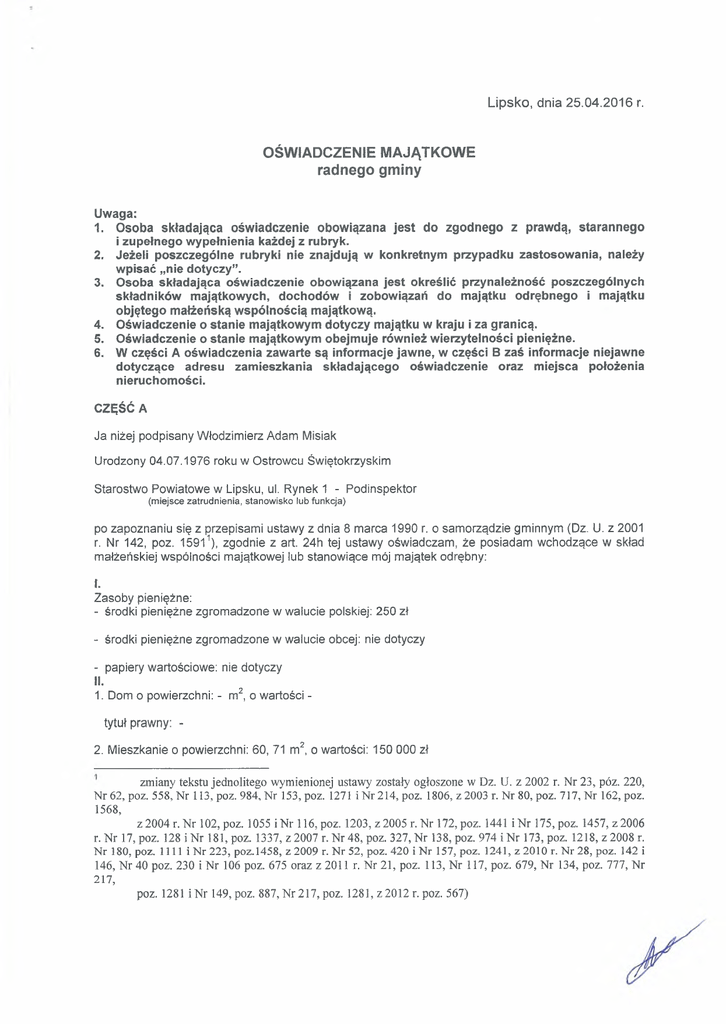 Lipsko, dnia 25.04.2016 r. OŚWIADCZENIE MAJĄTKOWE radnego gminy Uwaga: 1. Osoba składająca oświadczenie obowiązana jest do zgodnego z prawdą, starannego i zupełnego wypełnienia każdej z rubryk. 2. Jeżeli poszczególne rubryki nie znajdują w konkretnym przypadku zastosowania, należy wpisać „nie dotyczy”. 3. Osoba składająca oświadczenie obowiązana jest określić przynależność poszczególnych składników majątkowych, dochodów i zobowiązań do majątku odrębnego i majątku objętego małżeńską wspólnością majątkową. 4. Oświadczenie o stanie majątkowym dotyczy majątku w kraju i za granicą. 5. Oświadczenie o stanie majątkowym obejmuje również wierzytelności pieniężne. 6. W części A oświadczenia zawarte są informacje jawne, w części B zaś informacje niejawne dotyczące adresu zamieszkania składającego oświadczenie oraz miejsca położenia nieruchomości. CZĘŚĆ A Ja niżej podpisany Włodzimierz Adam Misiak Urodzony 04.07.1976 roku w Ostrowcu Świętokrzyskim Starostwo Powiatowe w Lipsku, ul. Rynek 1 - Podinspektor (miejsce zatrudnienia, stanowisko lub funkcja) po zapoznaniu się z przepisami ustawy z dnia 8 marca 1990 r. o samorządzie gminnym (Dz. U. z 2001 r. Nr 142, poz. 15911), zgodnie z art. 24h tej ustawy oświadczam, że posiadam wchodzące w skład małżeńskiej wspólności majątkowej lub stanowiące mój majątek odrębny: r. Zasoby pieniężne: - środki pieniężne zgromadzone w walucie polskiej: 250 zł - środki pieniężne zgromadzone w walucie obcej: nie dotyczy - papiery wartościowe: nie dotyczy II. 1. Dom o powierzchni: - m2, o wartości tytuł prawny: 2. Mieszkanie o powierzchni: 60, 71 m2, o wartości: 150 000 zł zmiany tekstu jednolitego wymienionej ustawy zostały ogłoszone w Dz. U. z 2002 r. Nr 23, póz. 220, Nr 62, poz. 558, Nr 113, poz. 984, Nr 153, poz. 1271 i Nr 214, poz. 1806, z 2003 r. Nr 80, poz. 717, Nr 162, poz. 1568, z 2004 r. Nr 102, poz. 1055 i Nr 116, poz. 1203, z 2005 r. Nr 172, poz. 1441 i Nr 175, poz. 1457, z 2006 r. Nr 17, poz. 128 i Nr 181, poz. 1337, z 2007 r. Nr 48, poz. 327, Nr 138, poz. 974 i Nr 173, poz. 1218, z 2008 r. N r 180, poz. 1111 i N r 223, poz.1458, z 2009 r. N r 52, poz. 420 i N r 157, poz. 1241, z 2010 r. N r 28, poz. 142 i 146, Nr 40 poz. 230 i Nr 106 poz. 675 oraz z 2011 r. Nr 21, poz. 113, Nr 117, poz. 679, Nr 134, poz. 777, Nr 217, poz. 1281 iN r 149, poz. 887,N r 217, poz. 1281,z2012r. poz. 567) tytuł prawny: współwłasność małżeńska - Akt notarialny Rep A nr 485/2008 3. Gospodarstwo rolne: rodzaj gospodarstwa: roino-sadownicze, powierzchnia: 6,55 ha o wartości: 180 000 zł rodzaj zabudowy: zabudowa zagrodowa drewniano-murowana tytuł prawny: współwłasność małżeńska - akt not. nr 789/2002; 2057/2012; 1422/2013; 2030/2013; 424/2014 Z tego tytułu osiągnąłem w roku ubiegłym przychód i dochód w wysokości: przychód 8500 zł, dochód 5500 zł. 4. Inne nieruchomości; powierzchnia: garaż murowany - powierzchnia zabudowy 19 m2o wartości 15 000 zł. tytuł prawny: współwłasność małżeńska - akt notarialny nr 2751/2009 III. 1. Posiadam udziały w spółkach handlowych z udziałem gminnych osób prawnych lub przedsiębiorców, w których uczestniczą takie osoby - należy podać liczbę i emitenta udziałów: nie dotyczy udziały te stanowią pakiet większy niż 10 % udziałów w spółce: nie dotyczy Z tego tytułu osiągnąłem w roku ubiegłym dochód w wysokości: nie dotyczy 2. Posiadam udziały w innych spółkach handlowych - należy podać liczbę i emitenta udziałów:...... Nie dotyczy Z tego tytułu osiągnąłem w roku ubiegłym dochód w wysokości: nie dotyczy IV. 1. Posiadam akcje w spółkach handlowych z udziałem gminnych osób prawnych lub przedsiębiorców, w których uczestniczą takie osoby - należy podać liczbę i emitenta akcji: nie dotyczy akcje te stanowią pakiet większy niż 10 % akcji w spółce: nie dotyczy Z tego tytułu osiągnąłem w roku ubiegłym dochód w wysokości: nie dotyczy 2. Posiadam akcje w innych spółkach handlowych - należy podać liczbę i emitenta a k c ji:................. nie dotyczy Z tego tytułu osiągnąłem w roku ubiegłym dochód w wysokości: nie dotyczy V. Nabyłem (nabył mój małżonek, z wyłączeniem mienia przynależnego do jego majątku odrębnego) od Skarbu Państwa, innej państwowej osoby prawnej, jednostki samorządu terytorialnego, ich związków lub od komunalnej osoby prawnej następujące mienie, które podlegało zbyciu w drodze przetargu należy podać opis mienia i datę nabycia, od kogo: nie dotyczy VI. 1. Prowadzę działalność gospodarczą (należy podać formę prawną i przedmiot działalności):........... - osobiście - nie dotyczy - wspólnie z innymi osobami - nie dotyczy Z tego tytułu osiągnąłem w roku ubiegłym przychód i dochód w wysokości: nie dotyczy 2. Zarządzam działalnością gospodarczą lub jestem przedstawicielem, pełnomocnikiem takiej działalności (należy podać formę prawną i przedmiot działalności):.................................................. - osobiście - nie dotyczy - wspólnie z innymi osobami - nie dotyczy Z tego tytułu osiągnąłem w roku ubiegłym dochód w wysokości: nie dotyczy VII. W spółkach handlowych (nazwa, siedziba spółki): nie dotyczy - jestem członkiem zarządu (od kiedy): nie dotyczy - jestem członkiem rady nadzorczej (od kiedy): nie dotyczy jestem członkiem komisji rewizyjnej (od kiedy): nie dotyczy Z tego tytułu osiągnąłem w roku ubiegłym dochód w wysokości: nie dotyczy VIII. Inne dochody osiągane z tytułu zatrudnienia lub innej działalności zarobkowej lub zajęć, z podaniem kwot uzyskiwanych z każdego tytułu: Zaliczka dopłaty bezpośredniej z ARiMR - 1750,04 zł Dieta radnego Rady Miejskiej - 6385,32 zł. Dochód z tytułu zatrudnienia w Starostwie Powiatowym w Lipsku - 31235,06 zł Dochód z tytułu pełnienia funkcji członka Rady Nadzorczej w Spółdzielni Mieszk