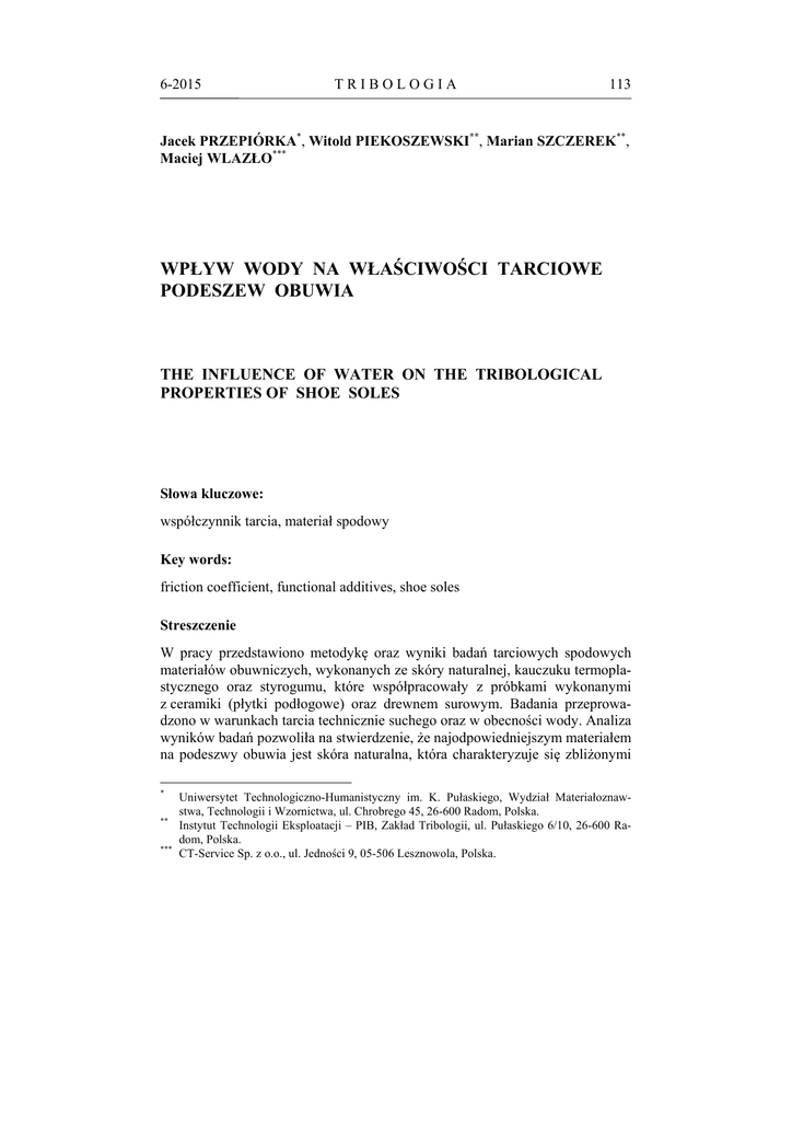 WPŁYW WODY NA WŁAŚCIWOŚCI TARCIOWE PODESZEW OBUWIA