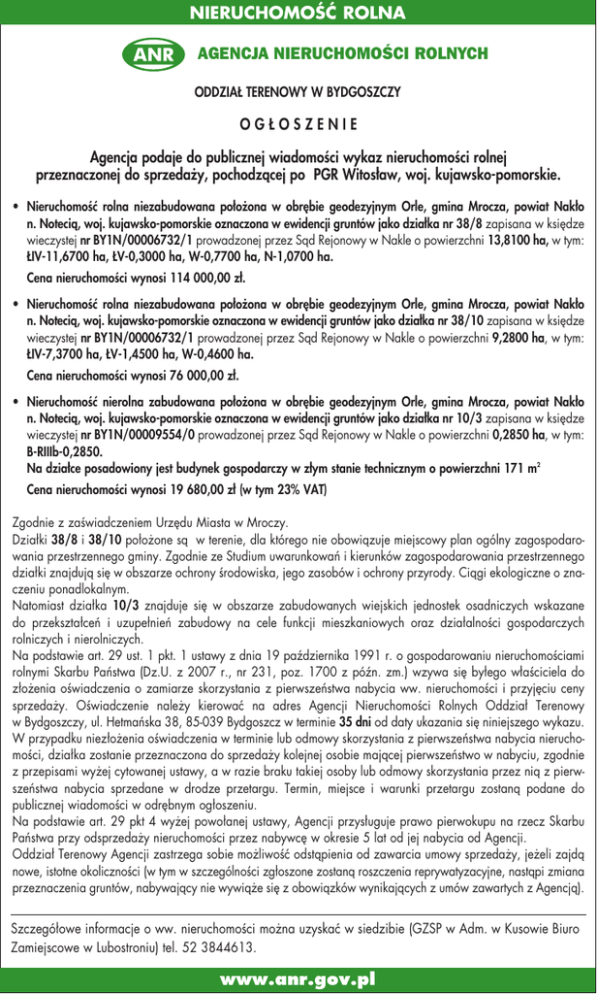 NIERUCHOMOŚĆ ROLNA AGENCJA NIERUCHOMOÂCI ROLNYCH ODDZIAŁ TERENOWY W BYDGOSZCZY OGŁOSZENIE Agencja podaje do publicznej wiadomości wykaz nieruchomości rolnej przeznaczonej do sprzedaży, pochodzącej po PGR Witosław, woj. kujawsko-pomorskie. • Nieruchomość rolna niezabudowana położona w obrębie geodezyjnym Orle, gmina Mrocza, powiat Nakło n. Notecią, woj. kujawsko-pomorskie oznaczona w ewidencji gruntów jako działka nr 38/8 zapisana w księdze wieczystej nr BY1N/00006732/1 prowadzonej przez Sąd Rejonowy w Nakle o powierzchni 13,8100 ha, w tym: ŁIV-11,6700 ha, ŁV-0,3000 ha, W-0,7700 ha, N-1,0700 ha. Cena nieruchomości wynosi 114 000,00 zł. • Nieruchomość rolna niezabudowana położona w obrębie geodezyjnym Orle, gmina Mrocza, powiat Nakło n. Notecią, woj. kujawsko-pomorskie oznaczona w ewidencji gruntów jako działka nr 38/10 zapisana w księdze wieczystej nr BY1N/00006732/1 prowadzonej przez Sąd Rejonowy w Nakle o powierzchni 9,2800 ha, w tym: ŁIV-7,3700 ha, ŁV-1,4500 ha, W-0,4600 ha. Cena nieruchomości wynosi 76 000,00 zł. • Nieruchomość nierolna zabudowana położona w obrębie geodezyjnym Orle, gmina Mrocza, powiat Nakło n. Notecią, woj. kujawsko-pomorskie oznaczona w ewidencji gruntów jako działka nr 10/3 zapisana w księdze wieczystej nr BY1N/00009554/0 prowadzonej przez Sąd Rejonowy w Nakle o powierzchni 0,2850 ha, w tym: B-RIIIb-0,2850. Na działce posadowiony jest budynek gospodarczy w złym stanie technicznym o powierzchni 171 m2 Cena nieruchomości wynosi 19 680,00 zł (w tym 23% VAT) Zgodnie z zaświadczeniem Urzędu Miasta w Mroczy. Działki 38/8 i 38/10 położone są w terenie, dla którego nie obowiązuje miejscowy plan ogólny zagospodarowania przestrzennego gminy. Zgodnie ze Studium uwarunkowań i kierunków zagospodarowania przestrzennego działki znajdują się w obszarze ochrony środowiska, jego zasobów i ochrony przyrody. Ciągi ekologiczne o znaczeniu ponadlokalnym. Natomiast działka 10/3 znajduje się w obszarze zabudowanych wiejskich jednostek osadniczych wskazane do przekształceń i uzupełnień zabudowy na cele funkcji mieszkaniowych oraz działalności gospodarczych rolniczych i nierolniczych. Na podstawie art. 29 ust. 1 pkt. 1 ustawy z dnia 19 października 1991 r. o gospodarowaniu nieruchomościami rolnymi Skarbu Państwa (Dz.U. z 2007 r., nr 231, poz. 1700 z późn. zm.) wzywa się byłego właściciela do złożenia oświadczenia o zamiarze skorzystania z pierwszeństwa nabycia ww. nieruchomości i przyjęciu ceny sprzedaży. Oświadczenie należy kierować na adres Agencji Nieruchomości Rolnych Oddział Terenowy w Bydgoszczy, ul. Hetmańska 38, 85-039 Bydgoszcz w terminie 35 dni od daty ukazania się niniejszego wykazu. W przypadku niezłożenia oświadczenia w terminie lub odmowy skorzystania z pierwszeństwa nabycia nieruchomości, działka zostanie przeznaczona do sprzedaży kolejnej osobie mającej pierwszeństwo w nabyciu, zgodnie z przepisami wyżej cytowanej ustawy, a w razie braku takiej osoby lub odmowy skorzystania przez nią z pierwszeństwa nabycia sprzedane w drodze przetargu. Termin, miejsce i warunki przetargu zostaną podane do publicznej wiadomości w odrębnym ogłoszeniu. Na podstawie art. 29 pkt 4 wyżej powołanej ustawy, Agencji przysługuje prawo pierwokupu na rzecz Skarbu Państwa przy odsprzedaży nieruchomości przez nabywcę w okresie 5 lat od jej nabycia od Agencji. Oddział Terenowy Agencji zastrzega sobie możliwość odstąpienia od zawarcia umowy sprzedaży, jeżeli zajdą nowe, istotne okoliczności (w tym w szczególności zgłoszone zostaną roszczenia reprywatyzacyjne, nastąpi zmiana przeznaczenia gruntów, nabywający nie wywiąże się z obowiązków wynikających z umów zawartych z Agencją). Szczegółowe informacje o ww. nieruchomości można uzyskać w siedzibie (GZSP w Adm. w Kusowie Biuro Zamiejscowe w Lubostroniu) tel. 52 3844613. www.anr.gov.pl