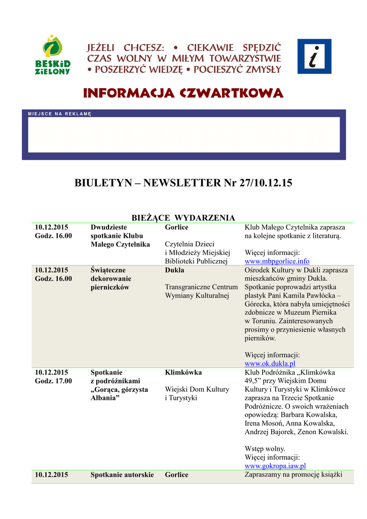 INFORMACJA CZWARTKOWA BIULETYN – NEWSLETTER Nr 27/10.12.15 BIEŻĄCE WYDARZENIA 10.12.2015 Godz. 16.00 10.12.2015 Godz. 16.00 10.12.2015 Godz. 17.00 10.12.2015 Dwudzieste spotkanie Klubu Małego Czytelnika Świąteczne dekorowanie pierniczków Spotkanie z podróżnikami „Gorąca, górzysta Albania” Spotkanie autorskie Gorlice Klub Małego Czytelnika zaprasza na kolejne spotkanie z literaturą. Czytelnia Dzieci i Młodzieży Miejskiej Biblioteki Publicznej Dukla Więcej informacji: www.mbpgorlice.info Ośrodek Kultury w Dukli zaprasza mieszkańców gminy Dukla. Transgraniczne Centrum Spotkanie poprowadzi artystka Wymiany Kulturalnej plastyk Pani Kamila Pawłócka – Górecka, która nabyła umiejętności zdobnicze w Muzeum Piernika w Toruniu. Zainteresowanych prosimy o przyniesienie własnych pierników. Klimkówka Wiejski Dom Kultury i Turystyki Gorlice Więcej informacji: www.ok.dukla.pl Klub Podróżnika „Klimkówka 49,5” przy Wiejskim Domu Kultury i Turystyki w Klimkówce zaprasza na Trzecie Spotkanie Podróżnicze. O swoich wrażeniach opowiedzą: Barbara Kowalska, Irena Mosoń, Anna Kowalska, Andrzej Bajorek, Zenon Kowalski. Wstęp wolny. Więcej informacji: www.gokropa.iaw.pl Zapraszamy na promocję książki Godz. 18.00 11.12.2015 Godz. 17.00 11.12.2015 Godz. 17.00 11.12.2015 Godz. 18.00 „Architekci i Historia” Spotkanie autorskie z Krzysztofem Gomołą Wieczór poetycki „Pieśń o słońcu niewyczerpanym” Teatralna Jesień – „Mayday” Sala „Pod Sową” Miejskiej Biblioteki Publicznej Biecz Czytelnia Miejskiej i Gminnej Biblioteki Publicznej Dukla Sala Widowiskowa Jasło Jasielski Dom Kultury 11.12.2015 Godz. 18.30 od: 11.12.2015 do: 15.12.2015 12.12.2015 Godz. 9.00 7 Międzynarodowy Koncert Pieśni Religijnej Projekcja filmu „Święty Mikołaj dla wszystkich” Warsztaty Psychoedukacyjne Gorlice Bazylika Mniejsza pw. Narodzenia NMP Biecz Kino „Farys” Jasło oraz spotkanie autorskie z Januszem Sepiołem. Więcej informacji: www.mbpgorlice.info Dyrektor Miejskiej i Gminnej Biblioteki Publicznej w Bieczu zaprasza na spotkanie autorskie z Krzysztofem Gomołą oraz promocję tomiku poezji „Wiatr”. Więcej informacji: www.biblioteka.biecz.pl Ośrodek Kultury w Dukli oraz Konrad Sikora zapraszają na Inaugurację Wieczorów Poetyckich „Dukielskiego Salonu Poetyckiego”. Więcej informacji: www.ok.dukla.pl Zapraszamy do obejrzenia komedii „Mayday”. W sztuce zagrają: Alina Kamińska, Katarzyna Litwin, Krzysztof Bochenek/Łukasz Żurek/Maciej Słota, Bogdan Grzybowicz, Paweł Sanakiewicz, Maciej Słota/Przemysław Redkowski/Adam Szarek, Małgorzata Piskorz/Anna Rokita. Wstęp: 70zł. Więcej informacji: www.terazjaslo.pl Gorlickie Centrum Kultury oraz Chór Kameralny GCK „Belfersingers” zapraszają. Wystąpią m.in. chóry z Polski, Słowacji oraz Słowenii. Wstęp wolny. Więcej informacji: www.gck.gorlice.pl Kino "Farys" w Bieczu zaprasza na bajkę "Święty Mikołaj dla wszystkich". Wstęp: 10zł. Więcej informacji: www.biecz.pl Pracownia Profilaktyczno – Wychowawcza „STOPka” Młodzieżowy Dom Kultury 12.12.2015 Godz. 12.00 Spotkanie autorskie z Ewą Wachowicz Biecz Restauracja i Kawiarnia „U Becza” 12.12.2015 Godz. 14.00 12.12.2015 Godz. 16.00 12.12.2015 Godz. 17.00 12.12.2015 Godz. 18.00 Konkurs „Szukamy smaku bieckiego piernika” Spotkanie autorskie „Halifax z Wojnarowej” Biecz Restauracja „U Becza”, Płyta Główna Rynku Korzenna Dwór z Tarnowa zaprasza dzieci, młodzież i rodziców na warsztaty. Wstęp płatny. Więcej informacji: www.mdkjaslo.pl Zapraszamy na spotkanie autorskie z panią Ewą Wachowicz, znaną producentką i dziennikarką telewizyjną, autorką wielu książek kucharskich, jurorką programu „Top Chef”. Spotkanie z Panią Ewą Wachowicz jest jednym z wydarzeń programu Bieckiego Jarmarku Bożonarodzeniowego. W trakcie spotkania będzie można zakupić książki Pani Ewy i zdobyć Jej autograf. Więcej informacji: www.biecz.pl W programie: - ogłoszenie wyniku konkursu na smak bieckiego piernika, - spotkanie autorskie z Ewą Wachowicz z możliwością zakupu książki dotyczącej wypieków ciast, - „Jarmark Bożonarodzeniowy” Więcej informacji: www.biecz.pl Gmina Korzenna, Gminna Biblioteka Publiczna w Korzennej oraz Centrum Kultury w Korzennej zapraszają do udziału w spotkaniu autorskim z Wojciechem Krajewskim. Więcej informacji: www.korzenna.pl Burmistrz Miasta Jedlicze zaprasza Benefis Poetki Jedlicze na Benefis Poetki Bronisławy Bronisławy Betlej Sala Gminnego Ośrodka Betlej. Kultury Więcej informacji: www.jedlicze.pl Stowarzyszenie Zalasowian Klub XI Wieczór Poezji pt. Zalasowa Miłośników Poezji, Ośrodek „Serwus, Madonna” Pałac pod Dębami Kultury w Ryglicach Filia w Zalasowej oraz Gminna Biblioteka Publiczna Filia w Zalasowej zapraszają na Wieczór twórczości Konstantego Ildefonsa Gałczyńskiego. 12.12.2015 Godz. 18.00 Świąteczny koncert charytatywny Kąśna Dolna Letnia Sala Koncertowa kompleksu dworskoparkowego 12.12.2015 Godz. 18.00 12.12.2015 Godz. 18.30 12.12.2015 Godz. 20.00 Slajdowisko “Berber whisky i tajin masaż” Koncert Krusher i Steel Velvet Koncert PIH Gorlice Centrum Kultury im. B. I. Antonycza Jasło 13.12.2015 Godz. 8.30 13.12.2015 Godz. 12.00 Jarmark Bożonarodzeniowy Jarmark Bożonarodzeniowy Jarmark Bożonarodzeniowy Wstęp płatny. Więcej informacji: www.paderewski.tarnow.pl Zapraszamy na slajdowisko z udziałem Barbary Borejszo i Natalii Hładyk, gęste opowieści różnej treści o tym, co to jest Berber whisky i tajin masaż. Będzie można usłyszeć, spróbować, zobaczyć, powąchać, a nawet dotknąć. Więcej informacji: www.lemkounion.republika.pl Klub „Impresja” oraz zespoły zapraszają na koncert. Klub „Impresja” Gorlice Klub „Mohito” 13.12.2015 Godz. 8.00 Więcej informacji: www.ryglice.pl Centrum Paderewskiego w Kąśnej Dolnej oraz Zespół Szkół w Gromniku zapraszają na Świąteczny koncert charytatyw