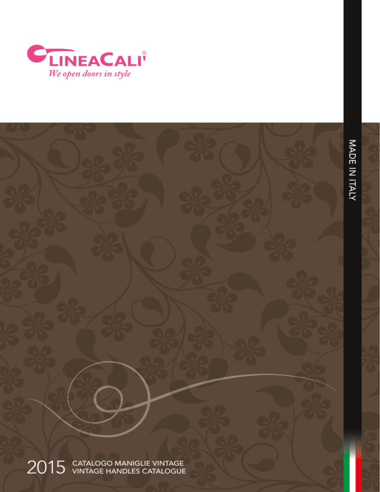 MADE IN ITALY 2015 CATALOGO MANIGLIE VINTAGE VINTAGE HANDLES CATALOGUE www.lineacali.it 1 2 www.lineacali.it Catalogo Vintage Vintage catalogue Italia, aprile 2015 - Ed. LC010/01>2 Italy, April 2015 - Ed. LC010/01>2 www.lineacali.it 1 L’esperienza suggerisce che è praticamente impossibile pubblicare un catalogo privo di errori; saremo quindi grati ai lettori che vorranno segnalarceli scrivendo al seguente indirizzo di posta elettronica: [email protected]. Experience has taught us that it is practically impossible to print a catalogue with no errors, we would therefore be grateful to any readers that wish to point any out to us at the following address: [email protected]. Tutti i diritti sono riservati. È vietata la riproduzione integrale o parziale e la diffusione dei contenuti di questo catalogo (siano essi testi, immagini o disegni) senza la preventiva autorizzazione scritta, da richiedere al seguente indirizzo di posta elettronica: [email protected]. All rights reserved. It is forbidden to reproduce, in part or in whole, and to circulate the contents of this catalogue (text, images and drawings) without prior written authorization, to be requested at the following email address: [email protected]. Le caratteristiche tecniche sono passibili di modifiche. The technical characteristics are subject to modification. Il formato elettronico (PDF) di questo catalogo è disponibile all’interno del sito www.lineacali.it. The electronic format (PDF) of this catalogue is available on the web site www.lineacali.it CREDITI Studio creativo Fantàsia “Dove le idee spuntano come funghi.” www.studiofantasia.it CREDITS Fantàsia creative studio “Where ideas sprout like mushrooms.” www.studiofantasia.it Direzione artistica: Zack! Testi: Alberto Bondoni Traduzioni: Aideen Connolly Informazioni tecniche: Vanessa Martinelli Stampa: Intese Grafiche Art direction: Zack! Text: Alberto Bondoni Translations: Aideen Connolly Technical information: Vanessa Martinelli Print: Intese Grafiche 2 www.lineacali.it indice / index INDICE COLLEZIONI INDEX BY COLLECTION PAG. 4 AZIENDA FACTORY PAG. 5 LEGENDA LEGEND PAG. 12 FINITURE FINISHINGS PAG. 13 COLLEZIONE VINTAGE VINTAGE COLLECTION PAG. 14 MANIGLIONI PULL HANDLES PAG. 78 PLACCHE INCASSO INSET HANDLE KIT PAG. 84 POMOLI PER PORTE DOOR KNOBS PAG. 86 BOCCHETTE ESCUTCHEONS PAG. 87 ACCESSORI ACCESSORIES PAG. 88 MATERIALE PUBBLICITARIO ADVERTISING MATERIAL PAG. 90 ISTRUZIONI DI MONTAGGIO MOUNTING INSTRUCTIONS PAG. 94 www.lineacali.it 3 collezioni / collections 16 Arte cod. 1165 19 Brilliant Crystal cod. 1526 22 Brilliant Diamond cod. 1525 25 Daisy cod. 1070 30 Epoca cod. 1210 33 Liberty cod. 1160 39 Nature cod. 1320 41 Opera cod. 1055 46 Opera Crystal cod. 1056 50 Poesia cod. 1395 53 Queen cod. 1406 57 Rococò cod. 1285 60 Sissi cod. 1400 61 Soleil cod. 1325 66 Tiffany cod. 1308 69 Tiffany Mesh cod. 1307 72 Tiffany Vetro cod. 1306 76 Zaara cod. 1535 www.lineacali.it azienda / factory Apriamo le porte con stile We open doors in style www.lineacali.it 5 La differenza tra una maniglia ed un semplice pezzo di ottone nasce nel 1986, quando lanciammo i nostri prodotti seguendo l’idea della funzionalità abbinata al design. The difference between a handle and a simple piece of brass arose in 1986, when we launched our products that combined both functionality and design. Perché il design senz’anima lo abbiamo provato tutti ed è scomodo, tanto quanto la brutta funzionalità. We’ve all tried design without a soul and its awkward, just like brute functionality. Abbiamo quindi scelto di realizzare quelle maniglie che noi stessi metteremmo a casa nostra, maniglie che resistano a tutto: usura, urti, tempo, grazie ad innovative tecniche di fissaggio e di protezione, come la finitura PVD Zirconium Protection. We therefore chose to create handles that we ourselves would choose for our own house, handles that resist everything: wear, blows, time, thanks to innovative fixing and protection techniques such as the Zirconium Protection finish - PVD. Al contempo, le abbiamo volute belle, molto belle, come ogni vero accessorio che si rispetti. At the same time, we wanted our handles to be attractive, like all accessories should be. E alla fine, visto che volevamo il meglio, ci siamo impegnati a far sì che ogni maniglia venisse concepita e realizzata esclusivamente in Italia, rispettando pienamente i requisiti di legge previsti dalle normative europee. And finally, because we wanted the best, we committed ourselves to ensuring that every handle was designed and created exclusively in Italy, in full compliance with the legislative requirements of European standards. A questo punto, provate ad immaginare la maniglia perfetta per la vostra abitazione o per il vostro ufficio: probabilmente la troverete qui. And now, try and image the ideal handle for your house or office: the chances are you’ll find it here. 6 www.lineacali.it azienda / factory Nel futuro probabilmente le porte si apriranno con il pensiero... fino ad allora, però, sogneranno sempre una maniglia Linea Calì. www.lineacali.it 7 azienda / factory Produciamo maniglie di lusso impreziosite dagli inimitabili cristalli Swarovski®. 8 www.lineacali.it Grazie alla nostra esperienza pluriennale nel mondo del lusso, abbiamo intuito la necessità da parte dei nostri clienti di possedere collezioni sempre più particolari ed esclusive. Thanks to our years of experience in the world of luxury, we understand our customers’ need to possess collections that are more and more special and exclusive. Più di 20 anni fa abbiamo così iniziato a trasformare oggetti di uso comune in gioielli dalle mille sfaccettature impreziosendoli con cristalli Swarovski® originali. So over 20 years ago we started transforming everyday objects into multi faceted jewels with original Swarovski® crystals. Cometa, Cosmic, Crystal, Diamante, Elika Crystal, Elios Crystal, Fish Crystal, Gemma, Havana Mesh, Idea, Luce, Opera Crystal, Profilo Mesh, Ref