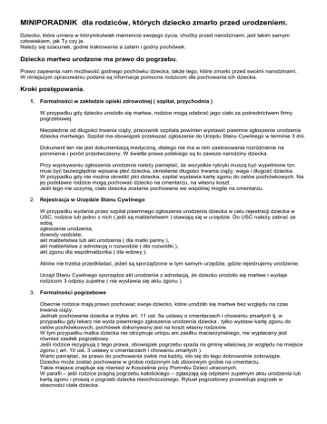 MINIPORADNIK dla rodziców, których dziecko zmarło przed urodzeniem. Dziecko, które umiera w którymkolwiek memencie swojego życia, choćby przed narodzinami, jest takim samym człowiekiem, jak Ty czy ja. Należy się szacunek, godne traktowanie a zatem i godny pochówek. Dziecko martwo urodzone ma prawo do pogrzebu. Prawo zapewnia nam możliwość godnego pochówku dziecka, także tego, które zmarło przed swoimi narodzinami. W niniejszym opracowaniu podane są informacje pomocne rodzicom dla pochowania ich dziecka. Kroki postępowania. 1. Formalności w zakładzie opieki zdrowotnej ( szpital, przychodnia ) W przypadku gdy dziecko urodziło się martwe, rodzice mogą odebrać jego ciało za pośrednictwem firmy pogrzebowej. Niezależnie od długości trwania ciąży, pracownik szpitala powinien wystawić pisemne zgłoszenie urodzenia dziecka martwego. Szpital ma obowiązek przekazać zgłoszenie do Urzędu Stanu Cywilnego w terminie 3 dni. Dokument ten nie jest dokumentacją medyczną, dlatego nie ma w nim zastosowania rozróżnienie na poronienie i poród przedwczesny. W świetle prawa polskiego są to zawsze narodziny dziecka. Przy wypisywaniu zgłoszenia urodzenia należy pamiętać, że wszystkie rybryki muszą być wypełnione tzn. musi być bezwzględnie wpisana płeć dziecka, określenie długości trwania ciąży, waga i długość dziecka. W przypadku gdy nie można określić płci dziecka, szpital wystawia kartę zgonu do celów pochówkowych. Na jej podstawie rodzice mogą pochować dziecko na cmentarzu, na własny koszt. Jeśli tego nie uczynią, ciało dziecka zostanie pochowane we wspólnej mogile na cmentarzu. 2. Rejestracja w Urzędzie Stanu Cywilnego W przypadku wydania przez szpital pisemnego zgłoszenia urodzenia dziecka w celu rejestracji dziecka w USC, rodzice lub jedno z nich ( jeśli są małżeństwem ) stawiają się w urzędzie. Do USC należy zabrać ze sobą: zgłoszenie urodzenia, dowody osobiste, akt małżeństwa lub akt urodzenia ( dla matki panny ), akt małżeństwa z adnotacją o rozwodzie ( dla rozwódki ), akt zgonu dla współmałżonka ( dla wdowy ). Aktów nie trzeba przedkładać, jeżeli są sporządzone w tym samym urzędzie, gdzie rejestrujemy urodzenie. Urząd Stanu Cywilnego sporządza akt urodzenia z adnotacją, że dziecko urodziło się martwe i wydaje rodzicom 3 odpisy zupełne ( nie wystawia się aktu zgonu ). 3. Formalności pogrzebowe Obecnie rodzice mają prawo pochować swoje dziecko, które urodziło się martwe bez względu na czas trwania ciąży. Jednak pochowanie dziecka w trybie art. 11 ust. 5a ustawy o cmentarzach i chowaniu zmarłych tj. w przypadku gdy lekarz nie wyda pisemnego zgłoszenia urodzenia dziecka , tylko wystawi kartę zgonu do celów pochówkowych, pochówek dokonywany jest na koszt własny rodziców. W tym przypadku matka dziecka nie otrzymuje urlopu ani zasiłku macierzyńskiego, nie wypłacany jest również zasiłek pogrzebowy. Jeśli rodzice rezygnują z tego prawa, obowiązek pogrzebu spada na gminę właściwą ze względu na miejsce zgonu ( art. 10 ust. 3 ustawy o cmentarzach i chowaniu zmarłych ). Warto pamiętać, że prawo do pochowania zwłok ma każdy, kto się do tego dobrowolnie zobowiąże. Dziecko może zostać pochowane w grobie rodzinnym lub zbiorowym grobie na cmentarzu. Takie miejsce znajduje się również w Koszalinie przy Pomniku Dzieci utraconych. W parafii – jeśli rodzice pragną pogrzebu katolickiego – zgłaszają się odpisem zupełnym aktu urodzenia lub kartą zgonu i proszą o pogrzeb dziecka nieochrzczonego. Rytuał pogrzebowy przewiduje pogrzeb w obecności ciała dziecka. 4. Formalności związane ze świadczeniami. ZUS powinien wypłacić rodzicom lub osobom, które pochowały dziecko zasiłek pogrzebowy po przedłożeniu stosownego wniosku i odpisu aktu urodzenia z adnotacją, że dziecko urodziło się martwe. Kodeks Pracy przewiduje 8. Tygodniowy urlop macierzyński dla pracownicy, której dziecko urodziło się martwe. Realizacja tego uprawnienia uwarunkowana jest od sporządzenia aktu urodzenia dziecka w USC. Tak zwane becikowe nie przysługuje. 5. Firmy ubezpieczeniowe. Niekiedy firmy ubezpieczeniowe odmawiają wypłaty odszkodowania z tytułu ubezpieczenia na wypadek urodzenia martwego dziecka na podstawie medycznego rozróżnienia, iż przed 22. tygodniem życia dziecka nie ma narodzin, ale jest poronienie. Jeśli podobna klauzula nie została umieszczona w warunkach ubezpieczenia, odmowa taka jest bezprawna, gdyż zgodnie z obowiązującym prawem wiek dziecka nie ma znaczenia dla stwierdzenia jego narodzin. Koszalin jest jednym z pierwszych miast w Polsce, które podjęły się próby wyjścia naprzeciw problemowi pochówku dzieci utraconych. Wieloletnie przemilczenia i brak uregulowań prawnych sprawiały, że rodzice dotknięci taką stratą, nie potrafili przebić się przez mur biurokratycznych ograniczeń, by móc pochować dzieci, niezależnie od stopnia rozwoju prenatalnego. W efekcie kampanii społecznej „Nasze na zawsze” udało się upamiętnić dzieci utracone pomnikiem, który 24 marca 2012r. w Narodowy Dzień Życia został poświęcony na koszalińskim cmentarzu. W tym celu 18 stycznia 2011r. został powołany Komitet Budowy Pomnika Dzieci Utraconych w Koszalinie. To inicjatywa społeczna, w którą zaangażowały się między innymi władze miejskie, przedstawiciele lokalnego Kościoła, szpitala, Urzędu Stanu Cywilnego, Miejskiego Ośrodka Pomocy Społecznej i przedsiębiorstwa Gospodarki Komunalnej oraz lokalnych mediów. Honorowymi członkami komitetu są: Biskup koszalińsko – kołobrzeski Edward Dajczak, Prezydent Koszalina Piotr Jedliński, Przewodniczący Rady Miasta Koszalin Władysław Husejko, Urszula Mikietyńska, lekarz pediatra i radna miejska. Udało się także wypracować procedury umożliwiające pochówek dzieci, których ciała pozostały w Szpitalu Wojewódzkim w Koszalinie. Radni Rady Miejskiej uchwałą podjętą 2
