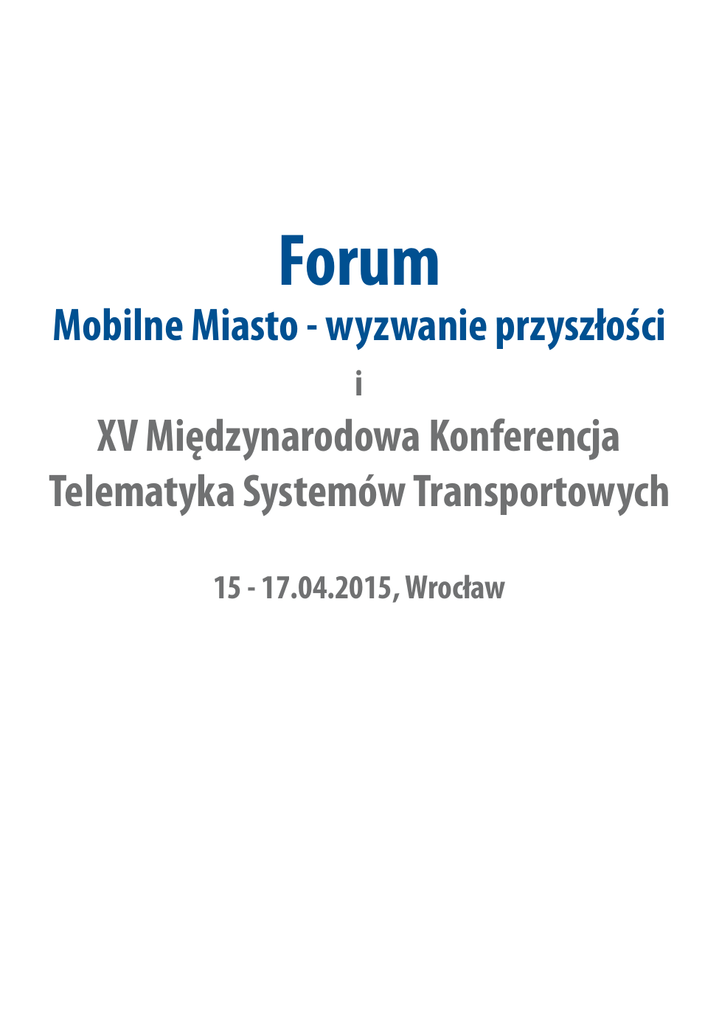 Forum Mobilne Miasto - wyzwanie przyszłości i XV Międzynarodowa Konferencja Telematyka Systemów Transportowych 15 - 17.04.2015, Wrocław PATRONAT ORGANIZATORZY P O L S K A I Z BA G O S P O DA RC Z A ZAAWANSOWANYCH TECHNOLOGII WSPÓŁORGANIZATORZY GOSPODARZ FORUM Opracowanie redakcyjne Edward Piekarski Opracowanie typgraficzne Stanisław Małecki 2 Wydanie pierwsze, 2015 Wydane nakładem Polskiej Izby Gospodarczej Zaawansowanych Technologii 00-043 Warszawa, ul. Czackiego 7/9, ISBN 978-83-06-5 fot. Maciej Kulczyński J est mi niezmiernie miło zaprosić Państwa do udziału w Forum Mobilne Miasto wyzwanie przyszłości i XV Międzynarodowej Konferencji Telematyka Systemów Transportowych. Tematy dyskutowane podczas Forum i Konferencji będą poświęcone zagadnieniom, mającym bezpośredni wpływ na funkcjonowanie metropolii. Unowocześnianie miejskich systemów transportowych, nowe technologie wpływające na wzrost mobilności miast i doskonalenie zarządzania ruchem to konieczność i jedyna gwarancja dalszego rozwoju każdej aglomeracji. O tym, jak trudna jest to materia wiedzą ci, którzy podjęli wyzwanie i odważnie, krok po kroku wdrażali nowe rozwiązania zmierzające do poprawy zarządzania ruchem. Wrocław jest przykładem odważnego wykorzystania narzędzi, które składają się na Inteligentny System Transportu. W podejmowaniu decyzji towarzyszyły niektórym z nas obawy i wątpliwości. Była to przecież operacja na tętniącym życiem organizmie miejskim, rozrastającym się i wymagającym sprostaniu zapotrzebowania jego mieszkańców. Wrocław nieustannie się zmienia. Wprowadzamy nowe rozwiązania komunikacyjne, węzły, nowoczesny tabor komunikacyjny. Wrocław posiada nowoczesne i zaawansowane technologicznie Centrum Sterowania Ruchem. Ufam, że Forum stworzy doskonałą atmosferę do omówienia najważniejszych zagadnień, wymiany doświadczeń jak i poszukiwania odpowiedzi na pytania i wątpliwości. Zachęcam gorąco do wzięcia udziału w debatach i panelach, spotkaniach kooperacyjnych i poszukiwaniu dróg do wdrażania osiągnięć nauki w gospodarce. Dziękuję organizatorom Forum - Polskiej Izbie Gospodarczej Zaawansowanych Technologii, Polskiemu Stowarzyszeniu Telematyki Transportu, Politechnikom - Wrocławskiej i Śląskiej – za wybranie naszego miasto na Gospodarza Forum. Mam nadzieję, że Wrocław oczaruje Państwa swoją wielokulturowością i atmosferą. Jesteśmy miastem oddychającym historią ale patrzącym także w przyszłość. Chcemy być miastem przyjaznym dla mieszkańców i tych wszystkich, którzy codziennie odwiedzają naszą Dolnośląską Stolicę. Rafał Dutkiewicz Prezydent Wrocławia 3 Szanowni Państwo, ędzie mi niezwykle miło gościć uczestników XV Międzynarodowej Konferencji „Telematyka Systemów Transportowych” na Politechnice Wrocławskiej, uczelni, która rozpoczęła podróż w kierunku technicznego uniwersytetu badawczego, uniwersytetu typu „smart”. Uniwersytetu, który jest zarządzany i ma taką strukturę, która inteligentnie i sprawnie dopasowuje się do zmieniającego się otoczenia. I w tym ma wiele wspólnego z telematyką. Dzisiaj nie ma dyscyplin w nauce ani działów w gospodarce, które mogą funkcjonować niezależnie od innych. Telematyka, jako dziedzina interdyscyplinarna, jest tego najlepszym przykładem. A Politechnika Wrocławska jest najlepszym miejscem, gdzie konferencja telematyczna może się odbyć. Konferencja będzie poświęcona zagadnieniom naukowym związanym z doskonaleniem inteligentnych systemów transportowych i wdrażaniem osiągnięć telematyki do sterowania transportem. I miasto Wrocław, i Politechnika Wrocławska mają w tej materii pewne doświadczenia, liczymy zatem na owocną naukową dyskusję i wymianę informacji, które będą pomocne w usprawnianiu systemów już funkcjonujących. Od wielu lat powtarzam, że inżynier to zawód zaufania społecznego. Wymaga bowiem nie tylko wiedzy i umiejętności, lecz także niesie ze sobą odpowiedzialność. I przy okazji konferencji telematycznej widać to bardzo wyraźnie: efekty pracy naukowców i firm zajmujących się ich wdrożeniem mogą realnie poprawić funkcjonowanie wielu tysięcy ludzi. Czego Państwu, i nam wszystkim we Wrocławiu, serdecznie życzę. B Prof. Tadeusz Więckowski, rektor Politechniki Wrocławskiej 4 Szanowni Państwo, am prawdziwą przyjemność zaprosić Państwa na Forum „Mobilne miasto – wyzwanie przyszłości” i towarzyszącą mu XV Międzynarodową Konferencję „Telematyka Systemów Transportowych”. We współczesnym świecie mobilność miasta decyduje praktycznie o wszystkim – o tempie jego rozwoju, o konkurencyjności jego gospodarki, o lokalizacji inwestycji i wreszcie o jakości życia jego mieszkańców - jak efektywnie pracują i jak odpoczywają. Jednocześnie mobilność stała się jednym z najtrudniejszych wyzwań przed jakim stoją miasta na całym świecie. Dotychczasowe metody rozwoju i eksploatacji miejskiej infrastruktury transportowej nie zdają egzaminu. Skumulowany wpływ urbanizacji, industrializacji i dynamicznego wzrostu liczby wszelkiego typu pojazdów poruszających się po ulicach miast doprowadził do jej ogromnego przeciążenia. Straty czasu mieszkańców i ponoszone przez nich koszty z powodu nieadekwatnej infrastruktury transportowej są ogromne. Bez wątpienia jedną z dróg prowadzących do zmiany tego stanu jest wykorzystanie nowych osiągnięć technologii do zarządzania i sterowania ruchem. Rozwój informatyki i telematyki stwarza wielkie możliwości, ciągle jeszcze niedoceniane i słabo wykorzystywane. Wprowadzanie do eksploatacji inteligentnych systemów transportowych stało się nakazem chwili. Bez pilnych działań w tym w tym zakresie miejskie infrastruktury transportowe ulegną całkowitemu załamaniu. Jednakże nawet najlepsze inteligentne systemy sterowania ruchem nie przyniosą spodziewanych rezultatów, jeśli nie zostaną wsparte komp