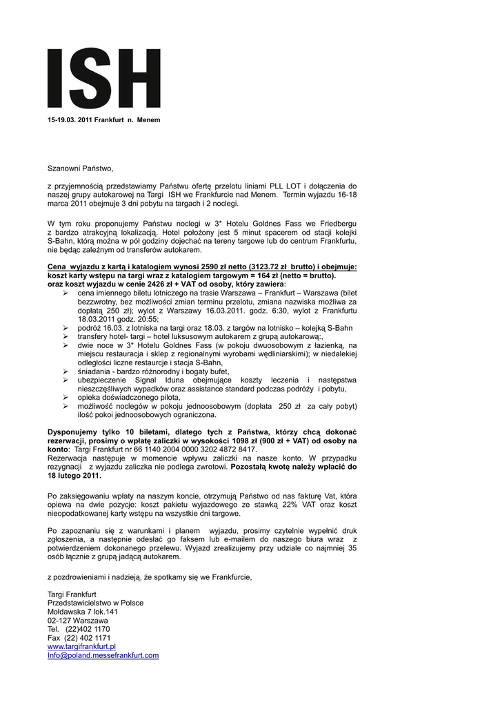 15-19.03. 2011 Frankfurt n. Menem Szanowni Państwo, z przyjemnością przedstawiamy Państwu ofertę przelotu liniami PLL LOT i dołączenia do naszej grupy autokarowej na Targi ISH we Frankfurcie nad Menem. Termin wyjazdu 16-18 marca 2011 obejmuje 3 dni pobytu na targach i 2 noclegi. W tym roku proponujemy Państwu noclegi w 3* Hotelu Goldnes Fass we Friedbergu z bardzo atrakcyjną lokalizacją. Hotel położony jest 5 minut spacerem od stacji kolejki S-Bahn, którą można w pół godziny dojechać na tereny targowe lub do centrum Frankfurtu, nie będąc zależnym od transferów autokarem. Cena wyjazdu z kartą i katalogiem wynosi 2590 zł netto (3123.72 zł brutto) i obejmuje: koszt karty wstępu na targi wraz z katalogiem targowym = 164 zł (netto = brutto). oraz koszt wyjazdu w cenie 2426 zł + VAT od osoby, który zawiera:  cena imiennego biletu lotniczego na trasie Warszawa – Frankfurt – Warszawa (bilet bezzwrotny, bez możliwości zmian terminu przelotu, zmiana nazwiska możliwa za dopłatą 250 zł); wylot z Warszawy 16.03.2011. godz. 6:30, wylot z Frankfurtu 18.03.2011 godz. 20:55;  podróż 16.03. z lotniska na targi oraz 18.03. z targów na lotnisko – kolejką S-Bahn  transfery hotel- targi – hotel luksusowym autokarem z grupą autokarową:,  dwie noce w 3* Hotelu Goldnes Fass (w pokoju dwuosobowym z łazienką, na miejscu restauracja i sklep z regionalnymi wyrobami wędliniarskimi); w niedalekiej odległości liczne restaurcje i stacja S-Bahn,  śniadania - bardzo różnorodny i bogaty bufet,  ubezpieczenie Signal Iduna obejmujące koszty leczenia i następstwa nieszczęśliwych wypadków oraz assistance standard podczas podróży i pobytu,  opieka doświadczonego pilota,  możliwość noclegów w pokoju jednoosobowym (dopłata 250 zł za cały pobyt) ilość pokoi jednoosobowych ograniczona. Dysponujemy tylko 10 biletami, dlatego tych z Państwa, którzy chcą dokonać rezerwacji, prosimy o wpłatę zaliczki w wysokości 1098 zł (900 zł + VAT) od osoby na konto: Targi Frankfurt nr 66 1140 2004 0000 3202 4872 8417. Rezerwacja następuje w momencie wpływu zaliczki na nasze konto. W przypadku rezygnacji z wyjazdu zaliczka nie podlega zwrotowi. Pozostałą kwotę należy wpłacić do 18 lutego 2011. Po zaksięgowaniu wpłaty na naszym koncie, otrzymują Państwo od nas fakturę Vat, która opiewa na dwie pozycje: koszt pakietu wyjazdowego ze stawką 22% VAT oraz koszt nieopodatkowanej karty wstępu na wszystkie dni targowe. Po zapoznaniu się z warunkami i planem wyjazdu, prosimy czytelnie wypełnić druk zgłoszenia, a następnie odesłać go faksem lub e-mailem do naszego biura wraz z potwierdzeniem dokonanego przelewu. Wyjazd zrealizujemy przy udziale co najmniej 35 osób łącznie z grupą jadącą autokarem. z pozdrowieniami i nadzieją, że spotkamy się we Frankfurcie, Targi Frankfurt Przedstawicielstwo w Polsce Mołdawska 7 lok.141 02-127 Warszawa Tel. (22)402 1170 Fax (22) 402 1171 www.targifrankfurt.pl [email protected]