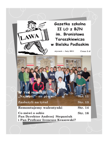 A W A L Gazetka szkolna II LO z BJN im. Bronisława Taraszkiewicza w Bielsku Podlaskim styczeń — luty 2011 W TYM NUMERZE: Cena: 2 zł „Najlepsi” - na pewno? Str. 11 Zasłużyli na tytuł Str. 13 Remontujemy walentynki Str. 14 Co mówi o sobie Str. 16 Pan Dyrektor Andrzej Stepaniuk i Pan Profesor Ireneusz Krasowski? Spis treści 1. Aktualności Co w nauce piszczy? .................................. str. 3 Konkurs „Polska w NATO” ....................... str. 5 2. Przeczytaj, zobacz, posłuchaj Przyjaźń przez druty ................................... str. 6 Życie Kolesia, czyli prawda o... ................. str. 6 3. W naszych oczach Białoruska muzyka ..................................... str. 7 Ach, te sentymenty ..................................... str. 7 Autopilot, o tym czyli jak nas mija czas .... str. 8 Spanie, sanki i bałwanki? ........................... str. 9 Nowy semestr, nowe podejście ................ str. 10 Zabójca kreatywności............................... str. 10 „Najlepsi” - na pewno? ............................ str. 11 Poradnik - jak nie zwariować w szkole? .. str. 12 Zasłużyli na tytuł ...................................... str. 13 Remontujemy walentynki ........................ str. 15 Walentynkowe przesłuchanie................... str. 16 3. Co mówi o sobie... Pan Dyrektor Andrzej Stepaniuk ............. str. 17 Pan Profesor Ireneusz Krasowski............. str. 18 6. Humor Ballada o tarciu ........................................ str. 18 Kocha się za nic ....................................... str. 20 Teksty nauczycieli i uczniów ................... str. 21 Maturalne kwiatki .................................... str. 22 Aktualności Zespół redakcyjny Katarzyna Ignatiuk – opiekun Paweł Turkowicz – redaktor naczelny Katarzyna Bujniuk- z-ca redaktora Paweł Bazyluk – redaktor techniczny Mateusz Bagrowski Marta Bałło Aleksandra Gawryluk Aleksandra Ignatiuk Paweł Jakończuk Magdalena Jakuc Mateusz Jurczuk Marlena Leoniuk Agnieszka Repnik Str. 2 Adrian Roszczenko Diana Siebiesiewicz Anna Sielewonowicz Krystyna Świderska Dominika Tworkowska Agata Wasilewska W ogólnopolskim etapie konkursu „Polska w NATO” Paweł Jakończuk z kl. II A został laureatem. Opiekun – mgr Włodzimierz Wawulski – 08.01.2011 W konkursie fotograficznym „Drewniana architektura regionu Puszczy Białowieskiej” zorganizowanym w ramach projektu „Szkoła Tradycji Architektonicznych Północnego Podlasia” przez Stowarzyszenie Dziedzictwo Podlasia Oskar Ciulkiewicz z kl. I C zajął II miejsce, a Erwin Ciulkiewicz z kl. III A III miejsce – 09.01.2011 Gala wręczenia nagród w II edycji konkursu „Koledzy ze szkoły, znajomi z sąsiedztwa” organizowanego przez Muzeum Historii Żydów Polskich pod honorowym patronatem Pełnomocnika Rządu do spraw Równego Traktowania, Minister Elżbiety Radziszewskiej. Drugie miejsce jury przyznało Erwinowi i Oskarowi Ciulkiewicz za film „Łączy nas Orla” – 11.01.2011 Okręgowe eliminacje XVII Olimpiady Języka Białoruskiego. Do zawodów centralnych zakwalifikowali się: Paweł Szeszko (kl. III A), Tomasz Lewczuk (kl. II B), Ewa Szkoda (kl. II D), Anna Sielewonowicz (kl. I B), Joanna Fiedoruk (kl. III C), Agnieszka Repnik (kl. II D) i Emilia Oniszczuk (kl. II D). Opiekunowie – mgr Anna Brzozowska i mgr Eugenia Taranta – 13.01.2011 Do etapu wojewódzkiego XXVI Olimpiady Wiedzy Ekologicznej zakwalifikowali się: Michał Zajkowski (kl. II B), Tomasz Lewczuk (kl. III B) i Aleksandra Gawryluk (kl. I B). Opiekun – Irena Trojanczuk - 20.01.2011 Studniówka – 23.01.2011 II LO z BJN było gospodarzem „Spotkań Rodzinnych”, które” zostały zorganizowane Gazetka Szkolna „LAWA” II Liceum Ogólnokształcące z Białoruskim Językiem Nauczania im. Bronisława Taraszkiewicza ul. Kopernika 4 17-100 Bielsk Podlaski tel. 085 730 66 90 e-mail: [email protected] styczeń - luty 2011 — LAWA Aktualności przez Stowarzyszenie Muzeum Małej Ojczyzny w Studziwodach i Fundację „Oikonomos – 28.01.2011 Adrianna Dębowska z klasy II C została laureatką ogólnopolskiego konkursu na esej pt.: „Tu mieszkam, tu działam”, który zorganizował Instytut Obywatelski. W nagrodę pojedzie do Brukseli. Opiekun – mgr Alicja Wyszkowska-Kobus – 28.01.2011 W eliminacjach okręgowych XL Olimpiady Biologicznej Tomasz Lewczuk (kl. III B) został zwycięzcą, uzyskując tym samym prawo do reprezentowania szkoły w zawodach ogólnopolskich. Tytuł laureata zawodów okręgowych uzyskała Daniela Filimoniuk (kl. II B). Opiekun – mgr Irena Trojanczuk – 29.01.2011 Uczennice klasy III D Oksana Fiedoruk i Mirosława Mironczuk zakwalifikowały się do etapu okręgowego Olimpiady Literatury i Języka Polskiego. Opiekun – mgr Alicja WyszkowskaKobus – 07.02.2011 Finał konkursu „(Nie)bezpieczny Internet”. Strona internetowa, stworzona przez uczniów: Tomasza E. Parfieniuka, Michała Sacharczuka, Pawła Tomczuka oraz Macieja Borowika i Adama Paniutycza zdobyła II miejsce. Opiekun – mgr Sławomir Niedźwiecki – 08.02.2011 II etap Ogólnopolskiej Olimpiady Prawosławnej Wiedzy Religijnej. Do etapu centralnego zakwalifikował się uczeń klasy II C Janusz Koc. Opiekun – mgr Ewa Ostapkowicz – 09.02.2011 Finał Olimpiady Wiedzy o Świecie Antycznym. I miejsce i tytuł laureata uzyskał Arkadiusz Waszkiewicz (kl. III C), II miejsce - Natalia Masalska (kl. II C), I wyróżnienie Małgorzata Suszcz (kl. I C), II wyróżnienie Mateusz Jurczuk (kl. I C), tytuł finalisty otrzymali również Mateusz Wasilewski (kl. III C), Rafał Wojciuk (kl. II C) i Adrian Roszczenko (kl. I C). Opiekun - Włodzimierz Wawulski - 09.02.2011 Przegląd filmów białoruskich – 09.02.2011 Eliminacje okręgowe - etap ustny XVIII Olimpiady Wiedzy o Prawach Człowieka. Uczeń klasy III C Arkadiusz Waszkiewicz zajął III miejsce, został laureatem szczebla okręgowego i będzie reprezentował nasze województwo w Toruniu. Adrian Dmitruk (