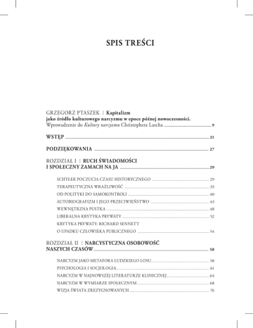 SPIS TREŚCI Grzegorz Ptaszek ⫶ Kapitalizm jako źródło kulturowego narcyzmu w epoce późnej nowoczesności. Wprowadzenie do Kultury narcyzmu Christophera Lascha ������������������������������������������������������������������ 9 WSTĘP �������������������������������������������������������������������������������������������������������������������������������������������������������������������������������������������������������� 21 PODZIĘKOWANIA ���������������������������������������������������������������������������������������������������������������������������������������������������������������� 27 ROZDZIAŁ I ⫶ Ruch świadomości i społeczny zamach na ja ����������������������������������������������������������������������������������������������������������������������������� 29 Schyłek poczucia czasu historycznego ����������������������������������������������������������������������������������� 29 Terapeutyczna wrażliwość ��������������������������������������������������������������������������������������������������������������������������� 33 Od polityki do samokontroli ���������������������������������������������������������������������������������������������������������������������� 40 Autobiografizm i jego przeciwieństwo ������������������������������������������������������������������������������������� 43 Wewnętrzna pustka ����������������������������������������������������������������������������������������������������������������������������������������������������� 48 Liberalna krytyka prywaty ������������������������������������������������������������������������������������������������������������������������������ 52 Krytyka prywaty: Richard Sennett o upadku człowieka publicznego �������������������������������������������������������������������������������������������������������� 54 ROZDZIAŁ II ⫶ Narcystyczna osobowość naszych czasów����������������������������������������������������������������������������������������������������������������������������������������������������������������� 58 Narcyzm jako metafora ludzkiego losu������������������������������������������������������������������������������������ 58 Psychologia i socjologia��������������������������������������������������������������������������������������������������������������������������������������� 61 Narcyzm w najnowszej literaturze klinicznej���������������������������������������������