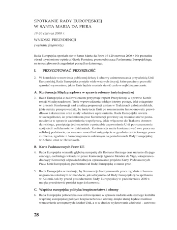SPOTKANIE RADY EUROPEJSKIEJ W SANTA MARIA DA FEIRA 19-20 czerwca 2000 r. WNIOSKI PREZYDENCJI (wybrane fragmenty) Rada Europejska spotkała się w Santa Maria da Feira 19 i 20 czerwca 2000 r. Na początku obrad wymieniono opinie z Nicole Fontaine, przewodniczącą Parlamentu Europejskiego, na temat głównych zagadnień porządku dziennego. I. PRZYGOTOWAĆ PRZYSZŁOŚĆ 2. W kontekście wznowienia publicznej debaty i odnowy zainteresowania przyszłością Unii Europejskiej, Rada Europejska przyjęła wiele ważnych decyzji, które powinny pozwolić sprostać wyzwaniom, jakim Unia będzie musiała stawić czoło w najbliższym czasie. A. Konferencja Międzyrządowa w sprawie reformy instytucjonalnej 3. Rada Europejska z zadowoleniem przyjmuje raport Prezydencji w sprawie Konferencji Międzyrządowej. Treść wprowadzenia oddaje istotny postęp, jaki osiągnięto w pracach Konferencji nad analizą propozycji zmian w Traktatach założycielskich, jakie należy przeprowadzić, by instytucje Unii po rozszerzeniu funkcjonowały prawidłowo i skutecznie oraz miały właściwe uprawnienia. Rada Europejska uważa w szczególności, że przedmiotem prac Konferencji powinny się również stać te postanowienia w sprawie zacieśnienia współpracy, jakie włączono do Traktatu Amsterdamskiego, pamiętając jednocześnie o potrzebie zapewnienia Unii po rozszerzeniu spójności i solidarności w działaniach. Konferencja może kontynuować swe prace na solidnej podstawie, co zarazem umożliwi osiągnięcie w grudniu całościowego porozumienia, zgodnie z harmonogramem ustalonym na posiedzeniach Rady Europejskiej w Kolonii oraz w Helsinkach. B. Karta Podstawowych Praw UE 4. Rada Europejska wyraziła głęboką sympatię dla Romana Herzoga oraz uznanie dla jego cennego, osobistego wkładu w prace Konwencji. Ignacio Mendez de Vigo, wiceprzewodniczący Konwencji odpowiedzialnej za opracowanie projektu Karty Podstawowych Praw Unii Europejskiej, poinformował Radę Europejską o stanie prac. 5. Rada Europejska wnioskuje, by Konwencja kontynuowała prace zgodnie z harmonogramem ustalonym w mandacie, jaki otrzymała od Rady Europejskiej na spotkaniu w Kolonii, tak by przed posiedzeniem Rady Europejskiej w październiku 2000 r. mogła przedstawić projekt tego dokumentu. C. Wspólna europejska polityka bezpieczeństwa i obrony 6. Rada Europejska potwierdza swe zobowiązanie w sprawie nadania ostatecznego kształtu wspólnej europejskiej polityce bezpieczeństwa i obrony, dzięki której będzie możliwe wzmocnienie zewnętrznych działań Unii, a to w drodze wykreowania zdolności – zarówno 28 8. Dla wiarygodności i skuteczności wspólnej europejskiej polityki bezpieczeństwa i obrony niezwykle ważne jest umocnienie możliwości Unii Europejskiej w dziedzinie militarnej. Rada Europejska zamierza osiągnąć globalne cele, jakie na rok 2003 wyznaczono w Helsinkach. W tym kontekście Rada z zainteresowaniem oczekuje na rezultaty konferencji w sprawie propozycji co do udziału w zakresie zdolności [w sferze militarnej], która odbędzie się w tym roku i podczas której państwa członkowskie wstępnie zadeklarują swe zobowiązania, jak również oczekuje na ukształtowanie mechanizmu oceny, który umożliwi oszacowanie postępów zrobionych na rzecz osiągnięcia tych celów. W relacjach Unia – NATO zostanie zapewniona niezbędna przejrzystość i będzie się toczył dialog, a potrzeby związane z osiągnięciem pełnej zdolności będą konsultowane z ekspertami NATO-wskimi. 9. Ustalone zostały zasady i tryb, dzięki którym europejscy członkowie NATO, nie będący w UE, oraz państwa kandydujące do UE, które są członkami NATO, będą mogli brać udział w militarnym zarządzaniu sytuacjami kryzysowymi przez UE. Zasady konsultacji z NATO kwestii militarnych oraz związanych z rozwojem stosunków między UE i NATO zostały określone w czterech dziedzinach: bezpieczeństwo, cele w sferze zdolności, tryb zapewniający UE dostęp do zasobów NATO i stałe mechanizmy konsultacji. 10. Rada Europejska zachęca wszystkie partnerskie kraje trzecie do doskonalenia przez nie możliwości [militarnych] w wymiarze europejskim. Rada Europejska jest usatysfakcjonowana propozycjami Turcji, Norwegii, Polski i Czech, które zgłosiły gotowość rozszerzenia zdolności do działań prowadzonych przez UE. 11. Rada Europejska z zadowoleniem przyjmuje powołanie Komitetu ds. cywilnych aspektów zarządzania sytuacjami kryzysowymi (który już się ukonstytuował), jak również sprecyzowanie priorytetowych celów związanych z cywilnymi aspektami zarządzania sytuacjami kryzysowymi oraz specyficznych celów dotyczących zdolności do działań policji cywilnej. W ramach dobrowolnej współpracy, państwa członkowskie zobowiązały się, że do 2003 r. będą w stanie wydelegować do 5 tys. policjantów do pełnienia zadań międzynarodowych, których istotą będą różnorodne działania mające na celu zapobieganie konfliktom oraz zarządzanie sytuacjami kryzysowymi. Państwa członkowskie zobowiązały się jednocześnie, że będą zdolne zmobilizować do tysiąca policjantów w ciągu trzydziestu dni. Rada Europejska z zadowoleniem przyjmuje również deklarację Komisji co do udziału w cywilnym zarządzaniu sytuacjami kryzysowymi, w miarę jej kompetencji. 12. Rada Europejska podkreśla, że w dziedzinie zapobiegania konfliktom i zarządzania sytuacjami kryzysowymi Unia zamierza wywiązać się ze wszystkich swych zobowiązań 29 Spotkania Rady Europejskiej 1993-22002 7. Rada Europejska z zadowoleniem przyjmuje uprzednio już przez nią zatwierdzony raport Prezydencji Wzmocnienie wspólnej europejskiej polityki bezpieczeństwa i obrony, wraz ze stosownymi dokumentami (patrz Załącznik I). Duży postęp osiągnięto we wdrażaniu uzgodnionych w Helsinkach wojskowych i cywilnych aspektów zarządzania sytuacjami kryzysowymi, toteż Rada Europejska przyjmuje do wiadomości, że stopniowo powstają tymczasow