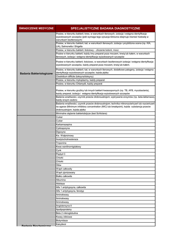 SPECJALISTYCZNE BADANIA DIAGNOSTYCZNE ŚWIADCZENIE MEDYCZNE Posiew, w kierunku bakterii; krew, w warunkach tlenowych, izolacja i wstępna identyfikacja wyizolowanych szczepów (jeśli wymaga tego sytuacja kliniczna obejmuje również hodowlę w warunkach beztlenowych) Posiew, w kierunku bakterii; kał, w warunkach tlenowych, izolacja i przybliżona ocena (np. KIA, LIA), Salmonella i Shigella Posiew, w kierunku bakterii; ilościowy – zliczenie kolonii, mocz Posiew w kierunku bakterii; każdy inny preparat poza moczem, krwią lub kałem, w warunkach tlenowych, izolacja i wstępna identyfikacja wyizolowanych szczepów Posiew w kierunku bakterii; ilościowo, w warunkach beztlenowych izolacja i wstępna identyfikacja wyizolowanych szczepów, każdy preparat poza moczem, krwią lub kałem. Badania Bakteriologiczne Posiew, w kierunku bakterii; kał, w warunkach tlenowych, dodatkowe patogeny, izolacja i wstępna identyfikacja wyizolowanych szczepów, każda płytka Clostridium difficile (toksyna/toksyny) Posiew, w kierunku mykoplazmy, każdy preparat Posiew, w kierunku Chlamydii, każdy preparat Posiew, w kierunku gruźlicy lub innych bakterii kwasoopornych (np. TB, AFB, mycobacteria), każdy preparat, izolacja i wstępna identyfikacja wyizolowanych szczepów Badania wrażliwości, czynnik przeciw drobnoustrojom; wykrywanie enzymów (np. beta-laktamaza), każdy enzym osobno Badania wrażliwości, czynnik przeciw drobnoustrojom; technika mikrorozcieńczeń lub rozcieńczeń na agarze (Minimum inhibitory concentration (MIC) lub breakpoint), każda substancja przeciw drobnoustrojom, każda płytka Minimalne stężenie bakteriobójcze (test Schlictera) Cukier Cukier Karbamazepina Cyklosporyna Digoxyna Kw. Walproinowy Acetylocholinesteraza Troponina Kwas wanilinomigdałowy Cynk Peptyd C Chlorki Chlorki Ołów Wapń całkowity Wapń zjonizowany Białko całkowite Albumina Aldolaza Alfa 1 antytrypsyna, całkowita Alfa 1 antytrypsyna, fenotyp Aminokwasy Aminokwasy Aminokwasy Angiotensyna II Apolipoproteiny Beta 2 mikroglobulina Kwasy żółciowe Biotynidaza Badania Biochemiczne Kalcyferol Badania Biochemiczne Kalcyferol Transferyna Tlenek węgla Tlenek węgla Katecholaminy Katecholaminy Ceruloplazmina Miedź Vit. B12 Kwas foliowy Gazometria Mioglobina Osmolalność Fenylalanina elektroforeza białek CRP CRP Czynnik reumatolidalny (RF) Czynnik reumatolidalny (RF) Dopełniacz Dopełniacz Ferrytyna Transferyna Całkowita zdolność wiązania żelaza (TIBC) Homoglobina glikozylowana (HbA1C) Haptoglobina Hemoglobina Methemoglobina Methemoglobina Homocystyna Mleczanowa dehydrogenaza (LD), (LDH); Mleczany (kwas mlekowy) Fosfataza kwaśna, całkowita Fosfataza kwaśna, sterczowa Fosfataza zasadowa Badania Enzymatyczne Fosfataza zasadowa izoenzymy Glutamylotransferaza, gamma (GGT) Kinaza kreatynowa (CK), (CPK); tylko frakcja MB Kinaza kreatynowa (CK), (CPK); całkowita Kinaza kreatynowa (CK), (CPK); izoenzymy Lipaza Morfologia krwi obwodowej; retikulocytoza, ręcznie Badania Hematologiczne Test w kierunku antyglobulin ludzkich (odczyn Coombs'a); bezpośredni, osobno każda surowica do określania grupy krwi Test w kierunku antyglobulin ludzkich (odczyn Coombs'a); pośredni, ocena jakościowa, osobno każda surowica do określania grupy krwi Określenie grupy krwi; w układzie ABO Określenie grupy krwi; w układzie Rh(D) Określenie grupy krwi; antygeny erytrocytarne, inne niż w układzie ABO lub Rh (D), każda procedura Określenie grupy krwi; ustalenie fenotypu Rh, pełne Renina Aldosteron Androstendion Androsteron Dehydroepiandrosteron (DHEA) Deozoksykortyzol, 11Erytropoetyna Estradiol Estriol Estron Gonadotropina kosmkówkowa (HCG); jakościowo Gonadotropina; FSH Gonadotropina; hormon luteinizujacy (LH) Homowanilinowy kwas (HVA) Hydroksykortykosteroidy, 17-(17-OHCS) Insulina; całkowita Badania Hormonalne i Metaboliczne Insulina; wolna Kalcytonina Kortyzol; wolny Kortyzol; całkowity Parathormon (hormon przytarczyc) Pregnanediol Progesteron Prolaktyna Serotonina Globulina wiążąca hormony płciowe - Sex hormone binding globulin (SHBG) Tyreoglobulina Hormony tarczycy (T3 lub T4) – wychwyt lub wskaźnik wiązania hormonów tarczycy (THBR) Tyrozyna Testosteron; wolny Testosteron; całkowity Trójjodotyronina T3; wolna Tyroksyna; wolna Tyroksyna; całkowita Trójjodotyronina T3; całkowita (TT-3) Gammaglobulina; IgA, IgD, IgG, IgM, Badania Immunologiczne IgE Immunoglobuliny IgE specyficzne dla alergenu; ocena jakościowa, badanie przesiewowe w kierunku wielu alergenów (paski testowe lub krążki testowe) Alfa-fetoproteina; w surowicy CA125 Antygen karcynoembrionalny (CEA) Badanie typu immunoassay w kierunku antygen guza, ilościowo; CA 15-3 (27.29) CA19-9 Badanie typu immunoassay w kierunku antygenu guza, inny antygen, ilościowo (np. CA 50, 72-4, 549), każda procedura Antygen sterczowy (Prostate specific antigen - PSA); całkowity Antygen sterczowy (Prostate specific antigen - PSA); wolny Produkty degradacji fibryny, D-dimery; jakościowo lub półilościowo Produkty degradacji fibryny, D-dimery; ilościowo Badania Inne zapalenie wątroby typu Be - antygen (HBeAg) Antystreptolizyna 0; miareczkowanie Antystreptolizyna 0; skrining Badanie w kierunku kiły; ocena jakościowa (np. VDRL, RPR, ART) Typowanie w układzie HLA; A, B, lub C (np. A10, B7, B27), jeden antygen Glukoza, płyny ustrojowe, inne niż krew Badanie makroskopowe; stawonogi Badanie makroskopowe; pasożyty Rozmaz z nosa w kierunku granulocytów eozynofilnych Plwocina, pozyskiwanie próbki, technika drażnienia aerozolem (oddzielna procedura) Test skórny; gruźlica, śródskórnie Test skórny; gruźlica, próba skaryfikacyjna Krew utajona, metodą aktywności peroksydazy (np. próba gwajakolowa), jakościowo; kał, 1-3 jednoczesne oznaczenia Krew utajona, metodą oceny zawartości hemoglobiny w kale z zastosowaniem techniki immunoassay, jakościowo; kał, 1-3 jednoczesne oznaczenia Badanie w kierunku owsicy (np. preparat na taśmie celofan
