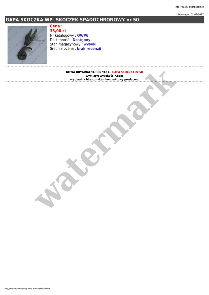 Informacje o produkcie Utworzono 02-03-2017 GAPA SKOCZKA WP- SKOCZEK SPADOCHRONOWY nr 50 Cena : 38,00 zł Nr katalogowy : OWP6 Dostępność : Dostępny Stan magazynowy : wysoki Średnia ocena : brak recenzji w at er m ar k NOWA ORYGINALNA ODZNAKA - GAPA SKOCZKA nr 50 wymiary: wysokość 7,5cm oryginalna bita oznaka - kontraktowy producent Wygenerowano w programie www.oscGold.com