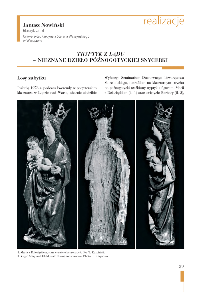 realizacje Janusz Nowiński historyk sztuki Uniwersytet Kardynała Stefana Wyszyńskiego w Warszawie TRYPTYK Z LĄDU – NIEZNANE DZIEŁO PÓŹNOGOTYCKIEJ SNYCERKI Losy zabytku Jesienią 1978 r. podczas kwerendy w pocysterskim klasztorze w Lądzie nad Wartą, obecnie siedzibie Wyższego Seminarium Duchownego Towarzystwa Salezjańskiego, natrafiłem na klasztornym strychu na późnogotycki rzeźbiony tryptyk z figurami Marii z Dzieciątkiem (il. 1) oraz świętych: Barbary (il. 2), 1. Maria z Dzieciątkiem, stan w trakcie konserwacji. Fot. T. Karpiński. 1. Virgin Mary and Child, state during conservation. Photo: T. Karpiński. 39 Katarzyny (il. 3), Mikołaja (il. 4) i Stanisława (il. 5). Podczas tej kwerendy zostały również odnalezione zrolowane płótna obrazów Adama Swacha z lat 1714-1718, zdjęte przez hitlerowców ze ścian klasztornych krużganków w 1942 r.1 Nikt z ówczesnych z proboszczów parafii na ziemi lubuskiej. Tryptyk, choć piękny, wymaga starannej renowacji”2. Zapis w Kronice… dokumentuje przywiezienie do Lądu środkowej części tryptyku – skrzyni głównej. Nie ma informacji, kiedy trafiły tu skrzydła boczne. 2. Św. Barbara, stan w trakcie konserwacji. Fot. T. Karpiński. 2. St. Barbara, state during conservation. Photo: T. Karpiński. 3. Św. Katarzyna Aleksandryjska, stan w trakcie konserwacji. Fot. T. Karpiński. 3. St. Catherine of Alexandria, state during conservation. Photo: T. Karpiński. mieszkańców klasztoru w Lądzie nie potrafił wyjaśnić, w jaki sposób to niezwykłe dzieło gotyckiej snycerki znalazło się w tym miejscu. W Kronice Wyższego Seminarium Duchownego w Lądzie odnalazłem informację, że tryptyk trafił tu w 1969 r. jako dar proboszcza jednej z parafii na ziemi lubuskiej: „W drodze powrotnej z wizytacji domów ośrodka Kaława zatrzymał się na nocleg ks. insp. Świda. Przywiózł do domu lądzkiego środkową część pięknego gotyckiego tryptyku. Jest to dar jednego W momencie znalezienia tryptyku wszystkie jego części były złożone razem – skrzynia główna nakryta skrzyniami skrzydeł bocznych, a całość okryta tkaniną. Trudno ustalić, kiedy tryptyk przestał pełnić funkcje liturgiczne. Stan, w jakim został znaleziony (o czym szerzej w dalszej części artykułu), wskazywał, że jako rzecz starą, zniszczoną, a przez to estetycznie nieatrakcyjną, usunięto go z wnętrza kościoła. Charakter zniszczeń polichromii i złoceń 40 realizacje świadczył, że zabytek był wcześniej nieodpowiednio przechowywany – w miejscu, gdzie następowały gwałtowne zmiany temperatury i wilgotności. Uszkodzenia mechaniczne konstrukcji skrzyni (m.in. wyrwanie zawiasów skrzydeł bocznych), Stan zachowania tryptyku przed konserwacją 4. Św. Mikołaj z Miry, stan w trakcie konserwacji. Fot. T. Karpiński. 4. St. Nicholas of Myra, state during conservation. Photo: T. Karpiński. 5. Św. Stanisław bp, stan w trakcie konserwacji. Fot. T. Karpiński. 5. St. Stanisław the bishop, state during conservation. Photo: T. Karpiński. powierzchni rzeźb i roślinnych ornamentów wskazywały, że tryptyk, zanim trafił do Lądu, był wielokrotnie przemieszczany i traktowany bez szczególnej atencji. Próba określenia miejsca pochodzenia tryptyku na razie nie dała pozytywnych rezultatów3. Dlatego, biorąc pod uwagę powyższe okoliczności, proponuję, aby dzieło to było określane jako Tryptyk z Lądu. na klasztornym strychu do czasu renowacji (o czym wspomina Kronika WSD w Lądzie). Skrzydła boczne były odłączone od skrzyni głównej (wyrwane zawiasy), w skrzydle z figurą św. Mikołaja brakowało zaplecka (il. 6). Drewno głównej skrzyni oraz bocznych skrzydeł było spękane, z licznymi ubytkami i śladami późniejszych napraw. Listwy ram oraz ażurowe ornamenty w zwieńczeniach skrzyń w wielu miejscach były wyłamane. Złocenia skrzyni i snycerskich ornamentów były mocno wytarte bądź odspojone Stan zachowania zabytku nie pozwalał na jego ekspozycję w Lądzie, stąd zapewne decyzja o złożeniu go 41 6. Skrzydła boczne tryptyku, stan przed konserwacją. Fot. T. Karpiński. 6. Side wings of the triptych, state before conservation. Photo: T. Karpiński. i osypane, zaś partie polichromowane ram oraz tła powyżej i poniżej powierzchni wyzłoconej przemalowane na kolor błękitny i czerwony, z licznymi rysami, odwarstwieniami i odpryskami (il. 7). Figury stały zamocowane w skrzyniach, jednak odwrócone na zewnątrz głowy stojących obok Madonny świętych dziewic oraz biskupów w skrzydłach bocznych wskazywały na ich wtórne zestawienie z zamianą miejsc (il. 8). Rzeźby tryptyku zachowały się w dobrym stanie, z wyjątkiem ubytków w ażurowych koronach Marii i świętych dziewic, braku jelca i głowni miecza przy figurze św. Katarzyny, braku prawej dłoni i pastorału w figurze św. Mikołaja oraz pastorału w figurze św. Stanisława. Złocenia szat postaci posiadały liczne drobne ubytki i odspojenia, na partiach srebrzonych, mocno sczerniałych, widoczne były ślady pierwotnych laserunków. Polichromowane partie rzeźb – dłonie i karnacje twarzy – przemalowano. Również wywinięte partie szat przemalowano na niebiesko i czerwono. Powierzchnię figur pokrywał pożółkły lakier olejny. Na rewersie skrzydła ze 42 7. Zaplecek skrzyni głównej, stan przed konserwacją. Fot. T. Karpiński. 7. Back of the main chest, state before conservation. Photo: T. Karpiński. realizacje 8. Skrzynia główna – fragment, stan przed konserwacją. Fot. T. Karpiński. 8. Main chest – fragment, state before conservation. Photo: T. Karpiński. św. Stanisławem zachowało się, nowożytne w formie, olejne malowidło prezentujące św. Szczepana na tle rozpiętej draperii (il. 9). Przebieg konserwacji Odnaleziony w 1978 r. tryptyk decyzją władz Wyższego Seminarium Duchownego w Lądzie został oddany do konserwacji. Podjął się jej łódzki konserwator Jan Potz; prace konserwatorskie trwały od maj