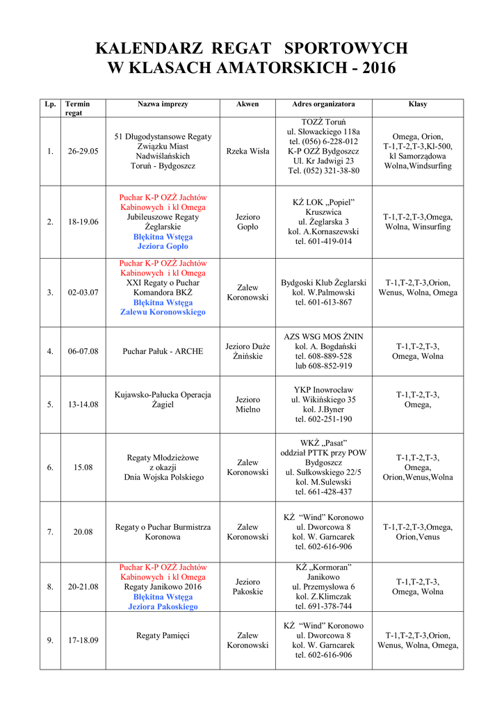 KALENDARZ REGAT SPORTOWYCH W KLASACH AMATORSKICH - 2016 Lp. 1. 2. 3. 4. 5. 6. 7. 8. 9. Termin regat Nazwa imprezy 26-29.05 51 Długodystansowe Regaty Związku Miast Nadwiślańskich Toruń - Bydgoszcz 18-19.06 Puchar K-P OZŻ Jachtów Kabinowych i kl Omega Jubileuszowe Regaty Żeglarskie Błękitna Wstęga Jeziora Gopło 02-03.07 Puchar K-P OZŻ Jachtów Kabinowych i kl Omega XXI Regaty o Puchar Komandora BKŻ Błękitna Wstęga Zalewu Koronowskiego 06-07.08 Puchar Pałuk - ARCHE 13-14.08 Kujawsko-Pałucka Operacja Żagiel Akwen Rzeka Wisła Adres organizatora TOZŻ Toruń ul. Słowackiego 118a tel. (056) 6-228-012 K-P OZŻ Bydgoszcz Ul. Kr Jadwigi 23 Tel. (052) 321-38-80 Klasy Omega, Orion, T-1,T-2,T-3,Kl-500, kl Samorządowa Wolna,Windsurfing Jezioro Gopło KŻ LOK „Popiel” Kruszwica ul. Żeglarska 3 kol. A.Kornaszewski tel. 601-419-014 T-1,T-2,T-3,Omega, Wolna, Winsurfing Zalew Koronowski Bydgoski Klub Żeglarski kol. W.Palmowski tel. 601-613-867 T-1,T-2,T-3,Orion, Wenus, Wolna, Omega Jezioro Duże Żnińskie AZS WSG MOS ŻNIN kol. A. Bogdański tel. 608-889-528 lub 608-852-919 T-1,T-2,T-3, Omega, Wolna Jezioro Mielno YKP Inowrocław ul. Wikińskiego 35 kol. J.Byner tel. 602-251-190 T-1,T-2,T-3, Omega, T-1,T-2,T-3, Omega, Orion,Wenus,Wolna 15.08 Regaty Młodzieżowe z okazji Dnia Wojska Polskiego Zalew Koronowski WKŻ „Pasat” oddział PTTK przy POW Bydgoszcz ul. Sułkowskiego 22/5 kol. M.Sulewski tel. 661-428-437 20.08 Regaty o Puchar Burmistrza Koronowa Zalew Koronowski KŻ “Wind” Koronowo ul. Dworcowa 8 kol. W. Garncarek tel. 602-616-906 T-1,T-2,T-3,Omega, Orion,Venus 20-21.08 Puchar K-P OZŻ Jachtów Kabinowych i kl Omega Regaty Janikowo 2016 Błękitna Wstęga Jeziora Pakoskiego Jezioro Pakoskie KŻ „Kormoran” Janikowo ul. Przemysłowa 6 kol. Z.Klimczak tel. 691-378-744 T-1,T-2,T-3, Omega, Wolna Zalew Koronowski KŻ “Wind” Koronowo ul. Dworcowa 8 kol. W. Garncarek tel. 602-616-906 T-1,T-2,T-3,Orion, Wenus, Wolna, Omega, 17-18.09 Regaty Pamięci