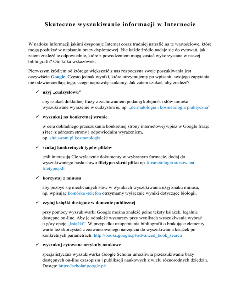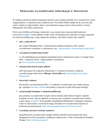Skuteczne wyszukiwanie informacji w Internecie W natłoku informacji jakimi dysponuje Internet coraz trudniej natrafić na te wartościowe, które mogą posłużyć w napisaniu pracy dyplomowej. Nie każde źródło nadaje się do cytowań, jak zatem znaleźć te odpowiednie, które z powodzeniem mogą zostać wykorzystane w naszej bibliografii? Oto kilka wskazówek: Pierwszym źródłem od którego większość z nas rozpoczyna swoje poszukiwania jest oczywiście Google. Często jednak wyniki, które otrzymujemy po wpisaniu swojego zapytania nie odzwierciedlają tego, czego naprawdę szukamy. Jak zatem szukać, aby znaleźć? użyj „cudzysłowu” aby szukać dokładnej frazy z zachowaniem podanej kolejności słów umieść wyszukiwane wyrażenie w cudzysłowie, np. „dermatologia i kosmetologia praktyczna” wyszukuj na konkretnej stronie w celu dokładnego przeszukania konkretnej strony internetowej wpisz w Google frazę: site: z adresem strony i odpowiednim wyrażeniem, np. site:swsm.pl kosmetologia szukaj konkretnych typów plików jeśli interesują Cię wyłącznie dokumenty w wybranym formacie, dodaj do wyszukiwanego hasła słowo filetype: skrót pliku np. kosmetologia stosowana filetype:pdf korzystaj z minusa aby pozbyć się niechcianych słów w wynikach wyszukiwania użyj znaku minusa, np. wpisując komórka -telefon otrzymamy wyłącznie wyniki dotyczące biologii. czytaj książki dostępne w domenie publicznej przy pomocy wyszukiwarki Google można znaleźć pełne teksty książek, legalnie dostępne on-line. Aby je odnaleźć wystarczy przy wynikach wyszukiwania wybrać u góry opcję „książki”. W przypadku uzupełniania bibliografii o brakujące elementy, warto też skorzystać z zaawansowanego narzędzia do wyszukiwania książek po konkretnych parametrach: http://books.google.pl/advanced_book_search wyszukuj cytowane artykuły naukowe specjalistyczna wyszukiwarka Google Scholar umożliwia przeszukiwanie bazy dostępnych on-line czasopism i publikacji naukowych z wielu różnorodnych dziedzin. Dostęp: https://scholar.google.pl/ Warto być świadomym, że oprócz tak potężnego narzędzia jakim jest Google w sieci istnieją również inne wyszukiwarki bardzo przydatne podczas tworzenia pracy naukowej. Poniżej krótkie zestawienie najpopularniejszych z nich: Federacja Bibliotek Cyfrowych [fbc.pionier.net.pl ] Umożliwia wyszukiwanie w sieci zasobów rozproszonych bibliotek cyfrowych i repozytoriów w Polsce. Otwórz książkę [http://otworzksiazke.pl/ ] To cyfrowa kolekcja książek naukowych polskich uczonych reprezentujących różne dziedziny wiedzy. Repozytorium Centrum Otwartej Nauki [http://depot.ceon.pl/ ] Zawiera publikacje polskich naukowców w otwartym dostępie. NUKAT [http://katalog.nukat.edu.pl ] Katalog zbiorów polskich bibliotek naukowych i akademickich. Na końcu każdego opisu dokumentu wyszukanego w bazie NUKAT znajduje się lista bibliotek udostępniających ten dokument (domyślna zakładka Gdzie wypożyczyć), a kliknięcie na nazwę biblioteki (lub znacznik biblioteki na mapie) przenosi do lokalnego katalogu i pozwala sprawdzić dostępność publikacji w danej bibliotece. IBUK [http://www.ibuk.pl/ ] Czytelnia on-line podręczników akademickich i książek naukowych w języku polskim. Za niewielką opłatą umożliwia korzystanie z elektronicznych wersji książek z różnych dziedzin nauki, opublikowanych przez czołowych polskich wydawców. LibriVox [https://librivox.org] Organizacja i serwis, który oferuje kilka tysięcy książek z domeny publicznej, czytanych przez wolontariuszy. Audiobooki dotyczą także wielu dziedzin naukowych. Projekt Gutenberg [http://www.gutenberg.org /] Udostępnia ponad 42 tysiące darmowych ebooków dostępnych w domenie publicznej, które można ściągnąć lub czytać on-line. Podręczniki Wydawnictwa OpenStax College [https://www.openstaxcollege.org/books] Bezpłatne, recenzowane podręczniki akademickie w języku angielskim wydawane przez OpenStax na Uniwersytecie Rice w USA. Na razie w ofercie znajduje się 16 podręczników z m.in. fizyki, socjologii, biologii, koncepcji biologicznych, mikro i makroekonomii, anatomii i fizjologii. W przygotowaniu kolejne. Przydatne mogą okazać się również wyszukiwarki plików w formacie PDF, np. ○ www.pdf-search-engine.com ○ www.rapid4search.com ○ www.uploadcity.com