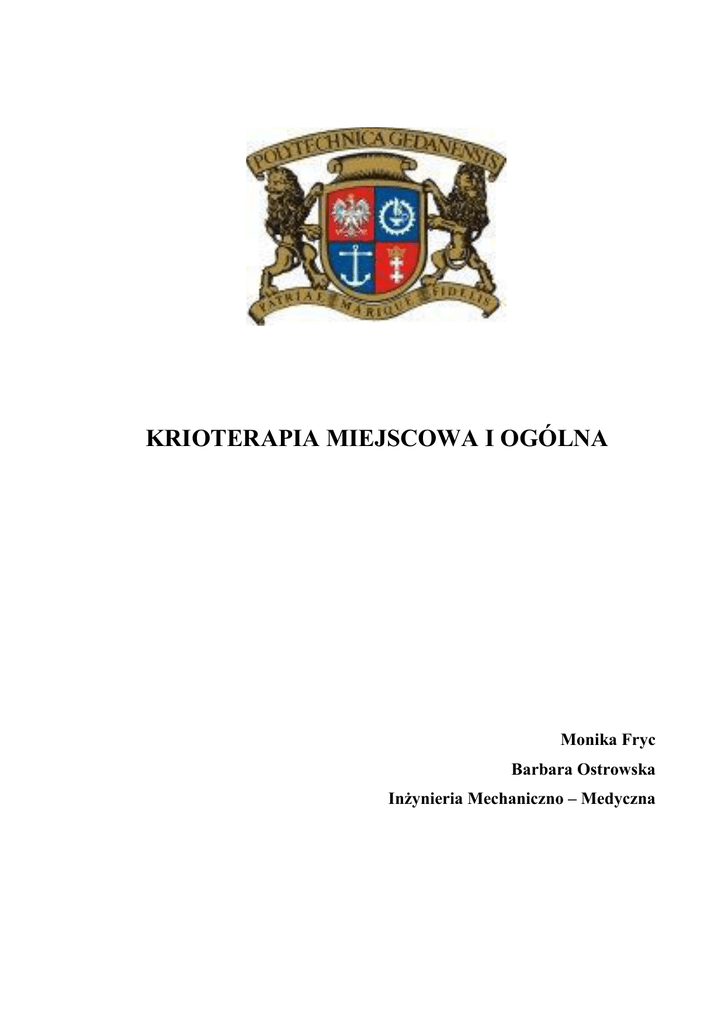 KRIOTERAPIA MIEJSCOWA I OGÓLNA Monika Fryc Barbara Ostrowska Inżynieria Mechaniczno – Medyczna 1. Definicja krioterapii „Krioterapią nazywamy zastosowanie w celach leczniczych bodźca fizykalnego obniżającego temperaturę tkanek” – prof. K. Spodaryk „Krioterapia jest nieinwazyjnym zastosowaniem krańcowo niskich temperatur schłodzonego powietrza par skroplonych gazów, lokalnie lub ogólnoustrojowo schładzających radiacyjnie powłoki ciała przez okres nie przekraczający 3-minutowej ekspozycji” [1] – prof. Z. Zagrobelny. Mimo, że druga definicja z punktu widzenia fizyki zawiera nieścisłości to chyba wszyscy autorzy są zgodni, że w kriostymulacji chodzi o „gwałtowne oziębienie, niemal wyssanie stosunkowo bardzo małych ilości ciepła z tkanek” – prof. Z Zagrobelny. Etymologia słowa krioterapia opisana jest dokładnie w pracy dr. W Gawrońskiego (Rehabilitacja 2003, 7, Nr 2). W pojawiających się pracach większość autorów kriostymulację łączy ściśle z temperaturami tzw. skrajnymi, poniżej -100°C wiedząc, że schłodzenie musi odbyć się szybko. Temperatura jest ważnym, ale nie jedynym parametrem, i użycie źródła chłodu o temperaturze -100°C nie gwarantuje właściwego efektu. Dawka zimna jest bardziej obiektywnym pojęciem, krioterapeutycznego. ale i ona nie oddaje złożoności zjawiska zabiegu 2. Rodzaje czynnika chłodniczego stosowane w krioterapii. Czynniki chłodnicze stosowane w kriostymulacji możemy podzielić na: zimno mokre, woda z lodem zimno wilgotne - zimne powietrze ( -30 ˚C ÷- 15 ˚C) zimno suche –ciekłe gazy( np. LN2: - 196 ˚C; CO2: - 75 ˚C) 3. Krioterapia miejscowa 3.1 Definicja Krioterapia miejscowa polega na przyłożeniu przy pomocy specjalnego aplikatora bardzo niskiej temperatury, która dostarczana jest do miejsca zmienionego chorobowo. Zabieg zamrażania i rozmrażania powtarza się w jednym cyklu kilkakrotnie. Doprowadza to do zamarzania zawartości komórek, pękania błon biologicznych i w konsekwencji destrukcji tkanki [2]. 3.2 Metody krioterapii miejscowej a) okłady z wykorzystaniem woreczków z lodem lub zamrożonym żelem silikonowym ew. roztworem soli (rys.3.1) - lód syntetyczny jednorazowy; - kompres; - lód syntetyczny w aerozolu; Rys.3.1 Worek z lodem syntetycznym[3] b) częściowa kąpiel w wodzie z lodem; c) masaż lodem; d) zraszanie sprayem oziębiającym (rys.3.2) - lód syntetyczny w aerozolu; Rys.3.2 Przykładowy spray oziębiający [4] e) ochładzanie metodą kontaktową - urządzenie termoelektryczne (rys 3.3); Rys 3.3 Przykładowe urządzenie termoelektryczne [5] f) nadmuch parami azotu (temperatura gazu u wylotu z dyszy może wynosić od -196st.C do -160 ˚C); g) nadmuch mieszaniną par azotu i schłodzonego powietrza atmosferycznego (temp. mieszaniny gazów u wylotu z dyszy od -178 ˚C do -100 ˚C) polega na, że strumień mieszaniny o temperaturze poniżej -100 ˚C kierowany jest na leczony odcinek narządu ruchu. Czas zabiegu wynosi od 1 do 3 minut. Można powtarzać dwukrotnie w ciągu dnia w odstępie co najmniej 6 tygodni. h) nadmuch zimnym powietrzem (temperatura gazu u wylotu z dyszy od -34 ˚C do -30 ˚C). 3.3 Efekty krioterapii miejscowej Efektem zabiegu jest długotrwałe ogrzanie wybranego fragmentu ciała, bardziej korzystne niż ogrzanie energią cieplną z zewnątrz. Po kilku godzinach zmniejszają sie obrzęki chłodzonych tkanek, poprawia się też przepływ i oczyszczanie chłonki w układzie limfatycznym. Zastosowanie bardzo niskich temperatur pozwala skrócić czas zabiegu i osiągnąć trwalszy oraz pełniejszy efekt terapeutyczny miejscowego chłodzenia. Pociąga to za sobą znaczny wzrost ukrwienia narządów wewnętrznych. Kilkugodzinne przekrwienie w obrębie tkanek sprzyja nie tylko lepszej przemianie materii, ale i eliminacji nagromadzonych tam szkodliwych produktów przemiany materii. 4. Krioterapia ogólna 4.1 Definicja Krioterapia ogólna jest to zabieg który polega na schładzaniu całego ciała parami kriogenu przez czas 2 do 3 minut. W odróżnieniu do krioterapii miejscowej, krioterapia ogólna nie powoduje niszczenia tkanek, lecz przede wszystkim zmniejszenie bólu, poprawę krążenia i przepływu krwi w organizmie, wzrost siły mięśniowej, ma także korzystny wpływ na strefę psychiczną pacjenta [6]. 4.2 Metody krioterapii ogólnej Kriokomora wolnostojąca składająca się z dwóch części (rys. 4.1): przedsionka o temperaturze - 60ºC oraz części właściwej. Gdzie temperatura jest niższa niż 100º [9]. Rys. 4.1 Schemat kriokomory wolnostojącej [7] Kriokomora wejściowo – zejściowa; w celu wykorzystania efektu zalegania chłodu kabiny zabiegowej kriokomory, schodzi się po schodach w dół (rys. 4.2) [9]. Rys. 4.2 Schemat kriokomory wejściowo - zejściowej [8] Kriokomora w formie kabiny (rys. 4.3). Stosuje się ją do ogólnej gazowej „kąpieli” kriostymulacyjnej. Kriogen oddziałuje na prawie całą powłokę skórną pacjenta (nie obejmuje głowy) [6]. Rys. 4.3 Kriokomora w formie kabiny [6] 4.3 Efekt krioterapii ogólnej Zimno działa na organizm ludzki w sposób dwufazowy. Wraz z obniżeniem temperatury skóry dochodzi do pobudzenia receptorów temperaturowych zimna przy jednoczesnym zmniejszeniu aktywności receptorów ciepła. W tabeli 1 poniżej zostały zestawione efekty działania krioterapii ogólnoustrojowej. Tab. 1. Zestawienie fizjologicznych reakcji organizmu na zimno [6, 10] W pierwszej fazie - zwężenie naczyń skóry; W drugiej fazie - rozszerzenie naczyń skóry; - zmniejszenie ukrwienia skóry (bladość, - zwiększenie ukrwienia skóry (ocieplenie ochłodzenie skóry) skóry); - powolne obniżenie temperatury skóry, mięśni, stawów; - powolny wzrost temperatury uprzednio ochłodzonych tkanek; - zmniejszenie tempa przemiany materii miejscowej i zwiększenie w części rdzennej; - zwiększenie tempa przemiany materii w części rdzennej; - zmniejszenie przewodnictwa nerwowego; - zmniejszenie napi