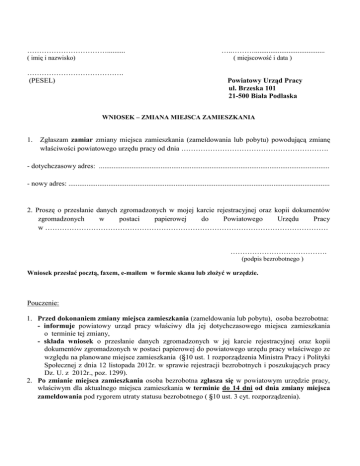 …………………………….......... ( imię i nazwisko) …..………....................................... ( miejscowość i data ) …………………………………. (PESEL) Powiatowy Urząd Pracy ul. Brzeska 101 21-500 Biała Podlaska WNIOSEK – ZMIANA MIEJSCA ZAMIESZKANIA 1. Zgłaszam zamiar zmiany miejsca zamieszkania (zameldowania lub pobytu) powodującą zmianę właściwości powiatowego urzędu pracy od dnia ……………………………………………………. - dotychczasowy adres: ............................................................................................................................... - nowy adres: ................................................................................................................................................ 2. Proszę o przesłanie danych zgromadzonych w mojej karcie rejestracyjnej oraz kopii dokumentów Pracy zgromadzonych w postaci papierowej do Powiatowego Urzędu w ……………………………………………………………………………………………………… …………………………………. (podpis bezrobotnego ) Wniosek przesłać pocztą, faxem, e-mailem w formie skanu lub złoŜyć w urzędzie. Pouczenie: 1. Przed dokonaniem zmiany miejsca zamieszkania (zameldowania lub pobytu), osoba bezrobotna: - informuje powiatowy urząd pracy właściwy dla jej dotychczasowego miejsca zamieszkania o terminie tej zmiany, - składa wniosek o przesłanie danych zgromadzonych w jej karcie rejestracyjnej oraz kopii dokumentów zgromadzonych w postaci papierowej do powiatowego urzędu pracy właściwego ze względu na planowane miejsce zamieszkania (§10 ust. 1 rozporządzenia Ministra Pracy i Polityki Społecznej z dnia 12 listopada 2012r. w sprawie rejestracji bezrobotnych i poszukujących pracy Dz. U. z 2012r., poz. 1299). 2. Po zmianie miejsca zamieszkania osoba bezrobotna zgłasza się w powiatowym urzędzie pracy, właściwym dla aktualnego miejsca zamieszkania w terminie do 14 dni od dnia zmiany miejsca zameldowania pod rygorem utraty statusu bezrobotnego ( §10 ust. 3 cyt. rozporządzenia).