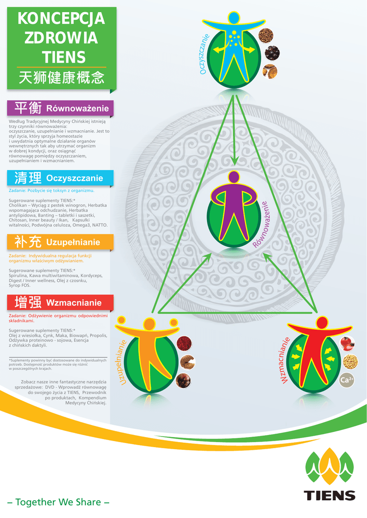 Oczyszczanie KONCEPCJA ZDROWIA TIENS 天狮健康概念 平衡 Równoważenie Wed³ug Tradycyjnej Medycyny Chiñskiej istniej¹ trzy czynniki równowa¿enia: oczyszczanie, uzupe³nianie i wzmacnianie. Jest to styl ¿ycia, który sprzyja homeostazie i uwydatnia optymalne dzia³anie organów wewnêtrznych tak aby utrzymaæ organizm w dobrej kondycji, oraz osi¹gn¹æ równowagê pomiêdzy oczyszczaniem, uzupe³nianiem i wzmacnianiem. 清理 Oczyszczanie Zadanie: Pozbycie siê toksyn z organizmu. now aże nie Sugerowane suplementy TIENS:* Cholikan – Wyci¹g z pestek winogron, Herbatka wspomagaj¹ca odchudzanie, Herbatka antylipidowa, Banting – tabletki i saszetki, Chitosan, Inner beauty / Ikan, Kapsu³ki witalności, Podwójna celuloza, Omega3, NATTO. ów 补充 Uzupełnianie R Zadanie: Indywidualna regulacja funkcji organizmu w³aściwym od¿ywianiem. Sugerowane suplementy TIENS:* Spirulina, Kawa multiwitaminowa, Kordyceps, Digest / Inner wellness, Olej z czosnku, Syrop FOS. 增强 Wzmacnianie *Suplementy powinny byæ dostosowane do indywidualnych potrzeb. Dostêpnośæ produktów mo¿e siê ró¿niæ w poszczególnych krajach. Zobacz nasze inne fantastyczne narzêdzia sprzeda¿owe: DVD - Wprowadź równowagê do swojego ¿ycia z TIENS, Przewodnik po produktach, Kompendium Medycyny Chiñskiej. − Together We Share − acniani e Wzm Sugerowane suplementy TIENS:* Olej z wiesio³ka, Cynk, Maka, Biowapñ, Propolis, Od¿ywka proteinowo - sojowa, Esencja z chiñskich daktyli. pełnianie Uzu Zadanie: Od¿ywienie organizmu odpowiednimi sk³adnikami.
