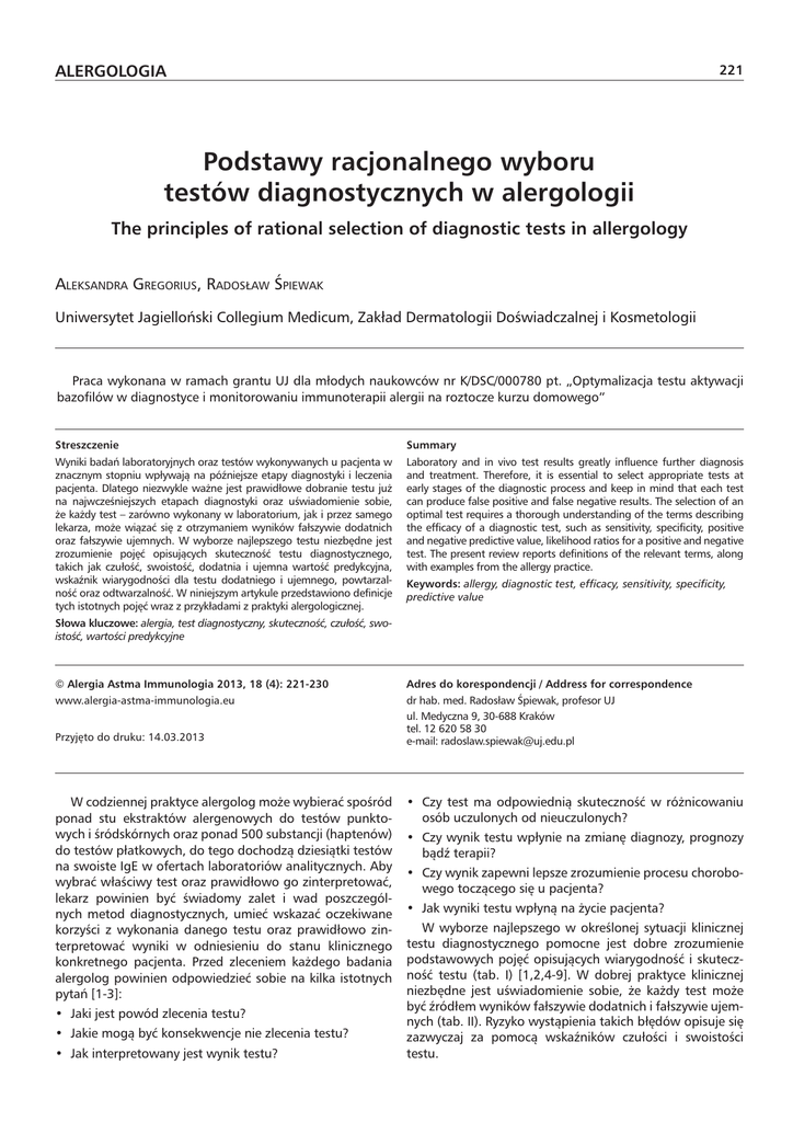 ALERGOLOGIA 221 Podstawy racjonalnego wyboru testów diagnostycznych w alergologii The principles of rational selection of diagnostic tests in allergology ALEKSANDRA GREGORIUS, RADOSŁAW ŚPIEWAK Uniwersytet Jagielloński Collegium Medicum, Zakład Dermatologii Doświadczalnej i Kosmetologii Praca wykonana w ramach grantu UJ dla młodych naukowców nr K/DSC/000780 pt. „Optymalizacja testu aktywacji bazofilów w diagnostyce i monitorowaniu immunoterapii alergii na roztocze kurzu domowego” Streszczenie Summary Wyniki badań laboratoryjnych oraz testów wykonywanych u pacjenta w znacznym stopniu wpływają na późniejsze etapy diagnostyki i leczenia pacjenta. Dlatego niezwykle ważne jest prawidłowe dobranie testu już na najwcześniejszych etapach diagnostyki oraz uświadomienie sobie, że każdy test – zarówno wykonany w laboratorium, jak i przez samego lekarza, może wiązać się z otrzymaniem wyników fałszywie dodatnich oraz fałszywie ujemnych. W wyborze najlepszego testu niezbędne jest zrozumienie pojęć opisujących skuteczność testu diagnostycznego, takich jak czułość, swoistość, dodatnia i ujemna wartość predykcyjna, wskaźnik wiarygodności dla testu dodatniego i ujemnego, powtarzalność oraz odtwarzalność. W niniejszym artykule przedstawiono definicje tych istotnych pojęć wraz z przykładami z praktyki alergologicznej. Laboratory and in vivo test results greatly influence further diagnosis and treatment. Therefore, it is essential to select appropriate tests at early stages of the diagnostic process and keep in mind that each test can produce false positive and false negative results. The selection of an optimal test requires a thorough understanding of the terms describing the efficacy of a diagnostic test, such as sensitivity, specificity, positive and negative predictive value, likelihood ratios for a positive and negative test. The present review reports definitions of the relevant terms, along with examples from the allergy practice. Keywords: allergy, diagnostic test, efficacy, sensitivity, specificity, predictive value Słowa kluczowe: alergia, test diagnostyczny, skuteczność, czułość, swoistość, wartości predykcyjne © Alergia Astma Immunologia 2013, 18 (4): 221-230 www.alergia-astma-immunologia.eu Przyjęto do druku: 14.03.2013 W codziennej praktyce alergolog może wybierać spośród ponad stu ekstraktów alergenowych do testów punktowych i śródskórnych oraz ponad 500 substancji (haptenów) do testów płatkowych, do tego dochodzą dziesiątki testów na swoiste IgE w ofertach laboratoriów analitycznych. Aby wybrać właściwy test oraz prawidłowo go zinterpretować, lekarz powinien być świadomy zalet i wad poszczególnych metod diagnostycznych, umieć wskazać oczekiwane korzyści z wykonania danego testu oraz prawidłowo zinterpretować wyniki w odniesieniu do stanu klinicznego konkretnego pacjenta. Przed zleceniem każdego badania alergolog powinien odpowiedzieć sobie na kilka istotnych pytań [1-3]: • Jaki jest powód zlecenia testu? • Jakie mogą być konsekwencje nie zlecenia testu? • Jak interpretowany jest wynik testu? Adres do korespondencji / Address for correspondence dr hab. med. Radosław Śpiewak, profesor UJ ul. Medyczna 9, 30-688 Kraków tel. 12 620 58 30 e-mail: [email protected] • Czy test ma odpowiednią skuteczność w różnicowaniu osób uczulonych od nieuczulonych? • Czy wynik testu wpłynie na zmianę diagnozy, prognozy bądź terapii? • Czy wynik zapewni lepsze zrozumienie procesu chorobowego toczącego się u pacjenta? • Jak wyniki testu wpłyną na życie pacjenta? W wyborze najlepszego w określonej sytuacji klinicznej testu diagnostycznego pomocne jest dobre zrozumienie podstawowych pojęć opisujących wiarygodność i skuteczność testu (tab. I) [1,2,4-9]. W dobrej praktyce klinicznej niezbędne jest uświadomienie sobie, że każdy test może być źródłem wyników fałszywie dodatnich i fałszywie ujemnych (tab. II). Ryzyko wystąpienia takich błędów opisuje się zazwyczaj za pomocą wskaźników czułości i swoistości testu. 222 Alergia Astma Immunologia 2013, 18 (4): 221-230 Tabela I. Definicje terminów przydatnych w określaniu skuteczności testu laboratoryjnego Termin polski Czułość Termin angielski Sensitivity Krótka definicja Zdolność testu do wykrywania osób rzeczywiście uczulonych Wzór TP (TP + FN) ×100% Swoistość (specyficzność) Specificity Dodatnia wartość predykcyjna Positive Predictive Procent pacjentów z dodatnim TP × 100% wynikiem testu, którzy rzeczywiście Value (PPV) (TP + FP) są uczuleni Procent pacjentów z ujemnym Negative TN × 100% wynikiem testu, którzy rzeczywiście predictive value (TN + FN) nie są uczuleni (NPV) Procent pacjentów prawidłowo Efficiacy (TP + TN) × 100% zakwalifikowanych przez test (Accuracy) (TP + FP + FN + TN) diagnostyczny jako uczuleni lub nieuczuleni Prawdopodobieństwo otrzymania Likelihood ratio Czułość for a positive test wyniku dodatniego testu u osoby uczulonej w stosunku do (LR+) 1 – Swoistość prawdopodobieństwa otrzymania wyniku dodatniego testu u osoby nieuczulonej Prawdopodobieństwo otrzymania Likelihood ratio 1 – Czułość for a negative test wyniku ujemnego u osoby uczulonej w stosunku do (LR-) Swoistość prawdopodobieństwa otrzymania wyniku ujemnego u osoby nieuczulonej Pojęcie arbitralne – standard Przyjmowany umownie przez „Gold standard” diagnostyczny przyjmowany, badacza jako punkt odniesienia („prawda absolutna”) W przypadku wyników o Określany za pomocą krzywych Cut-off value wartościach ciągłych: punkt, ROC (Receiver-Operator powyżej którego wynik uznajemy za Characteristics) patologiczny Clinical Relevance Znaczenie wyniku dla aktualnej choroby (problemu) pacjenta Zgodność niezależnych wyników Reproducibility oznaczenia z tego samego (Repeatability, materiału, otrzymanych za pomocą Recurrence) tej samej metody analitycznej, w identycznych waru