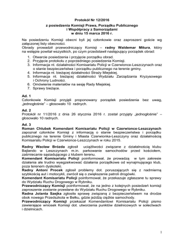Protokół Nr 12/2016 z posiedzenia Komisji Prawa, Porządku Publicznego i Współpracy z Samorządami w dniu 15 marca 2016 r. Na posiedzeniu Komisji obecni byli jej członkowie oraz zaproszeni goście wg załączonej listy obecności. Obrady prowadził przewodniczący Komisji – radny Waldemar Mitura, który na wstępie powitał wszystkich, po czym przedstawił następujący porządek obrad: 1. Otwarcie posiedzenia i przyjęcie porządku obrad. 2. Przyjęcie protokołu z poprzedniego posiedzenia Komisji. 3. Informacja nt. działalności Komisariatu Policji w Czerwionce-Leszczynach oraz o stanie bezpieczeństwa i porządku publicznego na terenie gminy. 4. Informacja nt. bieżącej działalności Straży Miejskiej. 5. Informacja nt. bieżącej działalności Wydziału Zarządzania Kryzysowego i Ochrony Ludności. 6. Omówienie materiałów na sesję Rady Miejskiej. 7. Sprawy bieżące. Ad. 1 Członkowie Komisji przyjęli proponowany porządek posiedzenia bez uwag, „jednogłośnie” – głosowało 10 radnych. Ad. 2 Protokół nr 11/2016 z dnia 26 stycznia 2016 r. został przyjęty „jednogłośnie” – głosowało 10 radnych. Ad. 3 Roman Chlubek Komendant Komisariatu Policji w Czerwionce-Leszczynach zapoznał członków Komisji z informacją o stanie bezpieczeństwa i porządku publicznego na terenie Gminy i Miasta Czerwionka-Leszczyny oraz działalnością Komisariatu Policji w Czerwionce-Leszczynach w roku 2015. Radny Wacław Brózda zgłosił uciążliwości związane z działalnością klubu Bajlando w Leszczynach m.in. parkowanie samochodów przed kościołem, zaśmiecanie sąsiadującego z klubem terenu. Komendant Komisariatu Policji poinformował, że prowadzą w tym zakresie działania ale trudno wyegzekwować działania porządkowe od wynajmującego klub, poza terenem dyskoteki. Radny Antoni Procek zgłosił problemy dot. poruszających się z nadmierną szybkością aut i motocykli, zwrócił się o zwiększenie patroli drogówki. Komendant Komisariatu Policji poinformował, że przekazuje zgłaszane tu sprawy do Wydziału Ruchu Drogowego w Rybniku. Przewodniczący Komisji poinformował, że na jedno z kolejnych posiedzeń komisji zaproszenie zostanie przesłane do Wydziału Ruchu Drogowego w Rybniku. Radna Jolanta Szejka zgłosiła sprawę związaną z bezpieczeństwem na drodze obok nowego Przedszkola w Bełku, gdzie jeżdżą ciężkie samochody. Przewodniczący Komisji przekazał Komendantowi Komisariatu Policji pismo zawierające wniosek Komisji dot. utworzenia punktów dzielnicowych w sołectwach i dzielnicach. 1 Członkowie Komisji jednogłośnie podjęli następujące wnioski: 1) wnioskowano o zaproszenie na kolejne posiedzenie w miesiącu kwietniu lub maju przedstawicieli Wydziału Ruchu Drogowego z Komendy Policji w Rybniku, 2) zwrócono się do Burmistrza Gminy i Miasta o sfinansowanie przeglądu rowerów przekazanych w użytkowanie Policji. Komendant Komisariatu Policji poinformował o zmianach kadrowych w Komisariacie w Czerwionce. Z-ca Komendanta został oddelegowany do Komisariatu w Żorach, gdzie również będzie pełnił funkcje Z-cy Komendanta, natomiast w Czerwionce od 1 kwietnia rozpocznie pracę obecny Z-ca Komendanta Komisariatu w Boguszowicach. Ad. 4 Jacek Korus Z-ca Komendanta Straży Miejskiej przedstawił zadania Straży Miejskiej oraz omówił sprawozdanie z bieżącej działalności Straży. Przewodniczący Komisji zwrócił się o interwencję w sprawie śmieci w okolicy cieku wodnego na os. Manhattan. Ad. 5 Adrian Strzelczyk Naczelnik Wydziału ZKO zapoznał z informacjami na temat działalności Wydziału Zarządzania Kryzysowego i Ochrony Ludności oraz przedstawił informację z działalności poszczególnych jednostek Ochotniczych Straży Pożarnych z terenu gminy w 2015 roku. Ad. 6 Członkowie Komisji nie zgłosili uwag do projektów uchwał zawartych w porządku obrad najbliższej sesji Rady Miejskiej. Ad. 7 Przewodniczący Komisji poinformował o akcji „Kilometry Dobra”. Radny Jan Pala zwrócił się o naprawę ogrodzenia na placu przy fontannie w Czerwionce. Radny Leszek Salamon zgłosił wymianę lustra na wyjeździe z ul. Księdza Musiała w Leszczynach. Poruszył również sprawę niszczenia elewacji budynków graffiti. Radny Wacław Brózda wrócił do tematu oświetlenia przejść dla pieszych. Komisja zwróciła się o przekazanie na kolejnym posiedzeniu informacji o realizacji wniosku dot. oświetlenia przejść dla pieszych. Na tym posiedzenie zakończono. Protokołowała: Alina Kuśka Przewodniczący Komisji radny Waldemar Mitura 2