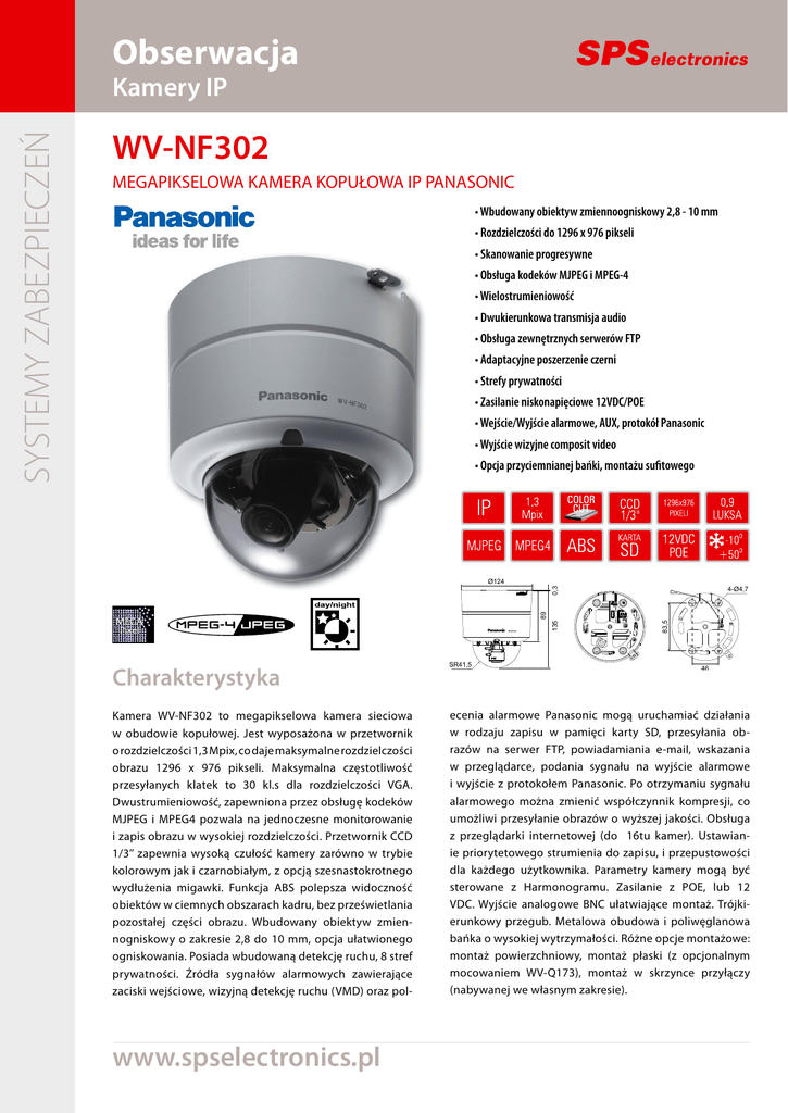 Obserwacja WV-NF302 MEGAPIKSELOWA KAMERA KOPUŁOWA IP PANASONIC • Wbudowany obiektyw zmiennoogniskowy 2,8 - 10 mm • Rozdzielczości do 1296 x 976 pikseli • Skanowanie progresywne • Obsługa kodeków MJPEG i MPEG-4 • Wielostrumieniowość • Dwukierunkowa transmisja audio • Obsługa zewnętrznych serwerów FTP • Adaptacyjne poszerzenie czerni • Strefy prywatności • Zasilanie niskonapięciowe 12VDC/POE • Wejście/Wyjście alarmowe, AUX, protokół Panasonic • Wyjście wizyjne composit video • Opcja przyciemnianej bańki, montażu sufitowego 4-Ø4,7 83,5 89 0,3 Ø124 135 SYSTEMY ZABEZPIECZEŃ Kamery IP Charakterystyka SR41,5 Kamera WV-NF302 to megapikselowa kamera sieciowa w obudowie kopułowej. Jest wyposażona w przetwornik o rozdzielczości 1,3 Mpix, co daje maksymalne rozdzielczości obrazu 1296 x 976 pikseli. Maksymalna częstotliwość przesyłanych klatek to 30 kl.s dla rozdzielczości VGA. Dwustrumieniowość, zapewniona przez obsługę kodeków MJPEG i MPEG4 pozwala na jednoczesne monitorowanie i zapis obrazu w wysokiej rozdzielczości. Przetwornik CCD 1/3’’ zapewnia wysoką czułość kamery zarówno w trybie kolorowym jak i czarnobiałym, z opcją szesnastokrotnego wydłużenia migawki. Funkcja ABS polepsza widoczność obiektów w ciemnych obszarach kadru, bez prześwietlania pozostałej części obrazu. Wbudowany obiektyw zmiennogniskowy o zakresie 2,8 do 10 mm, opcja ułatwionego ogniskowania. Posiada wbudowaną detekcję ruchu, 8 stref prywatności. Źródła sygnałów alarmowych zawierające zaciski wejściowe, wizyjną detekcję ruchu (VMD) oraz pol- ecenia alarmowe Panasonic mogą uruchamiać działania w rodzaju zapisu w pamięci karty SD, przesyłania obrazów na serwer FTP, powiadamiania e-mail, wskazania w przeglądarce, podania sygnału na wyjście alarmowe i wyjście z protokołem Panasonic. Po otrzymaniu sygnału alarmowego można zmienić współczynnik kompresji, co umożliwi przesyłanie obrazów o wyższej jakości. Obsługa z przeglądarki internetowej (do 16tu kamer). Ustawianie priorytetowego strumienia do zapisu, i przepustowości dla każdego użytkownika. Parametry kamery mogą być sterowane z Harmonogramu. Zasilanie z POE, lub 12 VDC. Wyjście analogowe BNC ułatwiające montaż. Trójkierunkowy przegub. Metalowa obudowa i poliwęglanowa bańka o wysokiej wytrzymałości. Różne opcje montażowe: montaż powierzchniowy, montaż płaski (z opcjonalnym mocowaniem WV-Q173), montaż w skrzynce przyłączy (nabywanej we własnym zakresie). www.spselectronics.pl 46 MODEL Przetwornik obrazu WV-NF302 CCD 1/3” z progresywnym skanowaniem Liczba efektywnych pikseli 1296 (H) × 976 (V) Rozmiar matrycy CCD 4,86 (H) × 3,65 (V) mm Minimalne oświetlenie Kolor: 1,5 lx przy F1.3 (szeroko., bańka przezroczysta); Cz.-b.: 0,9 lx przy F1.3 (szeroko., bańka przezroczysta) Równoważenie bieli Automatyczna przysłona Kompensacja tła (BLC) AGC AWC (2000 - 10 000 K), ATW1 (2700 - 6000 K), ATW2 (2000 - 6000 K) Outdoor (Na zewnątrz): integracja automatycznej przysłony (ALC) i migawki (ELC) (maks. 1/2000 s) Indoor (Wewnątrz): integracja automatycznej przysłony (ALC) i migawki (ELC) (maks. 1/100 s) ON (automatyczne) / OFF (z maskowaniem obszaru 8 x 6 pól) ON (niska, średnia, wysoka) / OFF Adaptacyjne rozszerzenie czerni (ABS) Elektroniczne zwiększenie czułości Tryb czarno-biały Zoom cyfrowy Wizyjna detekcja ruchu Strefy prywatności Nazwa kamery (na ekranie) Regulacja położenia przetwornika CCD Ogniskowa / Zakres ogniskowania Pole widzenia Maks. współcz. apertury Regulacja kąta w poziomie / pionie ON / OFF OFF / automatyczne (maks. 2x (2/30 s), 4x (4/30 s), 6x (6/30 s), 10x (10/30 s), 16x (16/30 s) OFF / automatyczny (bez przesuwania filtru podczerwieni) 1x, 2x, 4x, obsługiwany przez interfejs użytkownika w przeglądarce 4 obszary, czułość: 15 poziomów, wielkość detekcji: 10 poziomów do 8 stref, wypełnienie szare/mozaika Maks. 16 znaków alfanumerycznych (3 wielkości znaków do wyboru) Ręczna ze wspomaganiem ogniskowania 2,8 - 10 mm, zoom 3,6x / 1,2 m - nieskończoność H: 27,7° (teleobiektyw) - 100,3° (szerokokątny) V: 20,8° (teleobiektyw) - 73,5° (szerokokątny) 1 : 1,3 (szerokokątny) 1 : 3,1 (teleobiektyw) 180° (w prawo), 160° (w lewo) / ±75°, zakres regulacji obrotu obrazu: ±100° Sterowanie kamerą w przeglądarce Jaskrawość, funkcja dodatkowa ON / OFF, zoom (1x, 2x, 4x) Tryb wyświetlania w przeglądarce Obraz z 16 kamer może być wyświetlany na 4 ekranach 4-segmentowych (Quad) lub 1 ekranie 16-segmentowym (tylko w formacie JPEG). Każda kamera może być opisana 20-znakową nazwą Zoom cyfrowy w przeglądarce Nazwa kamery Obsługa alarmów Sygnał foniczny Język interfejsu w przeglądarce Rejestr systemowy Obsługiwane przeglądarki Interfejs sieciowy Rozdzielczość przesyłanego obrazu Kompresja obrazu Częstotliwości odświeżania obrazu Kompresja sygnału audio Tryb foniczny Maks. przepływność na kliena (MPEG-4) Obsługiwane protokoły Klient FTP Liczba użytkowników online/zarejestrowanych Karta pamięci SD (opcja) Wiadomość alarm. e-mail Harmonogram Poziom użytkownika / hosta Względy bezpieczeństwa Źródło alarmu Działania alarmowe 1x, 2x, 4x, obsługiwany przez interfejs użytkownika w przeglądarce Maksymalnie 20 znaków alfanumerycznych Manualna deaktywacja alarmu Wejście mikrofonowe: ON / OFF wyjście audio: ON / OFF Angielski, francuski, włoski, hiszpański, niemiecki, rosyjski (wymagana instalacja z wyjątkiem jęz. angielskiego) Wewnętrzny - maksymalnie 100 (wewnętrzny), karta SD - maksymalnie 4000 rejestrów błędu Microsoft Internet Explorer 6.0/7.0, Microsoft Windows Vista (32bit) / XP (32bit) 10Base-T / 100Base-TX, złącze RJ45, IEEE 802.3af; kompatybilność z PoE 1280 x 960 (JPEG) / VGA (640 x 480) / QVGA (320 x 240) MPEG-4: 3 poziomy, transmisja: UNICAST / MULTICAST, JPEG: 10 poziomów, transmisja: PULL / PUSH Podwójne strumieniowanie MPEG-4 i JPEG, obsłu