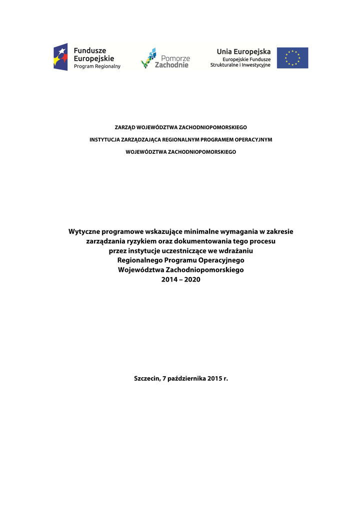 ZARZĄD WOJEWÓDZTWA ZACHODNIOPOMORSKIEGO INSTYTUCJA ZARZĄDZAJĄCA REGIONALNYM PROGRAMEM OPERACYJNYM WOJEWÓDZTWA ZACHODNIOPOMORSKIEGO Wytyczne programowe wskazujące minimalne wymagania w zakresie zarządzania ryzykiem oraz dokumentowania tego procesu przez instytucje uczestniczące we wdrażaniu Regionalnego Programu Operacyjnego Województwa Zachodniopomorskiego 2014 – 2020 Szczecin, 7 października 2015 r. SPIS TREŚCI Rozdział 1- Podstawa prawna ................................................................................................................ 3 Rozdział 2- Cel wytycznych .................................................................................................................... 4 Rozdział 3- Zasady wewnętrzne zapewniające prawidłowe przeprowadzenie oceny ryzyka ............. 4 Rozdział 4- Obowiązek wprowadzania koniecznych zmian w procedurach ........................................ 5 Rozdział 5- Ocena ryzyka w przypadku wprowadzenia zmian systemowych ...................................... 5 2 Wykaz skrótów IP − Instytucja Pośrednicząca RPO WZ (WUP/WFOŚiGW/SSOM/GMK) IZ − Instytucja Zarządzająca RPO WZ RPO WZ − Regionalny Program Operacyjny Województwa Zachodniopomorskiego 2014 – 2020 Słownik pojęć Użyte w wytycznych pojęcia oznaczają: 1. Rozporządzenie ogólne 1303/2013- ,rozporządzenie Parlamentu Europejskiego i Rady (UE) nr 1303/2013, z dnia 17 grudnia 2013 r. ustanawiające wspólne przepisy dotyczące Europejskiego Funduszu Rozwoju Regionalnego, Europejskiego Funduszu Społecznego, Funduszu Spójności, Europejskiego Funduszu Rolnego na rzecz Rozwoju Obszarów Wiejskich oraz Europejskiego Funduszu Morskiego i Rybackiego oraz ustanawiające przepisy ogólne dotyczące Europejskiego Funduszu Rozwoju Regionalnego, Europejskiego Funduszu Społecznego, Funduszu Spójności i Europejskiego Funduszu Morskiego i Rybackiego oraz uchylające rozporządzenie Rady (WE) nr 1083/20061. 2. Ustawia o f.p., - należy przez to rozumieć ustawę o finansach publicznych z dnia 27 sierpnia 2009 r. (Dz. U. z 2009 r. Nr. 157 poz. 1240 z późn. zm.). 3. Komunikat nr 6 MF- Komunikat nr 6 Ministra Finansów z dnia 6 grudnia 2012 r. w sprawie szczegółowych wytycznych dla sektora finansów publicznych w zakresie planowania i zarządzania ryzykiem wydany na podstawie art. 69 ust. 4 ustawy z dnia 27 sierpnia 2009 r. o finansach publicznych (Dz. U. Nr 157, poz. 1240, z późn. zm.), który określa szczegółowe wytyczne w zakresie planowania działalności i zarządzania ryzykiem dla jednostek sektora finansów publicznych. 4. Porozumienie- właściwe Porozumienie zwarte pomiędzy IZ i IZ/IP na postawie, którego IZ powierzyła określone zadania IZ/IP zgodnie z art. 10 ust. 1 ustawy wdrożeniowej. Rozdział 1- Podstawa prawna 1) Art. 7 ust. 1 ustawy z dnia 11 lipca 2014 r. o zasadach realizacji programów w zakresie polityki spójności finansowanych w perspektywie finansowej 2014-20202, 2) Art. 69 ustawy o f.p., 3) Ustawa z dnia 17 grudnia 2004 r. o odpowiedzialności za naruszenie dyscypliny finansów publicznych (Dz.U. 2005 nr 14 poz. 114 z późn. zm.), 4) Komunikat Nr 23 Ministra Finansów z dnia 16 grudnia 2009 r. w sprawie standardów kontroli zarządczej dla sektora finansów publicznych (Dz. Urz. MF Nr 15, poz. 84), 1 2 Dz. Urz. UE L 347/320 z dnia 20.12.2013 r. Dz. U. 2014, poz.1146 z późn. zm. 3 5) Komunikat Nr 3 Ministra Finansów z dnia 16 lutego 2011 r. w sprawie szczegółowych wytycznych w zakresie samooceny kontroli zarządczej dla jednostek sektora finansów publicznych (Dz. Urz. MF Nr 2, poz. 11), 6) Komunikat nr 6 MF Rozdział 2- Cel wytycznych 1) Niniejsze Wytyczne są skierowane do wszystkich instytucji uczestniczących we wdrażaniu RPO WZ. 2) Celem przedmiotowych wytycznych jest wskazanie szczegółowych obowiązków dla IZ/IP dotyczących procesu zarządzania ryzykiem w związku z realizowanymi przez daną instytucję zadaniami w zakresie wdrażania RPO WZ. Regulacje te mają za zadanie wskazać minimalne wymagania względem instytucji uczestniczących we wdrażaniu RPO WZ w zakresie zarządzania ryzykiem oraz dokumentowania tego procesu w celu spełnienia i zachowania kryteriów desygnacji, o jakich mowa w pkt 2 Załącznika XIII do rozporządzenia ogólnego 1303/2013. Rozdział 3- Zasady wewnętrzne zapewniające prawidłowe przeprowadzenie oceny ryzyka 1) Zgodnie z art. 69 ust. 1 pkt 3 ustawy o f.p. kierownicy jednostek są zobowiązani do zapewnienia funkcjonowania adekwatnej, skutecznej i efektywnej kontroli zarządczej. W tym zakresie powinni stosować w ramach kierowanych przez siebie jednostek model zarządzania ryzykiem, który jak wskazano w Komunikacie nr 6 MF jest jednym z elementów kontroli zarządczej. 2) Analiza ryzyka powinna być przeprowadzana przynajmniej jeden raz w roku, a wyniki tej analizy, w zakresie zadań związanych z wdrażaniem RPO WZ powinny być udostępnione IZ do dnia 31 października każdego roku, do roku 2024 włącznie. 3) IZ akceptuje przyjęty przez IP model zarządzania ryzykiem, o ile jest on zgodny z Komunikatem nr 6 MF. 4) IZ/IP powinna zastosować funkcjonujący w ramach jednostki model zarządzania ryzykiem odpowiednio do zadań jej powierzonych w związku z wdrażaniem RPO WZ. Zaleca się, aby przeprowadzić ocenę, identyfikację i analizę ryzyka w ramach wszystkich zadań realizowanych/powierzonych odpowiednio danej IZ/IP i właściwie ją udokumentować zgodnie ze stosowanymi w danej IZ/IP zasadami zarządzania ryzykiem. 5) Z uwagi na specyfikę zadań związanych z wdrażaniem RPO WZ w proces identyfikacji, analizy i oceny ryzyka powinni być zaangażowani pracownicy IZ/IP odpowiedzialni za realizację wyznaczonych celów tj. pracownicy posiadający adekwatną wiedzę i doświadczenie w obszarze powierzonych zadań. 6) W przypadku braku odpowiedniej kadry merytorycznej lub braku możliwości organizacyjnych wynikających w szczególności z realizacji bieżących obowi