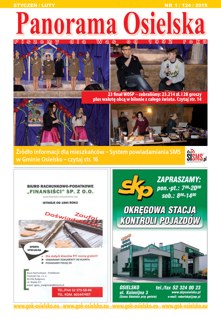 NR 1 / 124 / 2015 STYCZEŃ / LUTY Panorama Osielska P i s z e m y d l a W a s o d 1 9 9 2 r o k u 23 finał WOŚP – zebraliśmy: 23.214 zł. i 28 groszy plus walutę obcą w bilonie z całego świata. Czytaj str. 14 Źródło informacji dla mieszkańców - System powiadamiania SMS w Gminie Osielsko - czytaj str. 16 www.gok-osielsko.eu www.gok-osielsko.eu 1 www.gok-osielsko.eu www.gok-osielsko.eu NR 1/2015 Panorama Osielska MIESZKAŃCY Osielskie i nie tylko pokrzywki - Czy warto w Osielsku budować place zabaw? Akty wandalizmu na ulicy Wierzbowej były wiele razy przeze mnie opisane. Nasz konserwator systematycznie wykonuje pracę Syzyfa za publiczne pieniądze. Już w styczniu pan Tomasz miał ławkę do naprawy i usunął kilka butelek po alkoholu. Jak widać lokalne pijaczki to stworzenia mrozoodporne. Policji sprawców nie udało się schwytać, przedtem Straży Gminnej. Mieszkańcy też nie mają szczęścia by widzieć pijaństwo i niszczenie mienia. Zgłaszają fakty dopiero po ich zaistnieniu. Ostatnio młodzieżowy lumpenproletariat upodobał sobie plac zabaw przy Irysowej. Najpierw w stawku wylądowały trzy szpule po kablach, połamano drabinki, rozwalono zamki w bramie, furtce. Szkody zostały usunięte. I znów procedury powtórzyły się: butelki po alkoholu, wyrwane zamki w furtce i bramie. Naprawa konserwatora. Tym razem poprosiłem, by na zimowy czas założył łańcuchy i kłódki. Schematu ciąg dalszy. Mieszkańcy sprawców nie widzieli. Policja też. Najprawdopodobniej byli to dobrze wyszkoleni ninja nasłani przez yakuzę. A może załóżmy monitoring na placach zabaw? Posadźmy pracownika ochrony na 24 h przed kamerkami. Dojdźmy do takiego absurdu jak w USA, gdzie na ochronę szkół wydaje się więcej niż na pomoce naukowe. Przykład ze „złotej młodzieży” wzięły też zwierzęta. Dziki upodobały sobie plac zabaw w Osielsku przy ulicy Zatokowej. Zryły dokładnie tam trawniki. A można inaczej. Uszkodzono piękne klony i zniszczono ledwo co postawiony płot oddzielający plac zabaw od szosy. Tym razem dzięki pracy policji i współpracy z nią mieszkańców znaleziono sprawcę. Będzie miał sprawę. Wyrok jaki dostanie, po uprawomocnieniu go, podamy w Panoramie Osielska wraz z inicjałami sprawcy. Marzy mi się osobiście, aby sąd w sentencji wyroku zawarł fragment, że można podać imię i nazwisko sprawcy w prasie. Chuliganom przypominam, że sąd ma taką możliwość. + Wyszedłem przed Urząd Gminy było późno i poczułem się jakbym był na bulwarze w Międzyzdrojach. Piękne lampy rozświetlały noc. Później pojawiły się jeszcze donice na kwiaty, ławki ze stali nierdzewnej i kosze na śmieci, podświetlany napis Urząd Gminy z herbem. Tylko GOK z zewnątrz pasował do bratniej instytucji jak kastet do ust. Nie martwmy się, to z pewnością w najbliższych latach się zmieni. Tego sobie i gminie życzę w Nowym Roku Marek Manuszewski Pismo redagowane w Gminnym Ośrodku Kultury w Osielsku Adres redakcji: Gminny Ośrodek Kultury w Osielsku, 86-031 Osielsko, ul. Szosa Gdańska 57, tel. 52 38 13 567, fax 52 320 32 41 Redaguje zespół: Marek Manuszewski, Piotr Wizimirski, Maria Domańska. Skład i druk: MULTIGRAF s.c. ELLERT, TOMCZUK, Bydgoszcz, tel./fax 52 340 41 37, www.multigrafdruk.pl Redakcja nie ponosi odpowiedzialności za treść artykułów, które są podpisane nazwiskiem autora. Ponadto redakcja zastrzega sobie prawo do nie drukowania wszystkich nadesłanych materiałów. Materiały do następnego numeru „Panoramy” prosimy dostarczać do 20.03.2015 r. Gazetę Panorama Osielska można pobrać na stronach:http://www.gok-osielsko.eu/ (w zakładce do pobrania), oraz http://www.powiat.bydgoski.pl/. Strony które warto odwiedzać: http://www.gok-osielsko.eu/ Ponadto GOK Osielsko jest na facebook: facebook.com/GOK.OSIELSKO NR 1/2015 2 MIESZKAŃCY/REKLAMA K Ą C I K M E D Y Panorama Osielska C Z N Y – zainstalujmy filtr do wody pitnej, – wietrzmy często pomieszczenia, w których przebywamy. Pamiętajmy, że istnieją ćwiczenia, które mogą prowokować bóle głowy u migrenowców, np. step-aerobik (duży wpływ na odcinek szyjny kręgosłupa i tętnice podstawne). Wówczas albo odpowiednio dozujmy ten rodzaj ćwiczeń, albo zamieńmy go na inne ćwiczenia. Bardzo krótki i intensywny wysiłek jest najczęściej również winowajcą bólów głowy. Migrena – co ją wywołuje i jak z nią walczyć. Kogo z nas nie bolała kiedyś głowa? Jednak nie każdy ból głowy to migrena. Wiedzą o tym doskonale ludzie cierpiący na tę przykrą dolegliwość, szczególnie, jeśli występuje ona ponad 4–5 raz w miesiącu – to już dramat. Są różne rodzaje migren i u każdego z chorych mogą przebiegać odmiennie, więc trudno o porównywanie i jednoznaczne diagnozy. Badacze sądzą, że bóle migrenowe związane są z zaburzonym przepływem krwi do mózgu, tętnice najpierw kurczą się, potem rozszerzają. Migreny rodzą się w pniu mózgu i w patomechanizmie dochodzi do zmian nerochemicznych w mózgu. Niestety istnieje dziedziczność migreny (związek z chromosomem 19) – szczególnie w przypadku migreny hemiplegicznej – czasowe porażenie połowy głowy, niekiedy jednej połowy ciała. Istnieje migrena oczna (ból rozpoczyna się za gałką oczną), migrena brzuszna – imitująca głównie ból brzucha, potem dochodzi ból głowy i wymioty oraz inne rodzaje migren. Są oczywiście odpowiednie leki typu tryptany czy silne niesterydowe leki przeciwzapalne, ale powinny być stosowane po pierwsze po zdiagnozowaniu migreny (badanie EEG, konsultacja neurologiczna), po drugie ich stosowanie i dawkowanie musi być pod kontrolą lekarską. Niestety migrenowcy często nadużywają leków przeciwbólowych ze względu na częste nieustępujące bóle głowy. Przybliżę czynniki często wywołujące migrenę: orzeszki, czerwone wino, sery żółte i pleśniowe (dojrzewające), produkty zawierające glutaminian sodu lub potasu lub 
