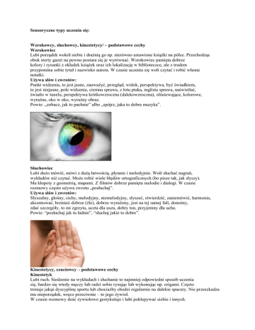 Sensoryczne typy uczenia się: Wzrokowcy, słuchowcy, kinestetycy/ – podstawowe cechy Wzrokowiec Lubi porządek wokół siebie i drażnią go np. nierówno ustawione książki na półce. Przechodząc obok sterty gazet na pewno postara się je wyrównać. Wzrokowiec pamięta dobrze kolory i rysunki z okładek książek oraz ich lokalizację w biblioteczce, ale z trudem przypomina sobie tytuł i nazwisko autora. W czasie uczenia się woli czytać i robić własne notatki. Używa słów i zwrotów: Punkt widzenia, to jest jasne, zauważyć, przegląd, widok, perspektywa, być świadkiem, to jest niejasne, pole widzenia, ciemna sprawa, z lotu ptaka, mglista sprawa, naświetlać, światło w tunelu, perspektywa krótkowzroczna (dalekowzroczna), olśniewające, kolorowe, wyraźne, oko w oko, wyraźny obraz. Powie: „zobacz, jak to pachnie” albo „spójrz, jaka to dobra muzyka”. Słuchowiec Lubi dużo mówić, mówi z dużą łatwością, płynnie i melodyjnie. Woli słuchać nagrań, wykładów niż czytać. Może robić wiele błędów ortograficznych (bo pisze tak, jak słyszy). Ma kłopoty z geometrią, mapami. Z filmów dobrze pamięta melodie i dialogi. W czasie rozmowy często używa zwrotu „posłuchaj”. Używa słów i zwrotów: Słyszalny, głośny, cichy, melodyjny, niemelodyjny, słyszeć, stwierdzić, zaniemówić, harmonia, akcentować, brzmieć dobrze (źle), dobrze wyrażony, jest na tej samej fali, donośny, zdać szczegóły, to mi zgrzyta, uczta dla uszu, dobry ton, przyjemny dla ucha. Powie: “posłuchaj jak tu ładnie”, “słuchaj jakie to dobre”. Kinestetycy, czuciowcy – podstawowe cechy Kinestetyk Lubi ruch. Siedzenie na wykładach i słuchanie to najmniej odpowiedni sposób uczenia się, bardzo się wtedy męczy lub radzi sobie rysując lub wykonując np. origami. Często trenuje jakąś dyscyplinę sportu lub chociażby chodzi regularnie na dalekie spacery. Nie przeszkadza mu nieporządek, wręcz przeciwnie – to jego żywioł. W czasie rozmowy dość żywiołowo gestykuluje i lubi poklepywać siebie i innych. Używa słów i zwrotów: Naładowany, emocjonalny, czuję, płynę, to mnie porusza, mam przeczucie, czuję nacisk, napięcie, niepokój, to ma dobry smaczek, śliska sprawa, mocna podstawa, w gorącej wodzie kąpany, gorący temat, targany sprzecznościami. Czuciowiec (“odmiana” kinestetyka) To osoba, która jest raczej spokojna, wyciszona, empatyczna i wrażliwa. Lubi myśleć, snuć refleksje, zastanawiać się. Mówi cicho, spokojnie. Silnie wszystko przeżywa. Ma bogate życie emocjonalne. Używa słów i zwrotów: czuję, mam wrażenie, mam poczucie, odczuwam. Uwaga: W tym miejscu warto dodać, iż są ludzie, którzy rzadko posługują się językiem zmysłów, a także takie sytuacje, kiedy tego języka się nie wykorzystuje (np. naukowe dysertacje). Mamy wtedy do czynienia z tzw. językiem intelektualnym – językiem neutralnym sensorycznie. Charakterystyczne słowa i zwroty: myśleć, rozumieć, wiedzieć, poznawać, doświadczać, wierzyć, uczyć się, pamiętać, zmieniać, zdawać sobie sprawę, rozwijać się, analizować, wybierać, interpretować, kojarzyć, porównać, oceniać, zastanawiać się. LINK DO ARTYKUŁU: http://www.eid.edu.pl/_upload/file/atlasdemo.pdf Preferencje sensoryczne Preferencje sensoryczne to nasze naturalne nawykowe sposoby reagowania. Jak większość dyspozycji człowieka, mogą być rozwijane i uwrażliwiane, tak aby w efekcie świadomych działań edukacyjnych (ze strony nauczyciela) i działań samokształceniowych (czyli podejmowanych przez ucznia) uzyskać obraz możliwie wszechstronny. W tym wypadku znaczy to świadome poszerzanie pola percepcji (pełne VAK) i poszerzanie możliwości uczenia się! Na czym to polega w praktyce? Na świadomym dobieraniu metod nauczania, które aktywizują równomiernie poszczególne modalności zmysłowe. Preferowany system sensoryczny ma wielki wpływ na oceny uzyskiwane przez uczniów, zarówno ustne, jak i pisemne. LINK: http://www.google.pl/url?q=https://www.ore.edu.pl/component/phocadownload/category/89mini-kursy-dla-ucznia-zdolnego%3Fdownload%3D173:pami-i-mnemotechniki.-sposoby-uczeniasi&sa=U&ved=0CCUQFjADahUKEwix5cKUld3HAhVQR9sKHS2ODZc&usg=AFQjCNHzanKYn6 zW-cuNR72HXc2wsvVhPA METODY UCZENIA SIĘ DLA POSZCZEGÓLNYCH TYPÓW SENSORYCZNYCH: 1) Wzrokowcy: • • • • • • Potrzebuje obrazków Chętniej czyta samodzielnie niż słucha Pisze ładnie, prawidłowo, widzi obraz słowa Czyta bardzo dobrze i szybko Pismo ładne i wyraźne Woli robić notatki • • • Koncentrację zaburza nieporządek i ruch Gdy się nudzi, patrzy w dal, rysuje, znajduje coś do oglądania Uczą się poprzez patrzenie, czytanie, obserwację lub demonstrację 2) Słuchowcy: • • • • • • • • • • Uczy się poprzez słuchanie Chętnie bierze udział w dyskusji Pisze tak, jak słyszy, może mieć kłopoty z ortografią Czyta powoli, ponieważ jednocześnie mówi do siebie Lepszy w mówieniu niż w pisaniu Woli powtarzać na głos Łatwo traci koncentrację z powodu hałasu Nuci, mówi do siebie lub innych Formy uczenia się: Poprzez aktywne przysłuchiwanie się, słuchanie siebie lub innych 3) Kinestetycy: • • • • • • • • • • Uczy się poprzez działanie Ważny jest ruch, podczas czytania „wierci się” Przetwarza litery na ruchy, musi wielokrotnie napisać słowo , aby je zapamiętać Nie bardzo lubi czytać, preferuje opisy z akcją Pismo mało czytelne lub specyficzne Najlepiej pamięta to co wykona Aby się koncentrować musi się ruszać Wierci się zmienia pozycję, znajduje coś do trzymania, stukania, obracania Formy uczenia się: Poprzez wykonywanie i bezpośrednie zaangażowanie: doświadczenie i eksperymenty Model sensoryczny - właściwy nam sposób odbierania i reagowania na informacje przekazane kanałem wzrokowym, słuchowym i kinestetycznym. Na co dzień posługujemy się wszystkimi trzema systemami sensorycznymi tj 