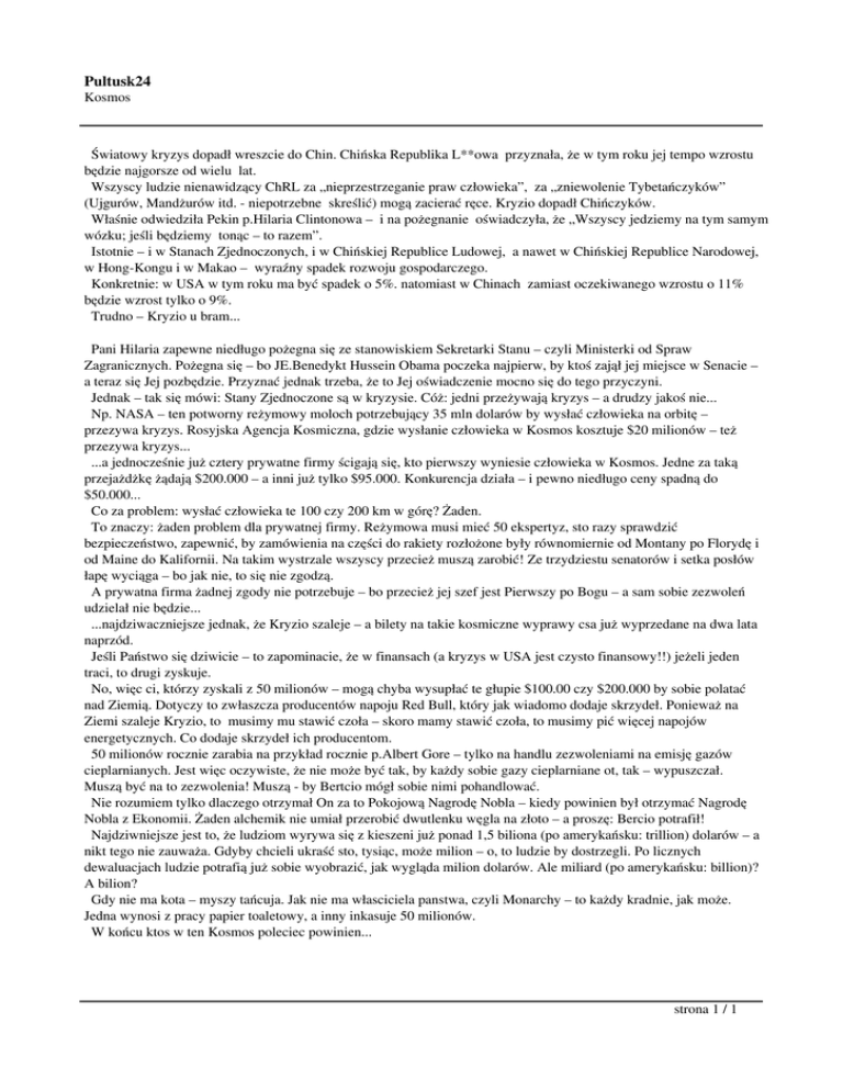 Pultusk24 Kosmos Światowy kryzys dopadł wreszcie do Chin. Chińska Republika L**owa przyznała, że w tym roku jej tempo wzrostu będzie najgorsze od wielu lat. Wszyscy ludzie nienawidzący ChRL za „nieprzestrzeganie praw człowieka”, za „zniewolenie Tybetańczyków” (Ujgurów, Mandżurów itd. - niepotrzebne skreślić) mogą zacierać ręce. Kryzio dopadł Chińczyków. Właśnie odwiedziła Pekin p.Hilaria Clintonowa – i na pożegnanie oświadczyła, że „Wszyscy jedziemy na tym samym wózku; jeśli będziemy tonąc – to razem”. Istotnie – i w Stanach Zjednoczonych, i w Chińskiej Republice Ludowej, a nawet w Chińskiej Republice Narodowej, w Hong-Kongu i w Makao – wyraźny spadek rozwoju gospodarczego. Konkretnie: w USA w tym roku ma być spadek o 5%. natomiast w Chinach zamiast oczekiwanego wzrostu o 11% będzie wzrost tylko o 9%. Trudno – Kryzio u bram... Pani Hilaria zapewne niedługo pożegna się ze stanowiskiem Sekretarki Stanu – czyli Ministerki od Spraw Zagranicznych. Pożegna się – bo JE.Benedykt Hussein Obama poczeka najpierw, by ktoś zajął jej miejsce w Senacie – a teraz się Jej pozbędzie. Przyznać jednak trzeba, że to Jej oświadczenie mocno się do tego przyczyni. Jednak – tak się mówi: Stany Zjednoczone są w kryzysie. Cóż: jedni przeżywają kryzys – a drudzy jakoś nie... Np. NASA – ten potworny reżymowy moloch potrzebujący 35 mln dolarów by wysłać człowieka na orbitę – przezywa kryzys. Rosyjska Agencja Kosmiczna, gdzie wysłanie człowieka w Kosmos kosztuje $20 milionów – też przezywa kryzys... ...a jednocześnie już cztery prywatne firmy ścigają się, kto pierwszy wyniesie człowieka w Kosmos. Jedne za taką przejażdżkę żądają $200.000 – a inni już tylko $95.000. Konkurencja działa – i pewno niedługo ceny spadną do $50.000... Co za problem: wysłać człowieka te 100 czy 200 km w górę? Żaden. To znaczy: żaden problem dla prywatnej firmy. Reżymowa musi mieć 50 ekspertyz, sto razy sprawdzić bezpieczeństwo, zapewnić, by zamówienia na części do rakiety rozłożone były równomiernie od Montany po Florydę i od Maine do Kalifornii. Na takim wystrzale wszyscy przecież muszą zarobić! Ze trzydziestu senatorów i setka posłów łapę wyciąga – bo jak nie, to się nie zgodzą. A prywatna firma żadnej zgody nie potrzebuje – bo przecież jej szef jest Pierwszy po Bogu – a sam sobie zezwoleń udzielał nie będzie... ...najdziwaczniejsze jednak, że Kryzio szaleje – a bilety na takie kosmiczne wyprawy csa już wyprzedane na dwa lata naprzód. Jeśli Państwo się dziwicie – to zapominacie, że w finansach (a kryzys w USA jest czysto finansowy!!) jeżeli jeden traci, to drugi zyskuje. No, więc ci, którzy zyskali z 50 milionów – mogą chyba wysupłać te głupie $100.00 czy $200.000 by sobie polatać nad Ziemią. Dotyczy to zwłaszcza producentów napoju Red Bull, który jak wiadomo dodaje skrzydeł. Ponieważ na Ziemi szaleje Kryzio, to musimy mu stawić czoła – skoro mamy stawić czoła, to musimy pić więcej napojów energetycznych. Co dodaje skrzydeł ich producentom. 50 milionów rocznie zarabia na przykład rocznie p.Albert Gore – tylko na handlu zezwoleniami na emisję gazów cieplarnianych. Jest więc oczywiste, że nie może być tak, by każdy sobie gazy cieplarniane ot, tak – wypuszczał. Muszą być na to zezwolenia! Muszą - by Bertcio mógł sobie nimi pohandlować. Nie rozumiem tylko dlaczego otrzymał On za to Pokojową Nagrodę Nobla – kiedy powinien był otrzymać Nagrodę Nobla z Ekonomii. Żaden alchemik nie umiał przerobić dwutlenku węgla na złoto – a proszę: Bercio potrafił! Najdziwniejsze jest to, że ludziom wyrywa się z kieszeni już ponad 1,5 biliona (po amerykańsku: trillion) dolarów – a nikt tego nie zauważa. Gdyby chcieli ukraść sto, tysiąc, może milion – o, to ludzie by dostrzegli. Po licznych dewaluacjach ludzie potrafią już sobie wyobrazić, jak wygląda milion dolarów. Ale miliard (po amerykańsku: billion)? A bilion? Gdy nie ma kota – myszy tańcuja. Jak nie ma własciciela panstwa, czyli Monarchy – to każdy kradnie, jak może. Jedna wynosi z pracy papier toaletowy, a inny inkasuje 50 milionów. W końcu ktos w ten Kosmos poleciec powinien... strona 1 / 1