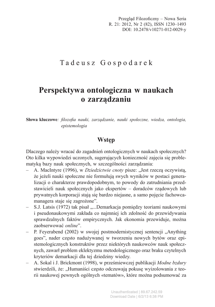 Przegląd Filozoficzny – Nowa Seria R. 21: 2012, Nr 2 (82), ISSN 1230–1493 DOI: 10.2478/v10271-012-0029-y Ta d e u s z G o s p o d a r e k Perspektywa ontologiczna w naukach o zarządzaniu Słowa kluczowe: filozofia nauki, zarządzanie, nauki społeczne, wiedza, ontologia, epistemologia Wstęp Dlaczego należy wracać do zagadnień ontologicznych w naukach społecznych? Oto kilka wypowiedzi uczonych, sugerujących konieczność zajęcia się problematyką bazy nauk społecznych, w szczególności zarządzania: – A. MacIntyre (1996), w Dziedzictwie cnoty pisze: „Jest rzeczą oczywistą, że jeżeli nauki społeczne nie formułują swych wyników w postaci generalizacji o charakterze prawdopodobnym, to powody do zatrudniania przedstawicieli nauk społecznych jako ekspertów – doradców rządowych lub prywatnych korporacji stają się bardzo niejasne, a samo pojęcie fachowcamanagera staje się zagrożone”. – S.J. Latsis (1972) tak pisał „...Demarkacja pomiędzy teoriami naukowymi i pseudonaukowymi zakłada co najmniej ich zdolność do przewidywania sprawdzalnych faktów empirycznych. Jak ekonomia przewiduje, można zaobserwować online”. – P. Feyerabend (2002) w swojej postmodernistycznej sentencji „Anything goes”, nader często nadużywanej w tworzeniu nowych bytów oraz epistemologicznych konstruktów przez niektórych naukowców nauk społecznych, zawarł problem eklektyzmu metodologicznego oraz braku czytelnych kryteriów demarkacji dla tej dziedziny wiedzy. – A. Sokal i J. Brickmont (1998), w prześmiewczej publikacji Modne bzdury stwierdzili, że: „Humaniści często odczuwają pokusę wyizolowania z teorii naukowej pewnych ogólnych «tematów», które można podsumować za Unauthenticated | 89.67.242.59 Download Date | 6/2/13 6:38 PM 182 Tadeusz Gospodarek pomocą kilku słów, takich jak: «nieoznaczoność», «nieciągłość», «chaos» lub «nieliniowość», a następnie analizowania ich w czysto werbalny sposób”. – L. Laudan, (1998) już w roku 1980 ogłosił „śmierć” problemu demarkacji w naukach społecznych, co w powiązaniu z trudnością budowania kryteriów prawdziwości sądów o faktach daje obraz multidyscyplinarnego obszaru wiedzy naukowej o znacznym stopniu złożoności, poważnie nieuporządkowanej epistemologicznie. – G. Stigler (1965) uważa, że teorie ekonomiczne powinny być weryfikowalne przez trzy kryteria: związek z realnością, ogólność i łatwość w zastosowaniu. Jest to wyraźna wskazówka noblisty w odniesieniu do tworzonej wiedzy – związek z rzeczywistością oraz zdrowym rozsądkiem, nawiązujący wyraźnie do Wittgensteinowskiej koncepcji ontologicznej. – L. Wittgenstein (1922) przekonywał, że filozofia powinna myśli nieprzejrzyste i rozmyte uczynić jasnymi i wyznaczyć im ostre granice. Należy zauważyć, że rozwój każdej nauki zaczyna się od stwierdzenia napięcia pomiędzy zdolnością wyjaśniającą teorii a obserwacją rzeczywistości. Dotyczy to zwłaszcza takich młodych, przedparadygmatycznych nauk, jak nauki społeczne czy nauki o zarządzaniu. Wówczas filozofia, logika, aksjologia, a zwłaszcza metody filozofii nauki powinny wkroczyć do pracowni uczonych w celu dokonania uporządkowania temporalnych teorii deskryptywnych i utworzenia systemu zdań bazowych dla dalszych wnioskowań oraz budowania kryteriów prawdziwości sądów i teorii wyjaśniających (Gospodarek 2012). Jest to równocześnie zbiór tematów badawczych i poznawczych, umożliwiający zastąpienie teorii słabszej przez teorię lepszą (Watkins 1989: 29). Bez spojrzenia ontologicznego oraz eklektyzmu epistemologicznego nie wydaje się to jednak realne. Zwłaszcza budowanie porządku metodologicznego i reprezentacji numerycznych bez dobrego zakotwiczenia ontologicznego problemu napotyka problemy niejednoznaczności oraz braku spójności na poziomie semantycznym (Gospodarek 2009). Celem niniejszej pracy jest przedstawienie perspektywy ontologicznej dla zarządzania oraz wynikających z niej konsekwencji dla wnioskowania i konstrukcji sądów o faktach, zbliżonych do prawd akceptowalnych (Watkins 1989). W szczególności przedstawiono koncepcję relacyjnych ciągów ontologicznych, umożliwiających czytelny rozdział podmiotu i przedmiotu poznania. Jak rozumieć ontologię w naukach społecznych? Aby stworzyć epistemologię, a następnie spójną metodologię czegoś, dobrze jest ustalić, jakiej ontologii one dotyczą i dokonać analizy przedmiotu poznaUnauthenticated | 89.67.242.59 Download Date | 6/2/13 6:38 PM Perspektywa ontologiczna w naukach o zarządzaniu 183 nia, sposobu jego istnienia oraz cech stanowiących jego uposażenie. Jak to przedstawił Wojciech Sady (Sady 2008) we Wstępie do ontologii, można rozważać sześć zasadniczych koncepcji ontologii, które oprócz uniwersalizmu posiadają znaczenie bazowe dla rozwoju nauk społecznych. 1. W znaczeniu arystotelesowskim ontologia jest „pierwszą filozofią”, najbardziej ogólną i abstrakcyjną. Jej przedmiotem poznania jest byt, jego najogólniejsze własności, sposoby istnienia oraz uposażenie. Ontologia stawia zatem pytanie: co znaczy w odniesieniu do bytu „jest”, „istnieje”, „bytuje”? A zatem – co może być bytem fizycznym w naukach społecznych? 2. Ontologia rozumiana jako ogólna teoria świata realnego. Wiąże się z tym zrozumienie struktury bytu od środka (np. struktury systemu społecznego). Przedmiotem badań staje się rozróżnienie zjawisk i rzeczywistości. W tak rozumianej ontologii zawiera się filozofia nauk przyrodniczych (fizyki, chemii, biologii...), a w dalszej konsekwencji ontologia społeczeństwa i filozofia człowieka, umysłu etc. Pytanie może brzmieć: jaka jest struktura organizacji? Do tego byt może być tworzony z pozycji różnych postaw epistemologicznych. 3. Ontologia opisu zjawisk supranaturalnych, stanowiących dopełnienie zjawisk naturalnych, np. intuicji, olśnienia, emocji. S