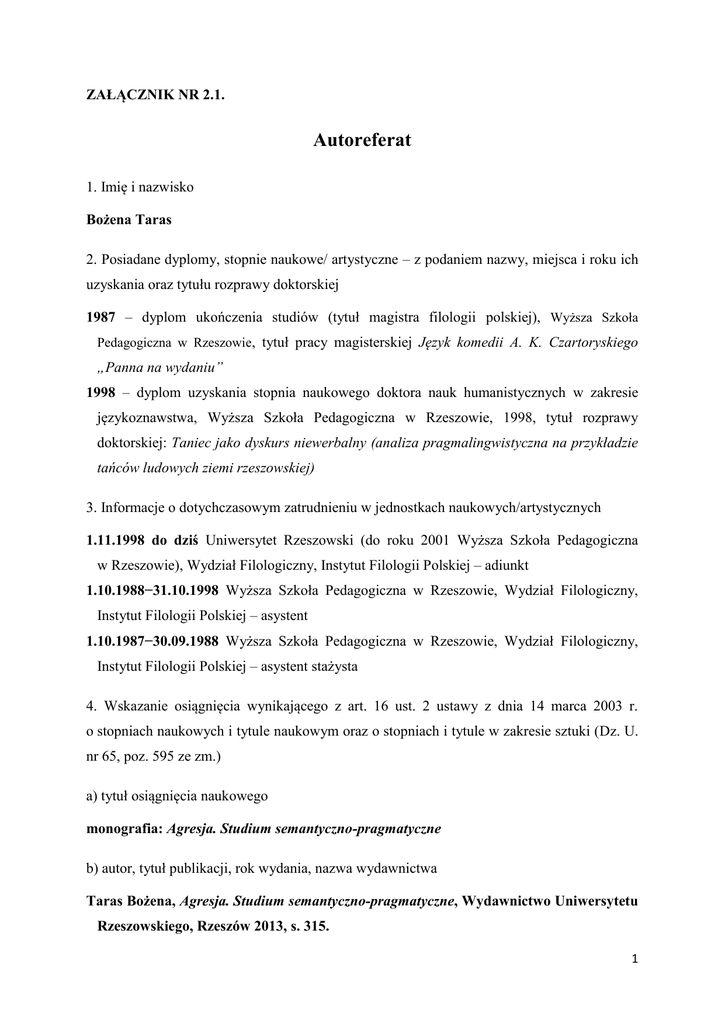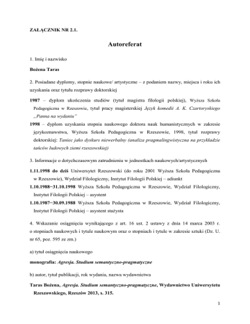 ZAŁĄCZNIK NR 2.1. Autoreferat 1. Imię i nazwisko Bożena Taras 2. Posiadane dyplomy, stopnie naukowe/ artystyczne – z podaniem nazwy, miejsca i roku ich uzyskania oraz tytułu rozprawy doktorskiej 1987 – dyplom ukończenia studiów (tytuł magistra filologii polskiej), Wyższa Szkoła Pedagogiczna w Rzeszowie, tytuł pracy magisterskiej Język komedii A. K. Czartoryskiego „Panna na wydaniu” 1998 – dyplom uzyskania stopnia naukowego doktora nauk humanistycznych w zakresie językoznawstwa, Wyższa Szkoła Pedagogiczna w Rzeszowie, 1998, tytuł rozprawy doktorskiej: Taniec jako dyskurs niewerbalny (analiza pragmalingwistyczna na przykładzie tańców ludowych ziemi rzeszowskiej) 3. Informacje o dotychczasowym zatrudnieniu w jednostkach naukowych/artystycznych 1.11.1998 do dziś Uniwersytet Rzeszowski (do roku 2001 Wyższa Szkoła Pedagogiczna w Rzeszowie), Wydział Filologiczny, Instytut Filologii Polskiej – adiunkt 1.10.1988−31.10.1998 Wyższa Szkoła Pedagogiczna w Rzeszowie, Wydział Filologiczny, Instytut Filologii Polskiej – asystent 1.10.1987−30.09.1988 Wyższa Szkoła Pedagogiczna w Rzeszowie, Wydział Filologiczny, Instytut Filologii Polskiej – asystent stażysta 4. Wskazanie osiągnięcia wynikającego z art. 16 ust. 2 ustawy z dnia 14 marca 2003 r. o stopniach naukowych i tytule naukowym oraz o stopniach i tytule w zakresie sztuki (Dz. U. nr 65, poz. 595 ze zm.) a) tytuł osiągnięcia naukowego monografia: Agresja. Studium semantyczno-pragmatyczne b) autor, tytuł publikacji, rok wydania, nazwa wydawnictwa Taras Bożena, Agresja. Studium semantyczno-pragmatyczne, Wydawnictwo Uniwersytetu Rzeszowskiego, Rzeszów 2013, s. 315. 1 c) omówienie celu naukowego ww. pracy i osiągniętych wyników wraz z omówieniem ich ewentualnego wykorzystania Monografia Agresja. Studium semantyczno-pragmatyczne wpisuje się w nurt lingwistycznych badań przyczynkowych. Przedmiotem refleksji badawczej uczyniłam w niej agresję, złożone zjawisko społeczno-kulturowe z pogranicza językoznawstwa, socjologii, psychologii, filozofii i politologii, które w wyniku rozwoju cywilizacji i techniki nie zanika, lecz ewoluuje, przybierając nowe formy. Celem podjętych przeze mnie rozważań było stworzenie podstaw do dalszych badań nad agresywnymi zachowaniami uczestników aktów komunikacji ujawniającymi się w rzeczywistości językowej i pozajęzykowej, dzięki którym możliwy byłby ich systemowy opis. Dążąc do realizacji celu, podzieliłam rozważania na trzy części: teoretyczną, semantyczną i pragmalingwistyczną, które okala rama kompozycyjna – inicjalna i finalna. Rama początkowa (Zagadnienia wstępne) pełni funkcję wprowadzenia do szczegółowych analiz. Składa się z dwóch części. W części pierwszej Uwarunkowania zachowań agresywnych przedstawiłam różnorodne determinanty agresji – konteksty społeczne, kulturowe, geopolityczne, medialne i aksjologiczne. Pokazałam, że jest to zjawisko złożone i wieloaspektowe o niejednolitych, a tym bardziej o nieprzewidywalnych przyczynach konfliktów i napastliwych działań. Z tak szeroko nakreślonego kontekstu wyłania się współczesny świat, w którym każdy człowiek tkwi w jakiejś sytuacji komunikacyjnej i każdy – bez względu na warunki etniczno-kulturowe i przestrzennoczasowe – może się stać biernym lub czynnym uczestnikiem aktu agresji: odbiorcą bezpośrednim (ofiarą) bądź pośrednim (obserwatorem) i/lub nadawcą (potencjalnym agresorem). Człowiek jest więc podmiotem sprawczym zróżnicowanych strukturalnie działań agresywnych determinowanych: intencjonalnie, sposobem obrazowania świata i negowaniem konwencji obowiązujących w określonej wspólnocie społeczno-kulturowej. Omówieniu przyjętej w pracy perspektywy badawczej, ograniczającej zakres rozważań nad aktami agresji do agresji podmiotowej, służy część druga wstępu Problematyka i metodologia badań. Sformułowałam w niej tezę, że człowiek stał się agresywny, przeżywa kryzys, bo utracił miarę, tożsamość, innymi słowy, stał się bezradny wobec etycznej pustki, hipokryzji i braku norm. W kolejnych częściach monografii staram się uzasadnić tę tezę, poddając analizie znaczenie pojęcia agresja oraz wybrane kwestie agresywnych zachowań z perspektywy tożsamości, tabu i strategii komunikacyjnych. Argumentację opieram na różnorodnym materiale badawczym wyekscerpowanym z tekstów drukowanych, zwłaszcza ze słowników, 2 z ankiet przeprowadzonych wśród uczniów, studentów i więźniów oraz z tekstów zamieszczonych w mediach, w szczególności w Internecie. Rozważaniom w części zasadniczej odpowiada trójdzielny układ pracy. W części pierwszej – teoretycznej – Agresja w językoznawstwie i naukach pokrewnych, składającej się z dwóch rozdziałów: Charakterystyka psychologiczno-socjologiczna zachowań agresywnych i Badania nad agresją we współczesnym językoznawstwie polskim, omówiłam podstawowe koncepcje badań socjologicznych, psychologicznych i lingwistycznych nad agresją. Zauważyłam, że uczeni, dążąc do zrozumienia agresywnych zachowań człowieka (w tym językowych), badają uwarunkowania psychospołeczne i biologiczne. Prowadzone przez nich obserwacje pozwalają określać wartości i wyjaśniać przyczyny napastliwości. Wiele uwagi poświęcają także badaniom nad formami agresji. Rozważania najczęściej poprzedzają wybranym określeniem rozumienia słowa agresja, by uniknąć trudności interpretacyjnych. W części tej starałam się pokazać, że niezależnie od dziedziny nauki pojmowanie słowa agresja (i derywatów: agresywny, agresywność, agresywnie) charakteryzuje się wieloznacznością lub nieostrością znaczeniową (np. utożsamianiem pojęć agresja i przemoc), zaś analiza aktów agresji różnorodnością koncepcji teoretycznych. Przyczyn upatrywałam, z jednej strony, w odmiennych celach badawczych stawianych przez uczonych różnorodnych 