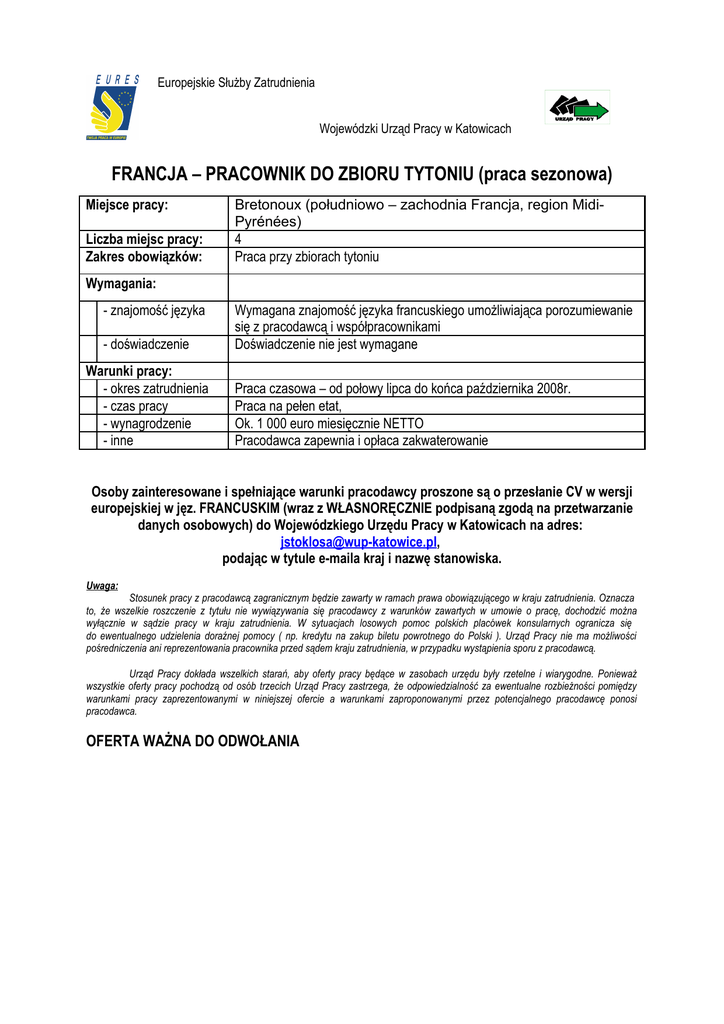 Europejskie Służby Zatrudnienia Wojewódzki Urząd Pracy w Katowicach FRANCJA – PRACOWNIK DO ZBIORU TYTONIU (praca sezonowa) Miejsce pracy: Liczba miejsc pracy: Zakres obowiązków: Bretonoux (południowo – zachodnia Francja, region MidiPyrénées) 4 Praca przy zbiorach tytoniu Wymagania: - znajomość języka - doświadczenie Warunki pracy: - okres zatrudnienia - czas pracy - wynagrodzenie - inne Wymagana znajomość języka francuskiego umożliwiająca porozumiewanie się z pracodawcą i współpracownikami Doświadczenie nie jest wymagane Praca czasowa – od połowy lipca do końca października 2008r. Praca na pełen etat, Ok. 1 000 euro miesięcznie NETTO Pracodawca zapewnia i opłaca zakwaterowanie Osoby zainteresowane i spełniające warunki pracodawcy proszone są o przesłanie CV w wersji europejskiej w jęz. FRANCUSKIM (wraz z WŁASNORĘCZNIE podpisaną zgodą na przetwarzanie danych osobowych) do Wojewódzkiego Urzędu Pracy w Katowicach na adres: [email protected], podając w tytule e-maila kraj i nazwę stanowiska. Uwaga: Stosunek pracy z pracodawcą zagranicznym będzie zawarty w ramach prawa obowiązującego w kraju zatrudnienia. Oznacza to, że wszelkie roszczenie z tytułu nie wywiązywania się pracodawcy z warunków zawartych w umowie o pracę, dochodzić można wyłącznie w sądzie pracy w kraju zatrudnienia. W sytuacjach losowych pomoc polskich placówek konsularnych ogranicza się do ewentualnego udzielenia doraźnej pomocy ( np. kredytu na zakup biletu powrotnego do Polski ). Urząd Pracy nie ma możliwości pośredniczenia ani reprezentowania pracownika przed sądem kraju zatrudnienia, w przypadku wystąpienia sporu z pracodawcą. Urząd Pracy dokłada wszelkich starań, aby oferty pracy będące w zasobach urzędu były rzetelne i wiarygodne. Ponieważ wszystkie oferty pracy pochodzą od osób trzecich Urząd Pracy zastrzega, że odpowiedzialność za ewentualne rozbieżności pomiędzy warunkami pracy zaprezentowanymi w niniejszej ofercie a warunkami zaproponowanymi przez potencjalnego pracodawcę ponosi pracodawca. OFERTA WAŻNA DO ODWOŁANIA