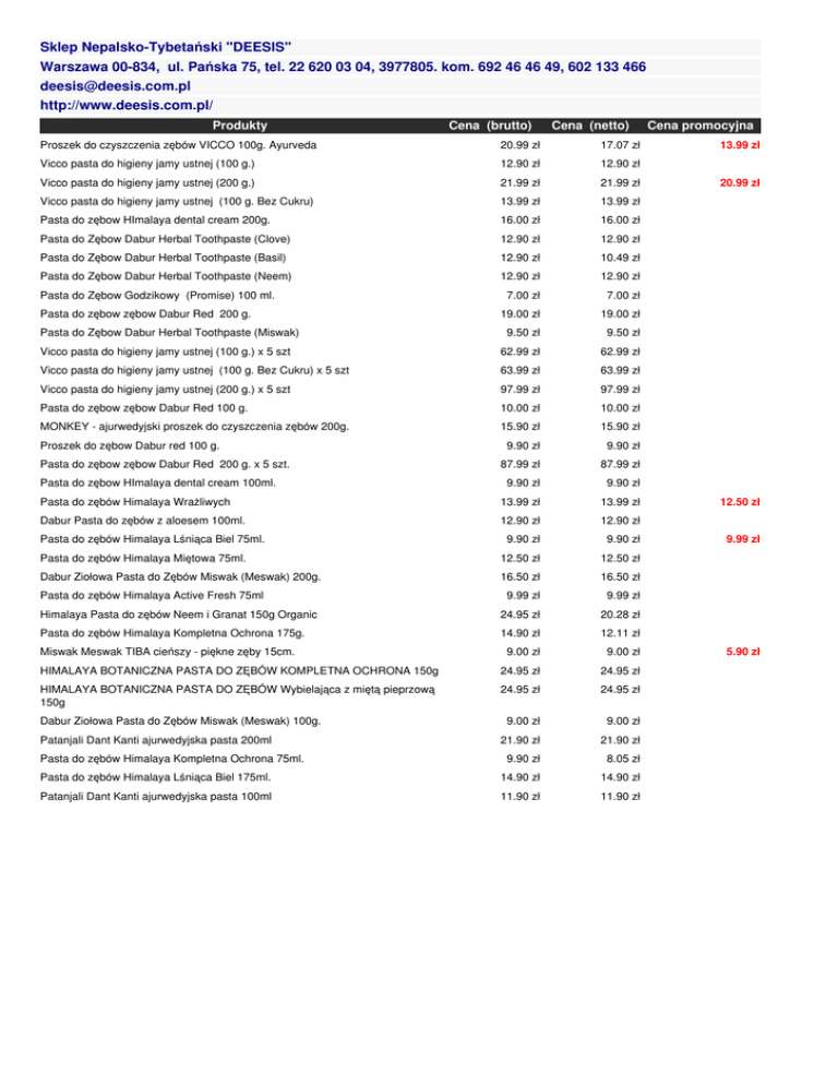 Sklep Nepalsko-Tybetański "DEESIS" Warszawa 00-834, ul. Pańska 75, tel. 22 620 03 04, 3977805. kom. 692 46 46 49, 602 133 466 [email protected] http://www.deesis.com.pl/ Produkty Cena (brutto) Cena (netto) Proszek do czyszczenia zębów VICCO 100g. Ayurveda 20.99 zł 17.07 zł Vicco pasta do higieny jamy ustnej (100 g.) 12.90 zł 12.90 zł Vicco pasta do higieny jamy ustnej (200 g.) 21.99 zł 21.99 zł Vicco pasta do higieny jamy ustnej (100 g. Bez Cukru) 13.99 zł 13.99 zł Pasta do zębow HImalaya dental cream 200g. 16.00 zł 16.00 zł Pasta do Zębow Dabur Herbal Toothpaste (Clove) 12.90 zł 12.90 zł Pasta do Zębow Dabur Herbal Toothpaste (Basil) 12.90 zł 10.49 zł Pasta do Zębow Dabur Herbal Toothpaste (Neem) 12.90 zł 12.90 zł 7.00 zł 7.00 zł 19.00 zł 19.00 zł Pasta do Zębow Godzikowy (Promise) 100 ml. Pasta do zębow zębow Dabur Red 200 g. Pasta do Zębow Dabur Herbal Toothpaste (Miswak) 9.50 zł 9.50 zł Vicco pasta do higieny jamy ustnej (100 g.) x 5 szt 62.99 zł 62.99 zł Vicco pasta do higieny jamy ustnej (100 g. Bez Cukru) x 5 szt 63.99 zł 63.99 zł Vicco pasta do higieny jamy ustnej (200 g.) x 5 szt 97.99 zł 97.99 zł Pasta do zębow zębow Dabur Red 100 g. 10.00 zł 10.00 zł MONKEY - ajurwedyjski proszek do czyszczenia zębów 200g. 15.90 zł 15.90 zł Proszek do zębow Dabur red 100 g. Pasta do zębow zębow Dabur Red 200 g. x 5 szt. Pasta do zębow HImalaya dental cream 100ml. 9.90 zł 9.90 zł 87.99 zł 87.99 zł 9.90 zł 9.90 zł Pasta do zębów Himalaya Wrażliwych 13.99 zł 13.99 zł Dabur Pasta do zębów z aloesem 100ml. 12.90 zł 12.90 zł Pasta do zębów Himalaya Lśniąca Biel 75ml. 9.90 zł 9.90 zł Pasta do zębów Himalaya Miętowa 75ml. 12.50 zł 12.50 zł Dabur Ziołowa Pasta do Zębów Miswak (Meswak) 200g. 16.50 zł 16.50 zł Pasta do zębów Himalaya Active Fresh 75ml 9.99 zł 9.99 zł Himalaya Pasta do zębów Neem i Granat 150g Organic 24.95 zł 20.28 zł Pasta do zębów Himalaya Kompletna Ochrona 175g. 14.90 zł 12.11 zł Miswak Meswak TIBA cieńszy - piękne zęby 15cm. 9.00 zł 9.00 zł HIMALAYA BOTANICZNA PASTA DO ZĘBÓW KOMPLETNA OCHRONA 150g 24.95 zł 24.95 zł HIMALAYA BOTANICZNA PASTA DO ZĘBÓW Wybielająca z miętą pieprzową 150g 24.95 zł 24.95 zł 9.00 zł 9.00 zł 21.90 zł 21.90 zł 9.90 zł 8.05 zł Pasta do zębów Himalaya Lśniąca Biel 175ml. 14.90 zł 14.90 zł Patanjali Dant Kanti ajurwedyjska pasta 100ml 11.90 zł 11.90 zł Dabur Ziołowa Pasta do Zębów Miswak (Meswak) 100g. Patanjali Dant Kanti ajurwedyjska pasta 200ml Pasta do zębów Himalaya Kompletna Ochrona 75ml. Cena promocyjna 13.99 zł 20.99 zł 12.50 zł 9.99 zł 5.90 zł