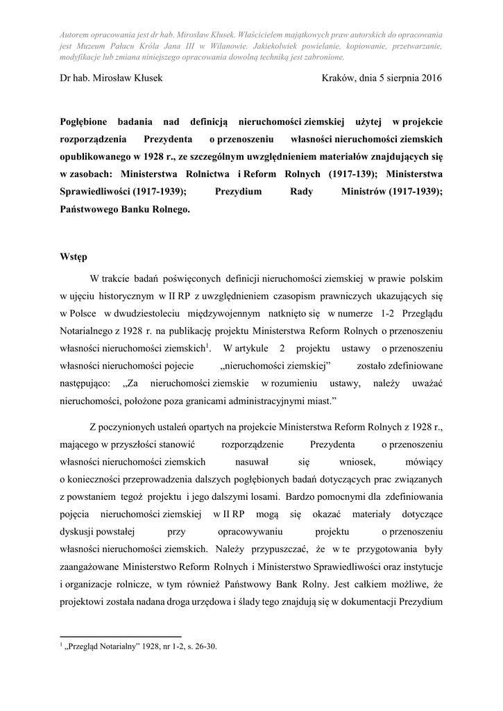 Autorem opracowania jest dr hab. Mirosław Kłusek. Właścicielem majątkowych praw autorskich do opracowania jest Muzeum Pałacu Króla Jana III w Wilanowie. Jakiekolwiek powielanie, kopiowanie, przetwarzanie, modyfikacje lub zmiana niniejszego opracowania dowolną techniką jest zabronione. Dr hab. Mirosław Kłusek Pogłębione badania rozporządzenia Kraków, dnia 5 sierpnia 2016 nad definicją Prezydenta nieruchomości ziemskiej o przenoszeniu użytej w projekcie własności nieruchomości ziemskich opublikowanego w 1928 r., ze szczególnym uwzględnieniem materiałów znajdujących się w zasobach: Ministerstwa Rolnictwa i Reform Rolnych (1917-139); Ministerstwa Sprawiedliwości (1917-1939); Prezydium Rady Ministrów (1917-1939); Państwowego Banku Rolnego. Wstęp W trakcie badań poświęconych definicji nieruchomości ziemskiej w prawie polskim w ujęciu historycznym w II RP z uwzględnieniem czasopism prawniczych ukazujących się w Polsce w dwudziestoleciu międzywojennym natknięto się w numerze 1-2 Przeglądu Notarialnego z 1928 r. na publikację projektu Ministerstwa Reform Rolnych o przenoszeniu własności nieruchomości ziemskich1. W artykule własności nieruchomości pojecie „nieruchomości ziemskiej” następująco: „Za nieruchomości ziemskie 2 projektu w rozumieniu ustawy o przenoszeniu zostało zdefiniowane ustawy, należy uważać nieruchomości, położone poza granicami administracyjnymi miast.” Z poczynionych ustaleń opartych na projekcie Ministerstwa Reform Rolnych z 1928 r., mającego w przyszłości stanowić rozporządzenie własności nieruchomości ziemskich nasuwał Prezydenta się o przenoszeniu wniosek, mówiący o konieczności przeprowadzenia dalszych pogłębionych badań dotyczących prac związanych z powstaniem tegoż projektu i jego dalszymi losami. Bardzo pomocnymi dla zdefiniowania pojęcia nieruchomości ziemskiej dyskusji powstałej w II RP przy mogą opracowywaniu się okazać projektu materiały dotyczące o przenoszeniu własności nieruchomości ziemskich. Należy przypuszczać, że w te przygotowania były zaangażowane Ministerstwo Reform Rolnych i Ministerstwo Sprawiedliwości oraz instytucje i organizacje rolnicze, w tym również Państwowy Bank Rolny. Jest całkiem możliwe, że projektowi została nadana droga urzędowa i ślady tego znajdują się w dokumentacji Prezydium 1 „Przegląd Notarialny” 1928, nr 1-2, s. 26-30. Rady Ministrów. W związku z tym słusznym jest przeprowadzenie następujących dodatkowych badań: 1. kwerenda czasopism międzywojennym, ze i procedowania rolniczych ukazujących szczególnym się uwzględnieniem projektu w dwudziestoleciu okresu ustawy powstawania o przenoszeniu własności nieruchomości ziemskich; 2. kwerenda zespołów Ministerstwa Ministerstwa Rolnictwa Sprawiedliwości w II RP, i Reform Prezydium Rolnych Rady w II RP, Ministrów, Państwowego Banku Rolnego, znajdujących się w Archiwum Akt Nowych w Warszawie. I. Wyniki kwerendy czasopism rolniczych ukazujących się w II RP W wyniku przeprowadzonej kwerendy czasopism rolniczych ukazujących się w dwudziestoleciu międzywojennym, niestety nie natrafiono materiały dotyczące projektu Ministerstwa Reform Rolnych o przenoszeniu własności nieruchomości ziemskich. Kwerenda jednak nie okazała się bezowocna. Natrafiono na publikacje odnoszące się do obrotu ziemią, które dostarczają nam nowych informacji na temat kwestii związanych z definiowaniem pojęcia „nieruchomość ziemska”. W II RR w drugiej połowie lat dwudziestych funkcjonował cały szereg przepisów prawnych dotyczących obrotu ziemią. Na pierwszym miejscu należy wymienić ustawę z 2 sierpnia 1919 r., która upoważniała Radę Ministrów do wydawania rozporządzeń z mocą ustawy, odnoszących się do obrotu ziemią2. Obrotu ziemią dotyczyła również ustawa o wykonaniu reformy rolnej z grudnia 1925 r. Następnie ważności nie utraciły przepisy regulujące obrót gruntami włościańskimi na ziemiach byłego zaboru rosyjskiego. Na terenie Galicji byłej Galicji obowiązywało rozporządzenie cesarskie z 9 sierpnia 1915 r., dotyczące obrotu ziemią. Natomiast na ziemiach byłego zaboru pruskiego zgodnie z obowiązującym rozporządzeniem Rady Ludowej z 25 lipca 1919 r., jakiekolwiek zmiany własności podlegały kontroli i były uzależnione od zatwierdzenia ich przez władze państwowe. Ustawy te wydawane w różnych okresach i przez różne władze państwowe tworzyły chaos w obrocie ziemią w II RP. Ponadto ustawa o wykonaniu reformy rolnej była 2 Z. Ludkiewicz, Sprawa obrotu ziemią oraz niepodzielność gospodarstw włościańskich w Polsce, „Rolnictwo” 1929, t. IV, nr 2, s. 93. 2 niekompletna. Pewne zagadnienia nie zostały uregulowane, a niektóre były niedoprecyzowane. Pomimo panującego chaosu w tej sprawie nie została wydana ustawa o obrocie ziemią. Zdzisław Ludkiewicz przyczynę tej sytuacji upatrywał w trudnościach technicznych, wynikających z przeprowadzenia jej przez Sejm oraz z uzgodnieniem wspólnego stanowiska wśród polityków. Po drugie przygotowanie ustawy o obrocie ziemią należało do najtrudniejszych prac w zakresie prawa agrarnego. To były zasadnicze przyczyny, iż wydanie ustawy o obrocie ziemią było ciągle odkładane, a jedynie od czasu do czasu przedstawiano jej projekty3. Na jesień 1926 r. Zdzisław Ludkiewicz, który wcześniej pełnił funkcję Ministra Reform Rolnych (od 19 grudnia 1923 do 3 lipca 1924) opracował i złożył trzy projekty ustaw, stanowiących całość projektu szeroko pojętej ustawy o obrocie ziemią. Były to projekty ustawy o osadach niepodzielnych, projekt ustawy o osadach rodzinnych oraz projekt ustawy o obrocie ziemią4. Dla naszych rozważań interesujący jest projekt ustawy o obrocie ziemią. Na początku Ludkiewicz zaznacza, iż w tym czasie istniał projekt rządowy ustawy o obrocie ziemią, które w jego opinii nie został poddany do szerokiej dyskusji publicznej. P