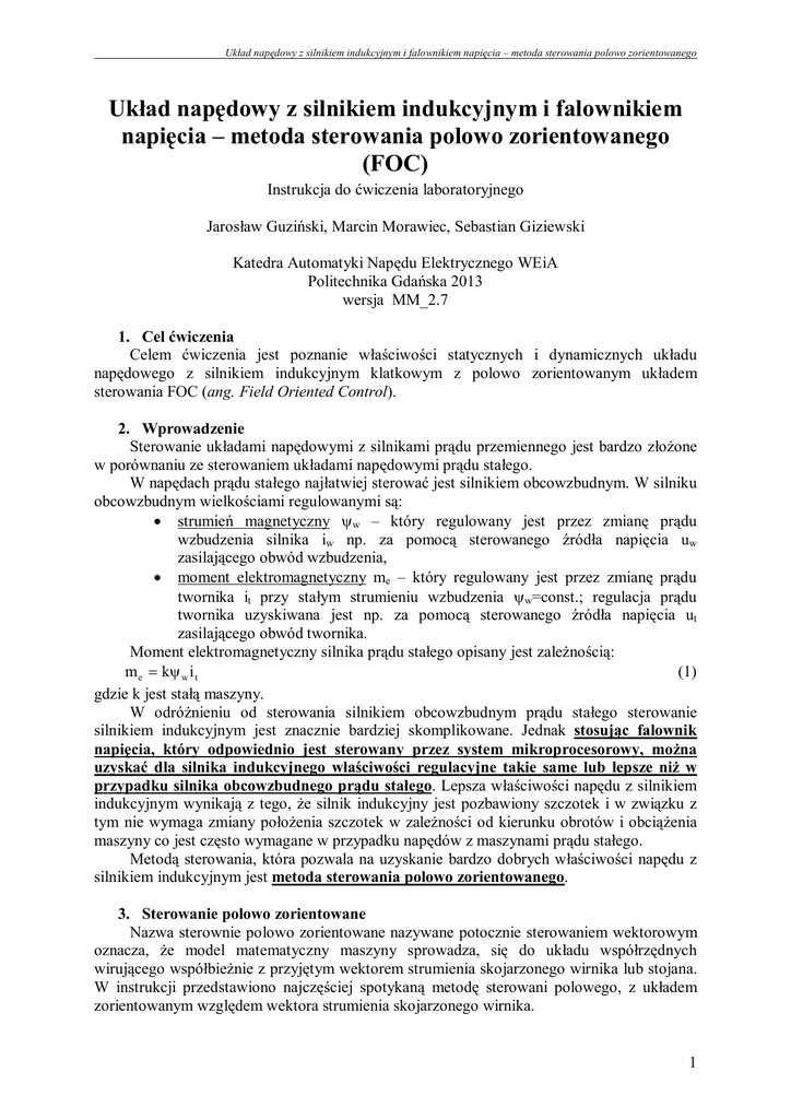 Układ napędowy z silnikiem indukcyjnym i falownikiem napięcia – metoda sterowania polowo zorientowanego Układ napędowy z silnikiem indukcyjnym i falownikiem napięcia – metoda sterowania polowo zorientowanego (FOC) Instrukcja do ćwiczenia laboratoryjnego Jarosław Guziński, Marcin Morawiec, Sebastian Giziewski Katedra Automatyki Napędu Elektrycznego WEiA Politechnika Gdańska 2013 wersja MM_2.7 1. Cel ćwiczenia Celem ćwiczenia jest poznanie właściwości statycznych i dynamicznych układu napędowego z silnikiem indukcyjnym klatkowym z polowo zorientowanym układem sterowania FOC (ang. Field Oriented Control). 2. Wprowadzenie Sterowanie układami napędowymi z silnikami prądu przemiennego jest bardzo złożone w porównaniu ze sterowaniem układami napędowymi prądu stałego. W napędach prądu stałego najłatwiej sterować jest silnikiem obcowzbudnym. W silniku obcowzbudnym wielkościami regulowanymi są: strumień magnetyczny w – który regulowany jest przez zmianę prądu wzbudzenia silnika iw np. za pomocą sterowanego źródła napięcia uw zasilającego obwód wzbudzenia, moment elektromagnetyczny me – który regulowany jest przez zmianę prądu twornika it przy stałym strumieniu wzbudzenia w=const.; regulacja prądu twornika uzyskiwana jest np. za pomocą sterowanego źródła napięcia ut zasilającego obwód twornika. Moment elektromagnetyczny silnika prądu stałego opisany jest zależnością: m e k w i t (1) gdzie k jest stałą maszyny. W odróżnieniu od sterowania silnikiem obcowzbudnym prądu stałego sterowanie silnikiem indukcyjnym jest znacznie bardziej skomplikowane. Jednak stosując falownik napięcia, który odpowiednio jest sterowany przez system mikroprocesorowy, można uzyskać dla silnika indukcyjnego właściwości regulacyjne takie same lub lepsze niż w przypadku silnika obcowzbudnego prądu stałego. Lepsza właściwości napędu z silnikiem indukcyjnym wynikają z tego, że silnik indukcyjny jest pozbawiony szczotek i w związku z tym nie wymaga zmiany położenia szczotek w zależności od kierunku obrotów i obciążenia maszyny co jest często wymagane w przypadku napędów z maszynami prądu stałego. Metodą sterowania, która pozwala na uzyskanie bardzo dobrych właściwości napędu z silnikiem indukcyjnym jest metoda sterowania polowo zorientowanego. 3. Sterowanie polowo zorientowane Nazwa sterownie polowo zorientowane nazywane potocznie sterowaniem wektorowym oznacza, że model matematyczny maszyny sprowadza, się do układu współrzędnych wirującego współbieżnie z przyjętym wektorem strumienia skojarzonego wirnika lub stojana. W instrukcji przedstawiono najczęściej spotykaną metodę sterowani polowego, z układem zorientowanym względem wektora strumienia skojarzonego wirnika. 1 Układ napędowy z silnikiem indukcyjnym i falownikiem napięcia – metoda sterowania polowo zorientowanego Rys. 1. Składowe prądu stojana w układach współrzędnych nieruchomych oraz współrzędnych wirujących dq Wprowadzenie układu współrzędnych dq wirującego synchronicznie z wektorem strumienia skojarzonego wirnika wymaga wyznaczenia składowych wektorów wielkości regulowanych dla współrzędnych układu dq. W tym celu niezbędna jest znajomość kąta ρ określającego położenie wektora strumienia wirnika względem nieruchomego układu odniesienia . Kąt obliczany jest przez układ mikroprocesorowy przy wykorzystaniu matematycznych zależności obserwatora stanu silnika klatkowego. W obserwatorze obliczane są aktualne wartości składowych strumienia skojarzonego wirnika, na podstawie których określony jest kąt : arctg r (2) r W układzie współrzędnych nieruchomych składowe poszczególnych wektorów są w stanie ustalonym wielkościami sinusoidalnie zmiennymi. Natomiast składowe tych wektorów w układzie współrzędnych dq mają w stanie ustalonym stałe wartości. Zasada sterowania polowo zorientowanego oparta jest na analizie równań modelu maszyny asynchronicznej klatkowej. Ogólna postać równań modelu maszyny asynchronicznej klatkowej zapisana przy przyjęciu jednostek względnych dla układu współrzędnych xy wirujących z dowolną prędkością a jest następująca: di sx a 1 i sx a 2 rx a i sy r a 3 ry a 4 u sx (3) dt di sy a 1 i sy a 2 ry a i sx r a 3 rx a 4 u sy (4) dt d rx a 5 rx a r ry a 6 i sx (5) dt d ry a 5 ry a r rx a 6 i sy (6) dt dr L m rx i sy ry i sx 1 m o (7) dt Lr J J gdzie: R L2 R r L2m R L L L R L a1 s r , a2 r m , a3 m , a4 r , a5 r , a6 R r m , Lr w Lr w w w Lr Lr 2 Układ napędowy z silnikiem indukcyjnym i falownikiem napięcia – metoda sterowania polowo zorientowanego L2m , Ls L r oraz is oraz us to prąd i napięcie stojana, J jest momentem bezwładności, mo to momentem obciążenia, Rs i Rr są rezystancjami uzwojeń stojana i wirnika, Ls, Lr są indukcyjnościami uzwojeń stojana i wirnika, Lm jest indukcyjnością główną natomiast jest współczynnikiem rozproszenia. Równania modelu silnika indukcyjnego (3)-(7) zapisane zostały przy przyjęciu jednostek względnych odniesionych do wielkości bazowych przedstawionych w tab. 2 znajdującej się w końcowej części instrukcji. Zależności modelu silnika (3)-(7) można zapisać dla układu współrzędnych wirujących dq przyjmując, że a=r. Otrzymuje się wtedy równania modelu silnika dla układu współrzędnych dq w postaci: di sd a 1 i sd a 2 rd r i sd a 4 u sd (8) dt di sq a 1 i sq r i sd r a 3 rd a 4 u sq (9) dt d rd a 5 rd a 6 i sd (10) dt dr L m 1 rd i sq m o (11) dt Lr J J Ponieważ w układzie współrzędnych dq składowa strumienia dla osi q jest równa zero to wartość składowej strumienia dla osi d jest równa modułowi strumienia wirnika: r 2r 2r rd (12) w L r L s L r L s L2m , 1 Moment elektromagnetyczny wytwarzany przez silnik asynchroniczny klatkowy określony jest zależnością: L m e m rd i sq k IM r i sq (13) Lr gdzie k IM L m L r Wzór na moment silnika indukcyjnego (13) jest podobny do w