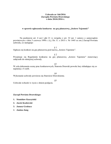 Uchwała nr 166/2016 Zarządu Powiatu Drawskiego z dnia 20.04.2016 r. w sprawie ogłoszenia konkursu na grę planszową „Jezioro Tajemnic” Na podstawie art. 4 ust.1 pkt 21 w związku z art. 32 ust. 1 ustawy o samorządzie powiatowym z dnia 5 czerwca 1998 r. (t.j. Dz. U. z 2015 r. Nr 1445 ze zm.) Zarząd Powiatu uchwala, co następuje: §1 Ogłasza się konkurs na grę planszową pod nazwą „Jezioro Tajemnic”. §2 Przyjmuje się Regulamin konkursu na grę planszową „Jezioro Tajemnic" stanowiący załącznik do niniejszej uchwały. §3 W celu dokonania oceny prac konkursowych, Starosta Drawski powoła Jury składające się co najmniej z 4 osób. §4 Wykonanie uchwały powierza się Staroście Drawskiemu. §5 Uchwała wchodzi w życie z dniem podjęcia. Zarząd Powiatu Drawskiego: 1. Stanisław Kuczyński 2. Jacek Kozłowski 3. Janusz Grabacz 4. Janina Jung Załącznik do uchwały nr 166/2016 Zarządu Powiatu Drawskiego z dnia 20.04.2016r. Regulamin konkursu na grę planszową „Jezioro Tajemnic” I. Organizator Organizatorem konkursu jest Starostwo Powiatowe w Drawsku Pomorskim. Konkurs jest elementem działań podejmowanych w ramach Akcji Eksploracyjno-Historycznej „Jezioro Tajemnic”. II. Cele konkursu Promowanie terenów pojezierza drawskiego poprzez zwiększenie świadomości uczniów w zakresie uwarunkowań geograficznych oraz historycznych w najbliższej okolicy. Kształtowanie wyobraźni uczniów poprzez tworzenie gier planszowych na określony temat. III. Warunki uczestnictwa 1) Uczestnicy konkursu mają za zadanie własnoręczne wykonanie jednej gry planszowej na temat „Jezioro Tajemnic" opartej na motywach inspirowanych Akcją Eksploracyjno – Historyczną „Jezioro Tajemnic” . 2) Prace konkursowe mogą być zgłaszane wyłącznie indywidualnie. 3) Konkurs jest skierowany dla uczniów gimnazjów oraz szkół ponadgimnazjalnych działających na terenie powiatu drawskiego. 4) Udział w konkursie jest równoznaczny z akceptacją regulaminu. 5) Jeden autor może nadesłać jedną grę planszową. 6) Format gry: A4 lub A3. 7) Gra planszowa musi zawierać co najmniej planszę oraz instrukcję. 8) Technika wykonania gry jest dowolna. 9) Do prac należy dołączyć kartę uczestnika (wg wzoru stanowiącego załącznik do Regulaminu), którą powinien podpisać rodzic lub osoba uprawniona do reprezentowania ucznia albo uczeń jeśli jest osobą pełnoletnią. 10) Pracę należy podpisać czytelnie z tyłu podając imię i nazwisko ucznia, a także klasę, miejscowość oraz nazwę szkoły, do której uczęszcza. 11) Dane osobowe uczestników będą wykorzystywane wyłącznie w celu realizacji konkursu tj. wyłonienia zwycięzcy i przyznania nagrody. Jednocześnie, poprzez podanie danych osobowych, uczestnik wyraża zgodę na opublikowanie jego imienia i nazwiska oraz pracy w artykułach promujących Powiat Drawski i Akcję Eksploracyjno-Historyczną „Jezioro Tajemnic”. Poprzez udział w konkursie Uczestnik wyraża także zgodę na publikację jego wizerunku w związku z prowadzeniem Akcji Eksploracyjno – Historycznej „Jezioro Tajemnic” . IV. Termin i miejsce nadsyłania prac Pracę należy przesłać (obowiązuje data wpływu) lub dostarczyć osobiście do 31 maja 2016 roku, na poniższy adres, z dopiskiem: KONKURS NA GRĘ PLANSZOWĄ „JEZIORO TAJEMNIC”: Starostwo Powiatowe w Drawsku Pomorskim Plac Elizy Orzeszkowej 3 78-500 Drawsko Pomorskie V. Rozstrzygnięcie konkursu 1. Jury zostanie powołane zarządzeniem Starosty Drawskiego. 2. Jury będzie oceniać prace w jednej wspólnej kategorii wiekowej obejmującej gimnazjum oraz szkoły ponadgimnazjalne. 3. Jury oceni prace indywidualne, ilustrujące najlepiej temat przewodni „Jezioro Tajemnic”. Spośród nich wybranie zostanie jedna najlepsza praca. 4. Przewiduje się możliwość przyznania dodatkowych nagród lub wyróżnień. 5. Kryteria oceny prac stanowią: zgodność z tematyką, estetyka pracy i oryginalność. 6. Rozstrzygnięcie Jury jest ostateczne - od werdyktu nie przysługuje odwołanie. 7. Osoba nagrodzona zostanie powiadomiona indywidualnie o miejscu i godzinie uroczystego rozdania nagród. 8. Nagrodą główną w konkursie jest laptop, o wartości do 2.000 zł, ufundowany przez Organizatora. 9. Łączna wartość nagród dodatkowych nie może przekroczyć kwoty 500 zł. 10. Nagrody rzeczowe nie podlegają zamianie na inne nagrody rzeczowe, ani na ich równowartość pieniężną. 11. Organizator zastrzega sobie prawo do nierozstrzygnięcia konkursu w przypadku zbyt małej ilości przekazanych prac. VI. Ogłoszenie wyników konkursu O wynikach konkursu laureaci zostaną poinformowani do 10 czerwca 2016 roku. O terminie uroczystego wręczenia nagród laureaci zostaną powiadomieni indywidualnie . VII. Publikacja prac Przekazując pracę na konkurs, uczestnik zgadza się na ekspozycję pracy przez Organizatora. Z chwilą nadesłania wszelkie prawa do prac, w tym prawa autorskie przechodzą na własność Organizatora, który może nimi swobodnie dysponować, w tym rozpowszechniać publicznie. Udział w konkursie jest jednoznaczny z wyrażeniem zgody na bezpłatne wykorzystywania nadesłanych prac konkursowych w ramach działalności Organizatora. VIII. Uwagi dodatkowe 1. 2. 3. 4. 5. Prace niezgodne z warunkami określonymi w Regulaminie nie będą brane pod uwagę. Organizator nie ponosi odpowiedzialności za ewentualne opóźnienia i uszkodzenia prac powstałe w trakcie przesyłki. Prace konkursowe nie zostaną zwrócone uczestnikom konkursu. Organizator nie ponosi odpowiedzialności prawnej za naruszenie praw autorskich osób trzecich przez Uczestników. Wszelkie sprawy nie uwzględnione w Regulaminie rozstrzyga Organizator. IX. Kontakt Osoba do kontaktu – w przypadku pytań odnośnie konkursu: Izabela Krężołek, tel. (94) 36 307 94, e-mail: [email protected] Załącznik do regulaminu konkursu na grę planszową „Jezioro Tajemnic” Karta uczestnika konkursu na grę planszową 