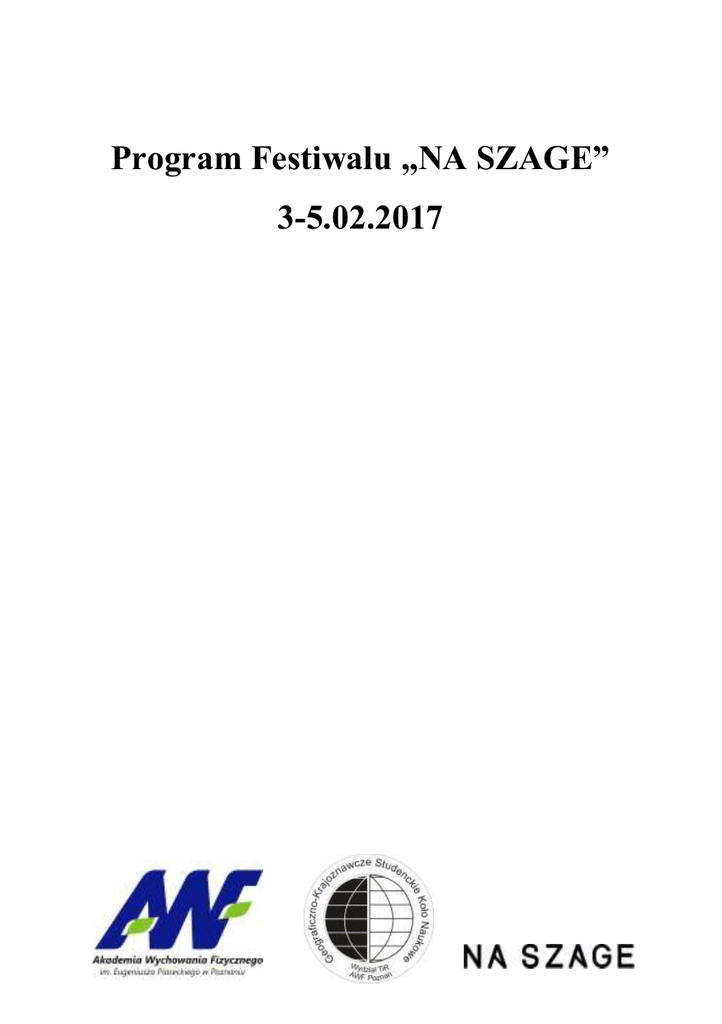 Program Festiwalu „NA SZAGE” 3-5.02.2017 Piątek, 3.02.2017 15.00 – rozpoczęcie festiwalu 15.15 – „Jak jeden telefon potrafi zburzyć życie: autostopem przez Kambodżę, Tajlandię i Malezję” – Natalia Pierunek, Łukasz Lindner * 15.45 – „Na szlaku z Sandrą” – Sandra Kaźmierczak * 16.25 – „Na tratwie z prądem Madre de Dios” – Emil Witt * 16.55 – „O cienkiej granicy miedzy dwiema Amerykami – podróż do USA i Meksyku” – Karolina i Katarzyna Kowalczyk * 17.25 – „Hulajnogą i Autostopem z Podlasia do Chin, za garść złotówek” – Tomasz Jakimiuk * 18.00 – „Man in The Public Space” – Leszek Wasiak, FRMBB 18.15 – „Czy choroba wysokościowa musi być zawsze nieodłącznym towarzyszem wspinaczy podczas ekspedycji w górach wysokich?” – dr hab. med. Małgorzata Paul 19.05 – „Afryka Medyka – o życiu i pracy w zambijskim buszu” – Jacek Jarosz, Agnieszka Pydzińska 20.00 – „Wielki Szlak himalajski 2015-2019” – Bartek Malinowski, Joanna Lipowczan 21.30 – … – otwarcie wystawy „Man in The Public Space” Sobota, 4.02.2017 9.45 – rozpoczęcie II dnia Festiwalu 10.00 – „Mongolia – off-road bez samochodu” – Przemysław Pakulniewicz * 10.35 – „300 dni w podróży przez Azję Południowo-Wschodnią” – Przemysław Łabęcki, Joanna Kicka * 11.05 – „Polska Prosto Rowerem 2016 - na szagę z południa na północ Polski” – Marcin Korzonek * 11.45 – „Na dywanie w ramadanie, czyli dwie dziewczyny w podróży po Iranie” – Anna Bogdanowicz, Dominika Szyszko * 12.15 – „4300 km pieszej wędrówki szlakiem Pacific Crest” – Maciej Stromczyński, Grzegorz Ozimiński * 12.45 – „Tajemnicza Oceania” - Michalina Kupper * 13.20 – 14.20 – „Priwiet, Bajkał!” – Alicja i Jędrzej Łukowscy (sala warsztatowa) 13.30 – Wystąpienie. Pan Satriyo Pringgodhany, I-szy Sekretarz Ambasady Indonezji 13.45 – Film promocyjny „Wonderful Indonesia” 13.55 – Występ Zespołu Indonezyjskiego Tańca Tradycyjnego 14.05 – Reportaż filmowy „Java Jazz Festival 2016” - Jerzy Pawleta 14.40 – 16.00 – „Podróże do granic” – Robert i Joachim Czerniak (spotkanie autorskie) 15.00 – „Aktualne zagrożenia zdrowotne w międzynarodowym ruchu turystycznym” – dr Karolina Mrówka 16.10 – „Etnograficzne szlaki – Camino de Costa” – Joanna Minksztym 16.30 – 17.30 – „Podróże nieudacznika” – prof. Dariusz J. Gwiazdowicz (spotkanie autorskie) 17.20 – „Laponia – w krainie ludzi, bogów i zwierząt” – Kamila Kielar 18.00 – 20.00 – „Podwodna Indonezja” – Alicja Dramińska (warsztaty) 18.30 – „Hajastan i Arcach – w cieniu Araratu” – Konrad, Beata, Mikołaj Tulej 19.40 – „Sudan Południowy – to nie jest smutne miejsce” – Piotr Horzela 21.30 – … – spotkanie w klubie festiwalowym TROPS Występ Zespołu Indonezyjskiego Tańca Tradycyjnego oraz pokazy tańców z różnych rejonów świata w wykonaniu Zespołu Tanecznego DreamLadies Niedziela, 5.02.2017 10.30– rozpoczęcie III dnia Festiwalu 10.45 – „Aventura, autostopem przez Amerykę Środkową i Południową” – Wojciech Malicha, Sebastian Hennig 11.30 – 13.30 – „Malowane światłem – praktyczne porady eksperta jak wykonać dobrą fotografię” – Danuta Witkowska (warsztaty) 11.40 – „Dos Gringos śladami Majów” – Jan Kurzela, Alicja Kubiak 12.50 – „Nepal – krótka historia o kiwaniu głową” – Ryszard Bogusław 13.00 – 14.00 – „Praktycznie wszystko o podróżowaniu Koleją Transsyberyjską” – Alicja i Jędrzej Łukowscy, Małgorzata Ciepła (warsztaty) 14.00 – „Oman – na rowerze oślimi ścieżkami” – Jan Piętek, Marzena Badziak 14.15 – 15.15 – „Oczami Dos Gringos” – Jan Kurzela, Alicja Kubiak (spotkanie autorskie) 15.10 – „Ugryźć kawałek świata – 26 krajów na 26 urodziny” – Szczepan Ligęza 16.15 – rozstrzygnięcie konkursu i wręczenie nagród 16.40 – „Nowa Gwinea - ostanie niedostępne miejsca Ziemi: Plemiona żyjące na drzewach i Piramida Carstensz'a” – Jerzy Kostrzewa 17.30 - „Maluchem przez Azję” – Arkady Paweł Fiedler 18.45 – zakończenie festiwalu Warsztaty i spotkania dla dzieci: Sobota: 11.00 – 12.30 – Bajka na dzień dobry „Kamishibai” – Ula Ziober 12.45 – 14.15 – „Podróżuję świadomie” – Konrad, Beata, Mikołaj Tulej 14.30 – 15.30 – „W co się bawią dzieci na antypodach” – Michalina Kupper 16.15 – 17.15 – „Naszyjnik Przyjaźni – przesłanie Indian Migmagów” – Aleksandra Grabowska-Szych i Artur Szych, Teatr Wierzbak Plus Niedziela: 10.45 – 11.45 – „Naszyjnik Przyjaźni – przesłanie Indian Migmagów” – Aleksandra Grabowska-Szych i Artur Szych, Teatr Wierzbak Plus 12.00. – 13.00 – „Morska opowieść – ryby, delfiny, nurkowanie …” – Elżbieta Kidacka 13.30 – 14.30 – „Opowieść o niezwykłym podróżniku Kazimierzu Nowaku” – Ula Ziober Dodatkowe atrakcje: - wystawy - książki podróżnicze - kawiarenka festiwalowa - spotkanie w klubie festiwalowym - rozmowy, opowieści, zabawa - ... * prezentacje konkursowe Program może ulec niewielkim modyfikacjom.