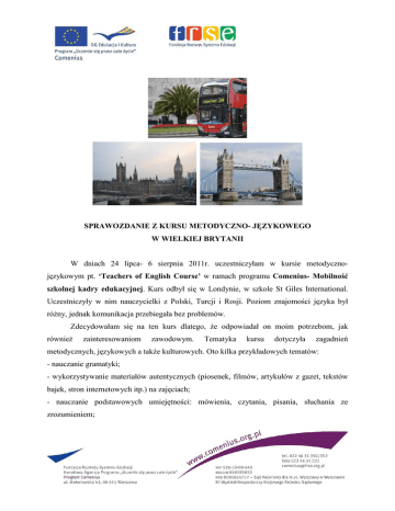 SPRAWOZDANIE Z KURSU METODYCZNO- JĘZYKOWEGO W WIELKIEJ BRYTANII W dniach 24 lipca- 6 sierpnia 2011r. uczestniczyłam w kursie metodycznojęzykowym pt. ‘Teachers of English Course’ w ramach programu Comenius- Mobilność szkolnej kadry edukacyjnej. Kurs odbył się w Londynie, w szkole St Giles International. Uczestniczyły w nim nauczycielki z Polski, Turcji i Rosji. Poziom znajomości języka był różny, jednak komunikacja przebiegała bez problemów. Zdecydowałam się na ten kurs dlatego, że odpowiadał on moim potrzebom, jak również zainteresowaniom zawodowym. Tematyka kursu dotyczyła zagadnień metodycznych, językowych a także kulturowych. Oto kilka przykładowych tematów: - nauczanie gramatyki; - wykorzystywanie materiałów autentycznych (piosenek, filmów, artykułów z gazet, tekstów bajek, stron internetowych itp.) na zajęciach; - nauczanie podstawowych umiejętności: mówienia, czytania, pisania, słuchania ze zrozumieniem; - korzystanie z tablic interaktywnych podczas zajęć; - poprawianie błędów; - planowanie lekcji; - brytyjska kultura i tożsamość. Miałyśmy również możliwość obserwacji lekcji prowadzonych przez doświadczonych nauczycieli native speaker’ów. Ciekawym doświadczeniem był udział w lekcji języka obcego. Żadna z uczestniczek kursu nie znała języka, którego nas uczono. Poddane takiej próbie szybko uzmysłowiłyśmy sobie problemy, z jakimi borykają się nasi uczniowie podczas nauki języka angielskiego. Na zajęciach pracowałyśmy głównie w grupach min. przy sporządzaniu planów lekcji bądź analizowaniu lekcji obserwowanych. Pracowałyśmy intensywnie ale dzięki życzliwości jak również bezpośredniej i pomocnej postawie prowadzących, nie odczuwałyśmy zmęczenia. Szkolenie zorganizowane było perfekcyjnie. Wykładowcy przekazali nam olbrzymią wiedzę, jak również zainspirowali swoim entuzjazmem do nowych działań. Panowała serdeczna i przyjazna atmosfera. Dyrektor szkoły przywitał nas pierwszego dnia i udzielił wszelkich informacji logistycznych, organizacyjnych. Po pierwszym tygodniu zajęć wszyscy uczestnicy otrzymali ankiety ewaluacyjne. Wykładowcy starali się sprostać naszym oczekiwaniom, miałyśmy wpływ na plan zajęć, nie był on ściśle narzucony. Mogłyśmy zgłaszać tematy do dyskusji, zadawać pytania dotyczące naszej praktyki w nauczaniu języka angielskiego, zgłaszać uwagi, wymieniałyśmy się własnymi doświadczeniami pedagogicznymi, pomysłami. Poza zajęciami planowymi, szkoła przygotowała dla nas bogaty program kulturalny: - wycieczki po Londynie i poza granice Londynu; - zwiedzanie muzeów, galerii; - wyjścia do teatrów, kin; - spotkania studentów w kawiarence. Wiele osób decydowało się na zwiedzanie miasta we własnym zakresie. Londyn jest miejscem niezwykle atrakcyjnym turystycznie. Mnogość tych atrakcji, a co za tym idzie także turystów, zapewne spowodowała rozwój tak dobrej organizacji Brytyjczyków. Nawet wejście do Pałacu Buckingham, muzeum Madame Tussaud’s czy na przejażdżkę London Eye nie były uciążliwe. Udział w tym szkoleniu był dla mnie wspaniałym doświadczeniem. Przede wszystkim pozwolił mi uaktualnić moją wiedzę metodyczną, a także na temat kultury brytyjskiej. Zdobyłam wiele nowych materiałów, które wykorzystuję teraz w czasie zajęć. Cenną wartością była też możliwość doskonalenia umiejętności językowych, zarówno podczas zajęć jak również mieszkając z rodziną brytyjską. Pobyt w rodzinie anglojęzycznej wzbudzał we mnie wiele wątpliwości. Obawiałam się tego, że różnice kulturowe, odmienne tradycje przyzwyczajenia mogą mieć negatywny wpływ na współpracę i wspólne mieszkanie. Na szczęście moje obawy nie sprawdziły się. Rodzina przyjęła mnie bardzo serdecznie. Przed wyjazdem otrzymałam informacje na temat rodziny, obowiązujących zasad, na miejscu gospodyni domu wyjaśniła mi wszystkie kwestie organizacyjne i współpraca nasza przebiegała bez zarzutów. Pani Aida (gospodyni domu) jest osobą bardzo otwartą, chętnie opowiadała mi o swojej rodzinie, Londynie. Chwile spędzone w jej towarzystwie upływały bardzo szybko i przyjemnie, często żałowałam, że mam tak mało czasu na te rozmowy. Trudno było pogodzić naukę, zwiedzanie i przebywanie w towarzystwie Brytyjczyków. Rodzina goszcząca studentów jest ewaluowana przez szkołę i musi spełniać obowiązujące standardy, dzięki temu studenci czują się naprawdę bezpiecznie. Wiedzą i doświadczeniem zdobytym w czasie kursu planuję podzielić się z innymi poprzez: - propagowanie informacji na temat programu Comenius; - zorganizowanie zajęć otwartych dla nauczycieli stażystów; - wykonanie prezentacji multimedialnej dla dzieci o kulturze brytyjskiej; - zorganizowanie konkursu wiedzy o Wielkiej Brytanii dla klas IV-VI oraz konkursu plastycznego o Wielkiej Brytanii dla klas I-III; - wzięcie udziału w projekcie „Flat Stanley”; - wykonanie gazetki „UK symbols”. Przebywanie w środowisku, którego językiem komunikacji był angielski pozwoliło mi na praktyczne posługiwanie się nim w zakresie komunikacyjnym oraz na wymianę doświadczeń zawodowych. Było to dla mnie pierwsze tego typu doświadczenie. Poza korzyściami zawodowymi ten wyjazd dostarczył mi mnóstwo przyjemności i satysfakcji osobistej. Poza tym jestem przykładem na to, że fundusze europejskie nie są przyznawane tylko wielkim miejskim szkołom i ich nauczycielom, ale także wiejskim środowiskom. Osobom, które zamierzają wnioskować o przyznanie grantu polecam zapoznać się z informacjami zawartymi na stronie Programu Comenius (http://www.comenius.org.pl). Opracowała: Wioletta Jaroń, wrzesień 2011