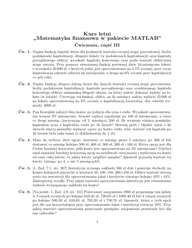 Kurs letni „Matematyka finansowa w pakiecie MATLAB” Ćwiczenia, część III Ćw. 1. Napisz funkcję kapital, która dla podanych wartości rocznej stopy procentowej, liczby podokresów kapitalizacji, długości lokaty (w podokresach kapitalizacji) oraz kapitału początkowego obliczy wysokość kapitału końcowego oraz poda wartość efektywnej stopy zwrotu. Przy pomocy utworzonej funkcji porównaj dwie 24-miesięczne lokaty o wysokości 20 000 zł, z których jedna jest oprocentowana na 5,5% rocznie, przy czym kapitalizacja odsetek odbywa się miesięcznie, a druga na 6% rocznie przy kapitalizacji co pół roku. Ćw. 2. Napisz funkcję dlugosc lokaty, która dla danych wartości rocznej stopy procentowej, liczby podokresów kapitalizacji, kapitału początkowego oraz oczekiwanego kapitału końcowego obliczy minimalną długość okresu, na który należy dokonać wpłaty na lokatę (w latach). Używając tej funkcji, oblicz, na ile miesięcy należy wpłacić 25 000 zł na lokatę oprocentowaną na 6% rocznie z kapitalizacją kwartalną, aby odsetki wyniosły 2000 zł. Ćw. 3. Pan Kowalski założył dwa konta: po jednym dla syna i córki. Wysokość oprocentowania wynosi 3% miesięcznie. Synowi wpłaca regularnie po 100 zł miesięcznie, a córce co drugi miesiąc (zaczynając od 2. miesiąca) 200 zł. Ile wyniesie różnica pomiędzy kapitałem syna a kapitałem córki po 10 latach? Metodą prób i błędów ustal o ile złotych więcej musiałby wpłacać ojciec na konto córki, żeby wartość ich kapitału po 10 latach była taka sama (z dokładnością do 1 zł). Ćw. 4. Masz do wybory dwie opcje: dostawać co miesiąc przez 5 miesięcy po 300 zł lub dostawać co miesiąc kolejno 500 zł, 400 zł, 300 zł, 200 zł i 100 zł. Która opcja jest dla Ciebie bardziej korzystna, jeśli konto jest oprocentowane na 3% miesięcznie? Gdybyś miał zamienić bardziej korzystną opcję na możliwość otrzymania i wpłacenia na konto od razu całej kwoty, to jakiej kwoty mógłbyś zażądać? Sprawdź przyszłą wartość tej kwoty (uwaga: po 4, a nie 5 miesiącach!). Ćw. 5. [1, Zad. 7.1. str. 267] Inwestycja wymaga nakładu 500 zł dziś i generuje dochody na koniec kolejnych pięciu lat w kwotach 50, 100, 150, 200 i 250 zł. Oblicz wartość obecną netto tej inwestycji dla oprocentowania lokat i kredytów równego kolejno 10% i 14%. Zinterpretuj wyniki. Przy jakiej wartości oprocentowania inwestycja jest równoważna wpłacie wymaganego nakładu na konto? Ćw. 6. [Na podst. 1, Zad. 4.9. str. 151] Pożyczamy znajomemu 1900 zł proponując mu spłatę w 3 ratach rocznych po kolejno 610,45 zł, 720,65 zł i 1096,49 zł lub 4 ratach rocznych po kolejno 500,50 zł, 610,65 zł, 705,20 zł i 730,70 zł. Sprawdź, która z tych opcji jest dla nas korzystniejsza przy oprocentowaniu lokat i inwestycji równym 10%. Przy jakiej wartości oprocentowania pożyczanie pieniędzy znajomemu przestanie być dla nas opłacalne? 1 Ćw. 7. Pan Kowalski wziął jednocześnie dwa kredyty. Pierwszy na 5 lat, oprocentowany na 6% rocznie z miesięczną ratą w wysokości 270,66 zł. Drugi na 7 lat, oprocentowany na 6,5% rocznie z miesięczną ratą w wysokości 237,59 zł. W domu przemyślał sytuację i stwierdził, że nie będzie w stanie spłacać tych kredytów, gdyż łączna wysokość rat przekroczyła 500 zł. a) Pan Kowalski postanowił zamienić oba te kredyty na 7-letni kredyt konsolidacyjny oprocentowany na 6,25%. Wyznacz wysokość rat tego kredytu. b) Pan Kowalski postanowił zamienić oba te kredyty na kredyt konsolidacyjny oprocentowany na 6,25%, którego rata będzie wynosić 495 zł. Czy będzie go spłacał dłużej niż 6 lat? c) Przy jakim oprocentowaniu kredytu konsolidacyjnego pan Kowalski spłaci kredyt w ciągu 6 lat, płacąc po 500 zł miesięcznie? Ćw. 8. Napisz funkcję, która dla podanej wysokości kredytu, oprocentowania rocznego oraz zakresu okresu kredytowania (w miesiącach) będzie rysować wykres prezentujący zależność wysokości rat miesięcznych od okresu kredytowania. Ćw. 9. Dla 3-letniego kredytu w wysokości 30 000 zł zaciągniętego przy oprocentowaniu równym 6% sporządź schemat spłaty, uwzględniając wysokość rat, wysokość ich części kapitałowej i odsetkowej oraz wartość bieżącego zadłużenia. Ćw. 10. Wyznacz cenę 3-letniej obligacji o nominale 1000 zł i kuponie 30 zł płatnym co pół roku, przy rocznej stopie procentowej równej 4,04%. Sprawdź, ile wynosi bieżąca cena netto takiej inwestycji. Jak zmieni się cena obligacji, jeśli zakupu dokonujemy nie w momencie emisji, ale miesiąc później? Ćw. 11. Sprawdź, czy zakup 5-letniej obligacji o nominale 1000 zł i kuponie 40 zł płatnym co pół roku za cenę 1050 zł jest bardziej opłacalny niż wpłata tej sumy na konto o oprocentowaniu 5%. Ćw. 12. Dla 3-letniej obligacji wyemitowanej w dniu 1 czerwca 2010 roku o nominale 200 zł i kuponach w wysokości 10 zł płatnych dwa razy do roku wyznacz generowany przez nią strumień pieniądza oraz daty płatności kuponów. Bibliografia: [1] Maria Podgórska, Joanna Klimkowska: Matematyka finansowa, PWN, Warszawa 2005. 2