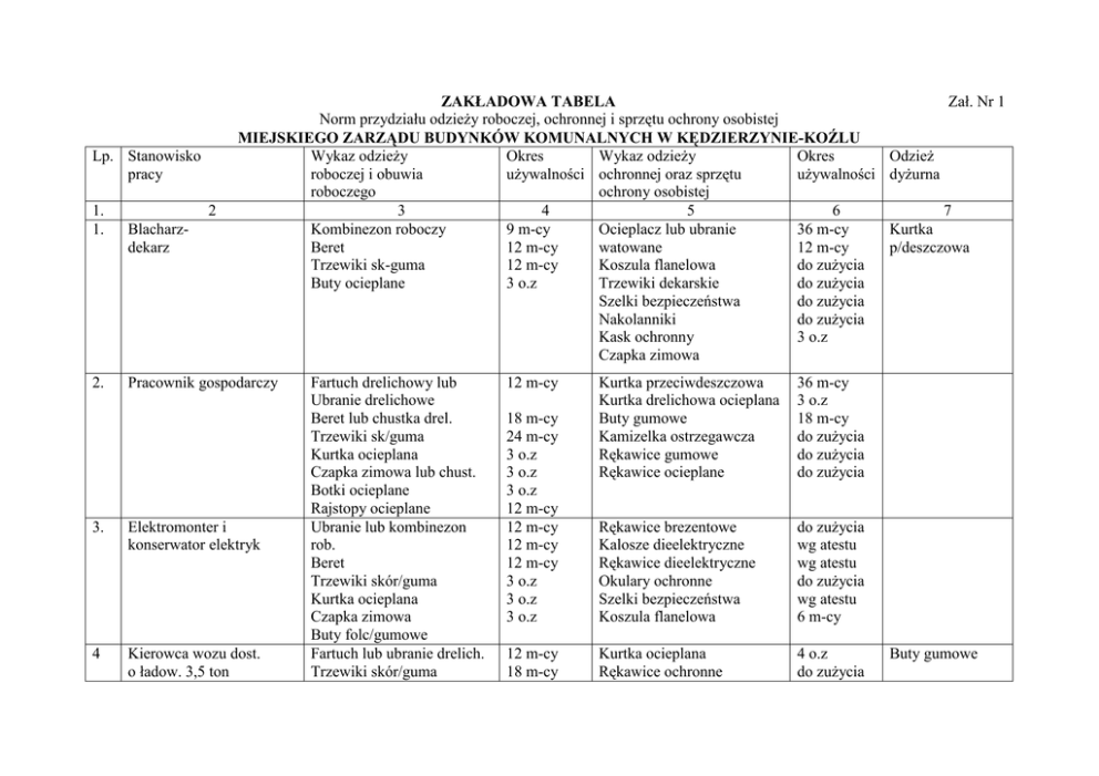 Lp. Stanowisko pracy 1. 1. 2. 2 Blacharzdekarz ZAKŁADOWA TABELA Norm przydziału odzieŜy roboczej, ochronnej i sprzętu ochrony osobistej MIEJSKIEGO ZARZĄDU BUDYNKÓW KOMUNALNYCH W KĘDZIERZYNIE-KOŹLU Wykaz odzieŜy Okres Wykaz odzieŜy Okres roboczej i obuwia uŜywalności ochronnej oraz sprzętu uŜywalności roboczego ochrony osobistej 3 4 5 6 Kombinezon roboczy 9 m-cy Ocieplacz lub ubranie 36 m-cy Beret 12 m-cy watowane 12 m-cy Trzewiki sk-guma do zuŜycia 12 m-cy Koszula flanelowa Buty ocieplane 3 o.z Trzewiki dekarskie do zuŜycia Szelki bezpieczeństwa do zuŜycia Nakolanniki do zuŜycia Kask ochronny 3 o.z Czapka zimowa Pracownik gospodarczy 3. Elektromonter i konserwator elektryk 4 Kierowca wozu dost. o ładow. 3,5 ton Fartuch drelichowy lub Ubranie drelichowe Beret lub chustka drel. Trzewiki sk/guma Kurtka ocieplana Czapka zimowa lub chust. Botki ocieplane Rajstopy ocieplane Ubranie lub kombinezon rob. Beret Trzewiki skór/guma Kurtka ocieplana Czapka zimowa Buty folc/gumowe Fartuch lub ubranie drelich. Trzewiki skór/guma 12 m-cy 18 m-cy 24 m-cy 3 o.z 3 o.z 3 o.z 12 m-cy 12 m-cy 12 m-cy 12 m-cy 3 o.z 3 o.z 3 o.z Kurtka przeciwdeszczowa Kurtka drelichowa ocieplana Buty gumowe Kamizelka ostrzegawcza Rękawice gumowe Rękawice ocieplane 36 m-cy 3 o.z 18 m-cy do zuŜycia do zuŜycia do zuŜycia Rękawice brezentowe Kalosze dieelektryczne Rękawice dieelektryczne Okulary ochronne Szelki bezpieczeństwa Koszula flanelowa do zuŜycia wg atestu wg atestu do zuŜycia wg atestu 6 m-cy 12 m-cy 18 m-cy Kurtka ocieplana Rękawice ochronne 4 o.z do zuŜycia Zał. Nr 1 OdzieŜ dyŜurna 7 Kurtka p/deszczowa Buty gumowe Beret Botki ocieplane 24 m-cy 2 o.z Okulary przeciwsłoneczne do zuŜcia Koszula flanelowa Kalesony Onuce flanelowe Rękawice drelichowe Okulary przeciwsłoneczne Okulary ochronne Rękawice gumowe Okulary ochronne Kask ochronny Okulary p.odpryskowe Rękawice drelichowe Pas szelkowy z linką Rękawice ochronne 6 m-cy 6 m-cy 3 m-cy do zuŜycia do zuŜycia do zuŜycia o zuŜycia do zuŜycia do zuŜycia do zuŜycia do zuŜycia wg atestu do zuŜycia Buty gumowe Onuce flanelowe Koszula flanelowa Kalesony Okulary ochronne Maska p.gaz Kamizelka ostrzegawcza Koszula flanelowa Buty gumowe Rękawice brezentowe Kask ochronny 12 m-cy 3 m-cy 6 m-cy 6 m-cy do zuŜycia do zuŜycia do zuŜycia 12 m-cy 12 m-cy do zuŜycia do zuŜycia 5 Kierowca ciągnika Ubranie drelichowe Beret Trzewiki skór/guma Czapka ocieplana Kurtka ocieplana Botki ocieplane 9 m-cy 9 m-cy 18 m-cy 3 o.z 3 o.z 3 o.z 6. Mechanik warsztatowy ślusarz 7 Magazynier , Robotnik magazynowy 8. Monter instalacji c.o Wod-kan, gaz 9. Murarz ,tynkarz Robotnik budowlany Kombinezon roboczy Beret Trzewiki skór/guma Kurtka ocieplana Koszula flanelowa Fartuch drelichowy Beret Trzewiki skór/guma Kurtka ocieplana Czapka ocieplana Buty ocieplane Ubranie drelichowe Beret Trzewiki skór/guma Buty filcowo/gum Kurtka p.deszczowa Czapka ocieplana Kurtka ocieplana Ubranie drelichowe Beret Trzewiki skór/guma z noskami stalowymi 9 m-cy 12 m-cy 12 m-cy 3 o.z 6 m-cy 12 m-cy 12 m-cy 12 m-cy 3 o.z 3 o.z 3 o.z 6 m-cy 12 m-cy 12 m-cy 3 o.z 36 m-cy 2 o.z 2 o.z 6 m-cy 12 m-cy 12 m-cy Buty gumowe Kurtka przeciwdeszczowa Buty rybackie Kurtka p.deszczowa 10. Stolarz budowlany 11. Sprzątaczka 12 Pracownik zaopatrzenia sam dokonujący zakupy o. z – okres zimowy Opracowała:W.Piątek Ocieplacz lub ubranie watowane Czapka zimowa Buty filc/gumowe Kombinezon drelichowy Beret Trzewiki skór/guma Kurtka ocieplana Czapka ocieplana Buty filcowo/gumowe Fartuch ochronny Chustka kretonowa Trzewiki profilaktyczne Fartuch Beret Trzewiki skór/guma Botki ocieplane 3 o.z 3 o.z 3 o.z 6 m-cy 12 m-cy 12 m-cy 3 o.z 3 o.z 3 o.z 15 m-cy 12 m-cy 12 m-cy 12 m-cy 24 m-ce 24 m-cy 3 o.z Okulary ochronne Szelki ochronne z linką Fartuch przedni brezentowy Onuce Fartuch brezentowy przedni Rękawice brezentowe Koszula flanelowa Okulary ochronne Maska p.pyłowa Ochrony słuchu Rękawice gumowe Pas bezp. z linką do zuŜycia wg atestu do zuŜycia 3 m-ce do zuŜycia do zuŜycia 12 m-cy do zuŜycia do zuŜycia do zuŜycia do zuŜycia wg atestu Płaszcz p.deszczowy Rękawice ocieplane Rękawice drelichowe Kurtka ocieplana 36 m-cy 3 o.z do zuŜycia 3 o.z Buty gumowe