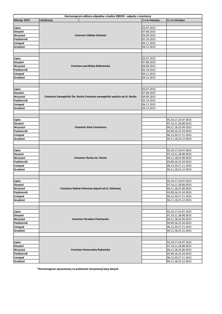 Miesiąc 2015 Lipiec Sierpień Wrzesień Październik Listopad Grudzień Lipiec Sierpień Wrzesień Październik Listopad Grudzień Lipiec Sierpień Wrzesień Październik Listopad Grudzień Lipiec Sierpień Wrzesień Październik Listopad Grudzień Lipiec Sierpień Wrzesień Październik Listopad Grudzień Lipiec Sierpień Wrzesień Październik Listopad Grudzień Lipiec Sierpień Wrzesień Październik Listopad Grudzień Lipiec Sierpień Wrzesień Październik Listopad Grudzień Lokalizacja Harmonogram odbioru odpadów o kodzie 200203 - odpady z cmentarzy 1 x w miesiącu Cmentarz Dźbów Ostatnia Cmentarz parafialny Białostocka Cmentarz Ewangelicki Św. Rocha Cmentarz ewangelicki wejście od ul. Rocha Cmentarz Kule Cmentarna Cmentarz Rocha św. Rocha Cmentarz Raków Palmowa dojazd od ul. Osikowej Smentarz Stradom Piastowska Cmentarz Komunalny Radomska *Harmonogram opracowany na podstawie otrzymanej bazy danych 4 x w miesiącu 03.07.2015 07.08.2015 04.09.2015 02.10.2015 06.11.2015 04.12.2015 03.07.2015 07.08.2015 04.09.2015 02.10.2015 06.11.2015 04.12.2015 03.07.2015 07.08.2015 04.09.2015 02.10.2015 06.11.2015 04.12.2015 03,10,17,24.07.2015 07,14,21,28.08.2015 04,11,18,25.09.2015 02,09,16,23.10.2015 06,13,20,27.11.2015 04,11,18,23.12.2015 03,10,17,24.07.2015 07,14,21,28.08.2015 04,11,18,25.09.2015 02,09,16,23.10.2015 06,13,20,27.11.2015 04,11,18,23.12.2015 03,10,17,24.07.2015 07,14,21,28.08.2015 04,11,18,25.09.2015 02,09,16,23.10.2015 06,13,20,27.11.2015 04,11,18,23.12.2015 03,10,17,24.07.2015 07,14,21,28.08.2015 04,11,18,25.09.2015 02,09,16,23.10.2015 06,13,20,27.11.2015 04,11,18,23.12.2015 03,10,17,24.07.2015 07,14,21,28.08.2015 04,11,18,25.09.2015 02,09,16,23.10.2015 06,13,20,27.11.2015 04,11,18,23.12.2015