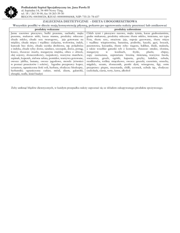 Podhalański Szpital Specjalistyczny im. Jana Pawła II ul. Szpitalna 14, 34-400 Nowy Targ, tel. 18 / 263 30 00, fax 18 263-39-50 REGON: 000308324, RZOZ: 000000006068, NIP: 735-21-78-657 ZALECENIA DIETETYCZNE - DIETA UBOGORESZTKOWA Wszystkie posiłki w diecie mają konsystencję płynną, pokarm po ugotowaniu należy przetrzeć lub zmiksować produkty wskazane Jasne czerstwe pieczywo, bułki pszenne, sucharki, mąka pszenna, makaron nitki, kasza manna, produkty mleczne: chude mleko, chude sery twarogowe, jaja gotowane na miękko, chude mięsa i wędliny: cielęcina, wołowina, indyk, kurczak bez skóry, chuda szynka drobiowa, np. polędwica z indyka, chude ryby: dorsz, sandacz, szczupak, dorsz, pstrąg, leszcz, tłuszcze: masło, margaryna miękka, oliwa z oliwek, olej sojowy, słonecznikowy, rzepakowy, warzywa: marchew, szpinak, koperek, zielona sałata, pomidor, warzywa gotowane, owoce: jabłka, banany, owoce jagodowe, morele (również w postaci przecierów i soków), łagodne przyprawy: koper, cynamon, ograniczona ilość soli, herbata, słodycze: biszkopty, herbatniki; ograniczone: cukier, miód, dżem, galaretki, chrupki, wafle, kisiel budyń produkty zabronione Chleb żytni i pieczywo razowe, mąka żytnia, kasze gruboziarniste, grube makarony, produkty mleczne: tłuste mleko, śmietana, ser typu Feta, tłuste sery, smażone jaja, napoje gazowane, tłuste mięsa i wędliny: wieprzowina, baranina, podroby, kaczki, gęsi, boczek, pasztetowa, kaszanka, tłuste ryby: węgorz, halibut, śledź, makrela, a także wszelkie gatunki ryb z konserw, tłuszcze: smalec, słonina, margaryny w kostkach, frytki, placki, chipsy, zupy zasmażane, zaprawiane kwaśną śmietaną, warzywa: fasola, soczewica, groch, ogórki, kapusta, grzyby, kalafior, cebula, rzodkiewka, rośliny strączkowe, owoce: gruszki, czereśnie, orzechy, migdały, sezam, słonecznik, pestki dyni, winogrona, figi, ostre przyprawy: pieprz, musztarda, chilli, czosnek, cebula itp., słodycze: czekolada, ciasta, torty, kawa, alkohol Żeby uniknąć błędów dietetycznych, w każdym przepadku należy zapoznać się ze składem zakupywanego produktu spożywczego.