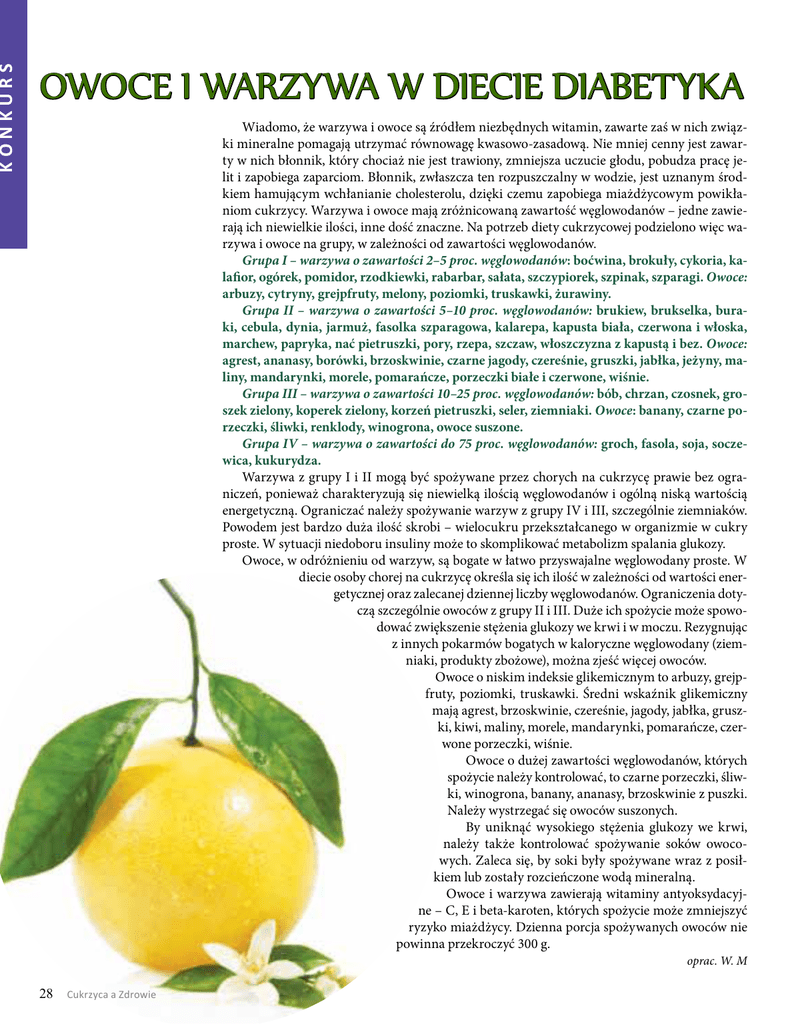KONKURS OWOCE I WARZYWA W DIECIE DIABETYKA Wiadomo, że warzywa i owoce są źródłem niezbędnych witamin, zawarte zaś w nich związki mineralne pomagają utrzymać równowagę kwasowo-zasadową. Nie mniej cenny jest zawarty w nich błonnik, który chociaż nie jest trawiony, zmniejsza uczucie głodu, pobudza pracę jelit i zapobiega zaparciom. Błonnik, zwłaszcza ten rozpuszczalny w wodzie, jest uznanym środkiem hamującym wchłanianie cholesterolu, dzięki czemu zapobiega miażdżycowym powikłaniom cukrzycy. Warzywa i owoce mają zróżnicowaną zawartość węglowodanów – jedne zawierają ich niewielkie ilości, inne dość znaczne. Na potrzeb diety cukrzycowej podzielono więc warzywa i owoce na grupy, w zależności od zawartości węglowodanów. Grupa I – warzywa o zawartości 2–5 proc. węglowodanów: boćwina, brokuły, cykoria, kalafior, ogórek, pomidor, rzodkiewki, rabarbar, sałata, szczypiorek, szpinak, szparagi. Owoce: arbuzy, cytryny, grejpfruty, melony, poziomki, truskawki, żurawiny. Grupa II – warzywa o zawartości 5–10 proc. węglowodanów: brukiew, brukselka, buraki, cebula, dynia, jarmuż, fasolka szparagowa, kalarepa, kapusta biała, czerwona i włoska, marchew, papryka, nać pietruszki, pory, rzepa, szczaw, włoszczyzna z kapustą i bez. Owoce: agrest, ananasy, borówki, brzoskwinie, czarne jagody, czereśnie, gruszki, jabłka, jeżyny, maliny, mandarynki, morele, pomarańcze, porzeczki białe i czerwone, wiśnie. Grupa III – warzywa o zawartości 10–25 proc. węglowodanów: bób, chrzan, czosnek, groszek zielony, koperek zielony, korzeń pietruszki, seler, ziemniaki. Owoce: banany, czarne porzeczki, śliwki, renklody, winogrona, owoce suszone. Grupa IV – warzywa o zawartości do 75 proc. węglowodanów: groch, fasola, soja, soczewica, kukurydza. Warzywa z grupy I i II mogą być spożywane przez chorych na cukrzycę prawie bez ograniczeń, ponieważ charakteryzują się niewielką ilością węglowodanów i ogólną niską wartością energetyczną. Ograniczać należy spożywanie warzyw z grupy IV i III, szczególnie ziemniaków. Powodem jest bardzo duża ilość skrobi – wielocukru przekształcanego w organizmie w cukry proste. W sytuacji niedoboru insuliny może to skomplikować metabolizm spalania glukozy. Owoce, w odróżnieniu od warzyw, są bogate w łatwo przyswajalne węglowodany proste. W diecie osoby chorej na cukrzycę określa się ich ilość w zależności od wartości energetycznej oraz zalecanej dziennej liczby węglowodanów. Ograniczenia dotyczą szczególnie owoców z grupy II i III. Duże ich spożycie może spowodować zwiększenie stężenia glukozy we krwi i w moczu. Rezygnując z innych pokarmów bogatych w kaloryczne węglowodany (ziemniaki, produkty zbożowe), można zjeść więcej owoców. Owoce o niskim indeksie glikemicznym to arbuzy, grejpfruty, poziomki, truskawki. Średni wskaźnik glikemiczny mają agrest, brzoskwinie, czereśnie, jagody, jabłka, gruszki, kiwi, maliny, morele, mandarynki, pomarańcze, czerwone porzeczki, wiśnie. Owoce o dużej zawartości węglowodanów, których spożycie należy kontrolować, to czarne porzeczki, śliwki, winogrona, banany, ananasy, brzoskwinie z puszki. Należy wystrzegać się owoców suszonych. By uniknąć wysokiego stężenia glukozy we krwi, należy także kontrolować spożywanie soków owocowych. Zaleca się, by soki były spożywane wraz z posiłkiem lub zostały rozcieńczone wodą mineralną. Owoce i warzywa zawierają witaminy antyoksydacyjne – C, E i beta-karoten, których spożycie może zmniejszyć ryzyko miażdżycy. Dzienna porcja spożywanych owoców nie powinna przekroczyć 300 g. oprac. W. M 28 Cukrzyca a Zdrowie