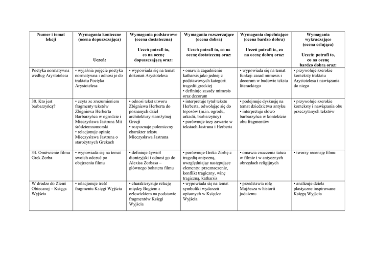 Numer i temat lekcji Wymagania konieczne (ocena dopuszczająca) Wymagania podstawowe (ocena dostateczna) Wymagania rozszerzające (ocena dobra) Wymagania dopełniające (ocena bardzo dobra) Uczeń potrafi to, co na ocenę dostateczną oraz: Uczeń potrafi to, co na ocenę dobrą oraz: Uczeń: Uczeń potrafi to, co na ocenę dopuszczającą oraz: • omawia zagadnienie katharsis jako jednej z podstawowych kategorii tragedii greckiej • definiuje zasady mimesis oraz decorum • interpretuje tytuł tekstu Herberta, odwołując się do toposów (m.in. ogrodu, arkadii, barbarzyńcy) • porównuje tezy zawarte w tekstach Jastruna i Herberta • wypowiada się na temat funkcji zasad mimesis i decorum w budowie tekstu literackiego • podejmuje dyskusję na temat dziedzictwa antyku • interpretuje słowo barbarzyńca w kontekście obu fragmentów • przywołuje szerokie konteksty i nawiązania obu przeczytanych tekstów • porównuje Greka Zorbę z tragedią antyczną, uwzględniając następujące elementy: przeznaczenie, konflikt tragiczny, winę tragiczną, katharsis • wypowiada się na temat symboliki wydarzeń opisanych w Księdze Wyjścia • omawia znaczenia tańca w filmie i w antycznych obrzędach religijnych • tworzy recenzję filmu • przedstawia rolę Mojżesza w historii judaizmu • analizuje dzieła plastyczne inspirowane Księgą Wyjścia Poetyka normatywna według Arystotelesa • wyjaśnia pojęcie poetyka normatywna i odnosi je do traktatu Poetyka Arystotelesa • wypowiada się na temat dokonań Arystotelesa 30. Kto jest barbarzyńcą? • czyta ze zrozumieniem fragmenty tekstów Zbigniewa Herberta Barbarzyńca w ogrodzie i Mieczysława Jastruna Mit śródziemnomorski • relacjonuje opinię Mieczysława Jastruna o starożytnych Grekach • odnosi tekst utworu Zbigniewa Herberta do poznanych dzieł architektury starożytnej Grecji • rozpoznaje polemiczny charakter tekstu Mieczysława Jastruna 34. Omówienie filmu Grek Zorba • wypowiada się na temat swoich odczuć po obejrzeniu filmu • definiuje żywioł dionizyjski i odnosi go do Alexisa Zorbasa – głównego bohatera filmu W drodze do Ziemi Obiecanej – Księga Wyjścia • relacjonuje treść fragmentu Księgi Wyjścia • charakteryzuje relację między Bogiem a człowiekiem na podstawie fragmentów Księgi Wyjścia Wymagania wykraczające (ocena celująca) Uczeń: potrafi to, co na ocenę bardzo dobrą oraz: • przywołuje szerokie konteksty traktatu Arystotelesa i nawiązania do niego O miłości bliźniego – Pierwszy list św. Jana Apostoła • omawia obraz miłości wyłaniający się z listu św. Jana • wyjaśnia znaczenie pojęć kazanie i list apostolski • dostrzega i charakteryzuje rewolucyjność nauki Jezusa z Nazaretu zawartej w liście św. Jana • podejmuje dyskusję na temat funkcjonowania przykazania miłości bliźniego • porównuje obraz Fra Angelica Kazanie na górze z treścią listu św. Jana • przywołuje szerokie konteksty listu św. Jana i nawiązania do niego Poezja współczesna inspirowana Biblią • odczytuje ze zrozumieniem treść wierszy Zbigniewa Herberta Książka i Anny Achmatowej Żona Lota • relacjonuje historie zburzenia Sodomy i Gomory • nazywa rodzaj liryki występujący w utworach • relacjonuje treść fragmentu Pochwała stworzenia • charakteryzuje Pochwałę stworzenia jako hymn • określa adresata i nadawcę wierszy • rozpoznaje bohaterów lirycznych wiersza Achmatowej • odnajduje nawiązania biblijne w wierszu Herberta • określa stosunek podmiotu lirycznego do Biblii w wierszu Herberta oraz do żony Lota w wierszu Achmatowej • interpretuje oba wiersze • pisze analizę porównawczą obu utworów • porównuje postawy dwóch świętych: św. Franciszka i św. Aleksego • interpretuje dzieło Giotta • wyjaśnia znaczenie pojęcia franciszkanizm • przywołuje szerokie konteksty interpretacyjne związane z postacią św. Franciszka • czyta ze zrozumieniem fragment Wielkiego testamentu • prezentuje życiorys Villona, stanowiący kanwę utworu dla fragmentów utworu: • na podstawie fragmentów Boskiej Komedii ogólnie omawia budowę piekła, czyśćca i raju dla całości utworu: • opisuje budowę zaświatów • wyjaśnia znaczenie słowa prekursor • interpretuje tytuł tekstu • wyjaśnia znaczenie pojęcia testament poetycki • odnajduje w tekście elementy stylu biblijnego • wyraża opinię na temat dwóch dróg do świętości – św. Aleksego i św. Franciszka • wypowiada się na temat środków stylistycznych użytych w wierszu oraz zastosowanej w nim kompozycji • porównuje obraz przemijania zawarty w Wielkim Testamencie ze współczesnymi wyobrażeniami na ten temat dla fragmentów utworu: • wypowiada się na temat sposobu obrazowania w utworze dla całości utworu: • interpretuje symbole obecne w dziele Dantego • przywołuje szerokie konteksty wywodzące się z Wielkiego testamentu i nawiązania do utworu Świętość afirmacyjna – św. Franciszek Testament poetycki François Villona Podróż po zaświatach – Boska Komedia Dantego Alighieri dla fragmentów utworu: • charakteryzuje narratora Boskiej Komedii • wyjaśnia znaczenie tytułu tekstu dla całości utworu: • wypowiada się na temat postaci pojawiających się w utworze • tłumaczy znaczenie pojęć poemat epicki i summa dla fragmentów utworu: • wylicza elementy dzieła charakterystyczne dla średniowiecza i renesansu dla całości utworu: • wymienia i ilustruje przykładami elementy dzieła charakterystyczne dla średniowiecza i dla renesansu • omawia fresk Dante i trzy królestwa Poetycki komentarz do ascezy • rozpoznaje kontekst literacki wiersza Kazimiery Iłłakowiczówny Opowieść małżonki św. Aleksego • określa typ liryki występujący w utworze, a także wskazuje podmiot liryczny i adresata wiersza • porównuje legendę średniowieczną z poetyckim komentarzem współczesnej poetki • omawia konteks