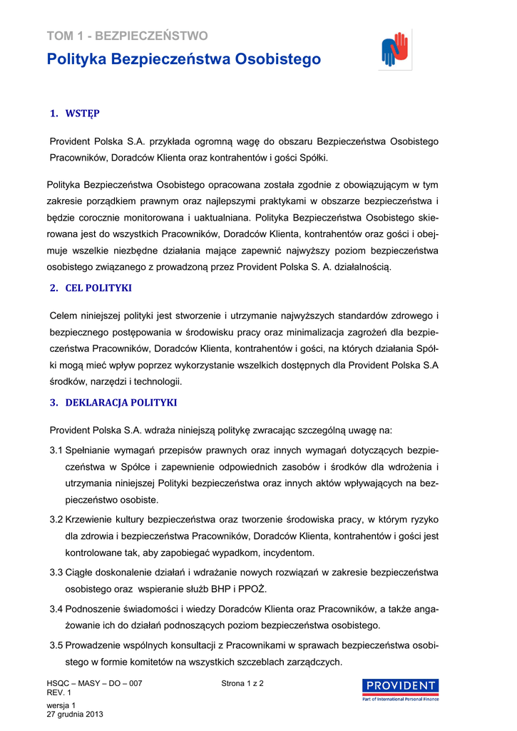 TOM 1 - BEZPIECZEŃSTWO Polityka Bezpieczeństwa Osobistego 1. WSTĘP Provident Polska S.A. przykłada ogromną wagę do obszaru Bezpieczeństwa Osobistego Pracowników, Doradców Klienta oraz kontrahentów i gości Spółki. Polityka Bezpieczeństwa Osobistego opracowana została zgodnie z obowiązującym w tym zakresie porządkiem prawnym oraz najlepszymi praktykami w obszarze bezpieczeństwa i będzie corocznie monitorowana i uaktualniana. Polityka Bezpieczeństwa Osobistego skierowana jest do wszystkich Pracowników, Doradców Klienta, kontrahentów oraz gości i obejmuje wszelkie niezbędne działania mające zapewnić najwyższy poziom bezpieczeństwa osobistego związanego z prowadzoną przez Provident Polska S. A. działalnością. 2. CEL POLITYKI Celem niniejszej polityki jest stworzenie i utrzymanie najwyższych standardów zdrowego i bezpiecznego postępowania w środowisku pracy oraz minimalizacja zagrożeń dla bezpieczeństwa Pracowników, Doradców Klienta, kontrahentów i gości, na których działania Spółki mogą mieć wpływ poprzez wykorzystanie wszelkich dostępnych dla Provident Polska S.A środków, narzędzi i technologii. 3. DEKLARACJA POLITYKI Provident Polska S.A. wdraża niniejszą politykę zwracając szczególną uwagę na: 3.1 Spełnianie wymagań przepisów prawnych oraz innych wymagań dotyczących bezpieczeństwa w Spółce i zapewnienie odpowiednich zasobów i środków dla wdrożenia i utrzymania niniejszej Polityki bezpieczeństwa oraz innych aktów wpływających na bezpieczeństwo osobiste. 3.2 Krzewienie kultury bezpieczeństwa oraz tworzenie środowiska pracy, w którym ryzyko dla zdrowia i bezpieczeństwa Pracowników, Doradców Klienta, kontrahentów i gości jest kontrolowane tak, aby zapobiegać wypadkom, incydentom. 3.3 Ciągłe doskonalenie działań i wdrażanie nowych rozwiązań w zakresie bezpieczeństwa osobistego oraz wspieranie służb BHP i PPOŻ. 3.4 Podnoszenie świadomości i wiedzy Doradców Klienta oraz Pracowników, a także angażowanie ich do działań podnoszących poziom bezpieczeństwa osobistego. 3.5 Prowadzenie wspólnych konsultacji z Pracownikami w sprawach bezpieczeństwa osobistego w formie komitetów na wszystkich szczeblach zarządczych. HSQC – MASY – DO – 007 REV. 1 wersja 1 27 grudnia 2013 Strona 1 z 2 TOM 1 - BEZPIECZEŃSTWO Polityka Bezpieczeństwa Osobistego 4. ROLE I ODPOWIEDZIALNOŚĆ 4.1 Zarząd Provident Polska S.A. jest odpowiedzialny za wspieranie wszelkich działań poprawiających poziom bezpieczeństwa osobistego w szczególności związanych z przepisami prawa, rozważenie wszelkich rozwiązań mogących przyczyniać się do ograniczania ryzyka w zakresie bezpieczeństwa osobistego. 4.2 Dyrektorzy oraz Kierownicy wszystkich szczebli ponoszą odpowiedzialność za wprowadzanie skutecznych działań w celu zapewnienia bezpieczeństwa osobistego Pracowników, Doradców Klienta, kontrahentów i gości oraz za zapewnienie, że podstawowe obowiązki w zakresie bezpieczeństwa osobistego są spełnione. 4.3 Wszyscy Pracownicy ponoszą odpowiedzialność za zapewnienie, że miejsca i metody pracy są bezpieczne dla nich samych, Doradców Klienta, kontrahentów i gości przebywających na terenie Spółki. 4.4 Wszyscy Pracownicy ponoszą odpowiedzialność za zgłaszanie wszelkich wypadków, incydentów oraz innych zdarzeń mogących mieć wpływ na bezpieczeństwo osobiste, bez zbędnej zwłoki, zgodnie z wymogami wewnętrznymi Spółki. HSQC – MASY – DO – 007 REV. 1 wersja 1 27 grudnia 2013 Strona 2 z 2