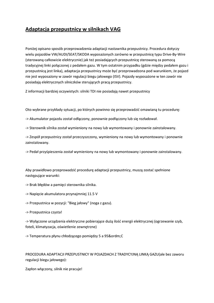 Adaptacja przepustnicy w silnikach VAG Poniżej opisano sposób przeprowadzenia adaptacji nastawnika przepustnicy. Procedura dotyczy wielu pojazdów VW/AUDI/SEAT/SKODA wyposażonych zarówno w przepustnicę typu Drive-By-Wire (sterowaną całkowicie elektrycznie) jak też posiadających przepustnicę sterowaną za pomocą tradycyjnej linki połączonej z pedałem gazu. W tym ostatnim przypadku (gdzie między pedałem gazu i przepustnicą jest linka), adaptacja przepustnicy może być przeprowadzona pod warunkiem, że pojazd nie jest wyposażony w zawór regulacji biegu jałowego (ISV). Pojazdy wyposażone w ten zawór nie posiadają elektrycznych silniczków sterujących pracą przepustnicy. Z informacji bardziej oczywistych: silniki TDI nie posiadają nawet przepustnicy Oto wybrane przykłady sytuacji, po których powinno się przeprowadzić omawianą tu procedurę: -> Akumulator pojazdu został odłączony, ponownie podłączony lub się rozładował. -> Sterownik silnika został wymieniony na nowy lub wymontowany i ponownie zainstalowany. -> Zespół przepustnicy został przeczyszczony, wymieniony na nowy lub wymontowany i ponownie zainstalowany. -> Pedał przyśpieszenia został wymieniony na nowy lub wymontowany i ponownie zainstalowany. Aby prawidłowo przeprowadzić procedurę adaptacji przepustnicy, muszą zostać spełnione następujące warunki: -> Brak błędów a pamięci sterownika silnika. -> Napięcie akumulatora przynajmniej 11.5 V -> Przepustnica w pozycji: "Bieg jałowy" (noga z gazu). -> Przepustnica czysta! -> Wyłączone urządzenia elektryczne pobierające dużą ilość energii elektrycznej (ogrzewanie szyb, foteli, klimatyzacja, oświetlenie zewnętrzne) -> Temperatura płynu chłodzącego pomiędzy 5 a 95ºC PROCEDURA ADAPTACJI PRZEPUSTNICY W POJAZDACH Z TRADYCYJNĄ LINKĄ GAZU(ale bez zaworu regulacji biegu jałowego): Zapłon włączony, silnik nie pracuje! [Wybór] [01 - Silnik] [Bloki pomiarowe - 08] Wybierz grupę "098" (lub grupę "001" w niektórych pojazdach wyposażonych w sterowniki SIMOS i Marelli np. silniki ADY i AEE). [Idź!] [Przełącz na Nastawy - 04] Po przełączaniu na Nastawy podstawowe w górnym, prawym polu ekranu pojawi się informacja: "Adapt. trwa" i rozpocznie się proces adaptacji. Można będzie również usłyszeć pracę przepustnicy i zauważyć jak zmieniają się pewne wartości wyświetlane przez program VAG-COM. System należy pozostawić w nastawach podstawowych przez około 30 sekund, po czym można ponownie przełączyć na : [Bloki pomiarowe - 08] ...i gotowe. PODCZAS WYKONYWANIA POWYŻSZEJ PROCEDURY NIE WOLNO DOTYKAĆ PEDAŁU GAZU I SILNIK NIE MOŻE BYĆ URUCHOMIONY. ________________________________________ PROCEDURA ADAPTACJI PRZEPUSTNICY W POJAZDACH Z PRZEPUSTNICĄ DBW(Sprawdź czy komunikacja z silnikiem jest realizowana przez protokół KWP-1281 - informacja widoczna w lewym, górnym rogu ekranu "Odczyt z sterownika"). Niektóre przykłady pojazdów, w których sterownik silnika wykorzystuje KWP-1281 ( rok prod. 2000 + ): Golf / GTi / Bora / Jetta / Nowy Beetle / Audi TT 1.8 T Zapłon włączony, silnik nie pracuje! [Wybór] [01 - Silnik] [Bloki pomiarowe - 08] Wybierz grupę "060". [Idź!] [Przełącz na Nastawy - 04] Po przełączaniu na Nastawy podstawowe w górnym, prawym polu ekranu pojawi się informacja: "Adapt. trwa" i rozpocznie się proces adaptacji. Można będzie również usłyszeć pracę przepustnicy i zauważyć jak zmieniają się pewne wartości wyświetlane przez program VAG-COM. System należy pozostawić w nastawach podstawowych przez około 30 sekund, po czym można ponownie przełączyć na : [Bloki pomiarowe - 08] ...i gotowe. PODCZAS WYKONYWANIA POWYŻSZEJ PROCEDURY NIE WOLNO DOTYKAĆ PEDAŁU GAZU I SILNIK NIE MOŻE BYĆ URUCHOMIONY. ________________________________________ PROCEDURA ADAPTACJI PRZEPUSTNICY W POJAZDACH Z PRZEPUSTNICĄ DBW (protokół KWP2000)(Sprawdź czy komunikacja z silnikiem jest realizowana przez protokół KWP-2000 - informacja widoczna w lewym, górnym rogu ekranu "Odczyt z sterownika"). Niektóre przykłady pojazdów, w których sterownik silnika wykorzystuje KWP-2000 ( rok prod. 2002 + ): / A4 / Passat / Touareg. Zapłon włączony, silnik nie pracuje! [Wybór] [01 - Silnik] [Nastawy podst. - 04] Wybierz grupę "060". [Idź!] Na górze ekranu powinna pojawić się informacja: Nastawy podstawowe: OFF. Kliknij przycisk: [ON/OFF/Dalej] Powinien pojawić się komunikat: Nastawy podstawowe: ON. Po przełączaniu na Nastawy podstawowe w górnym, prawym polu ekranu pojawi się informacja: "Adapt. trwa" i rozpocznie się proces adaptacji. Można będzie również usłyszeć pracę przepustnicy i zauważyć jak zmieniają się pewne wartości wyświetlane przez program VAG-COM. System należy pozostawić w nastawach podstawowych przez około 30 sekund, po czym ponownie kliknąć: [ON/OFF/Dalej] wyłączając w ten sposób Nastawy podstawowe. Na górze ekranu powinna pojawić się informacja: Nastawy podstawowe: OFF [Gotowe, powrót] PODCZAS WYKONYWANIA POWYŻSZEJ PROCEDURY NIE WOLNO DOTYKAĆ PEDAŁU GAZU I SILNIK NIE MOŻE BYĆ URUCHOMIONY. Źródło: www.vw-passat.pl