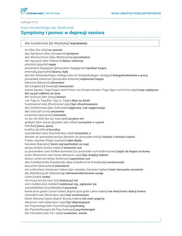 www.aterima-med.pl/niemiecki Lekcja nr 61 Kurs niemieckiego dla Opiekunek Symptomy i pomoc w depresji seniora die Ausdrücke [di Ałsdryke] wyrażenia: im Alter [im Alta] na starość das Symptom [das Zymptom] symptom das Wartezimmer [das Wartecyma] poczekalnia der Hausarzt [der Hałsarct] lekarz rodzinny plötzlich [plycliś] nagle jemandem begegnen [jemandem begejgnen] spotkać kogoś ehemalig [ejemaliś] dawny, były der/die Arbeitskollege/-kollegin [der/di Arbajtskolejge/-kolejgin] kolega/koleżanka z pracy jemanden erkennen [jemanden erkenen] rozpoznać kogoś Mensch! [Mensz!] człowieku! die Ewigkeit [di Ewiśkajt] wieczność meine besten Tage liegen wohl hinter mir [majne besten Tage ligen wol hinta mija] moje najlepsze dni są już całkiem za mną der Schluss [der Szlus] koniec von Tag zu Tag [fon Tag cu Tag] z dnia na dzień frustrierend sein [frustrirend zajn] być sfrustrowanym das Schlimmste [das Szlimste] najgorsze, coś najgorszego die Linse [di Linze] soczewka einsetzen [ajnzecen] wstawiać es tut mir leid! [es tut mija lajd!] przykro mi! grübeln über etwas [grybeln yba etfas] rozmyślać o czymś hell [hel] jasno, jasny kraftlos [kraftlos] bezsilny nachdenken über [nachdenken yba] rozmyślać o denken an jemanden/etwas [denken an jemanden/etfas] myśleć o kimś/o czymś Fehler machen [Fejla machen] robić błędy heiraten [hajraten] żenić się/wychodzić za mąż etwas ändern [etfas endern] zmieniać coś zu jemandem zum Kaffee kommen [cu jemanden cum Kafe komen] pójść do kogoś na kawę unter Menschen sein [unta Menszen zajn] być między ludźmi etwas verlernen [etfas ferlernen] zapominać coś das Enkelkind/die Enkelkinder [das Enkelkind/di Enkelkinda] wnuk/wnuki besuchen [bezuchen] odwiedzać ein schlechtes Gewissen haben [ajn szleśtes Gewisen haben] mieć nieczyste sumienie die Ablenkung [di Ablenkung] odmiana/odwrócenie uwagi rufen [rufen] wołać ich muss los [iś mus los] muszę już iść sich melden [ziś melden] meldować się, zgłaszać się zurückbleiben [zurykblajben] pozostać keine/eine guten Laune haben [kajne/ajne gute Lałne haben] nie mieć/mieć dobry humor verändert sein [ferendert zajn] być zmienionym keine Ahnung haben [kajne Anung haben] nie mieć pojęcia depressiv sein [depresiw zajn] być depresyjnym der Psychologe [der Psychologe] psycholog die Psychotherapie [di Psychoterapi] psychoterapia der Verrückte [der Fer-rykte] szaleniec, wariat 1 www.aterima-med.pl/niemiecki die Verrücktheit [di Fer-rykthajt] szaleństwo, obłęd unterstützen bei etwas [untasztycen baj etfas] wspierać podczas czegoś sich im Leben neu orientieren [ziś im Lejben noj orientiren] na nowo odnaleźć się w życiu Antidepressiva verschreiben [Antidepresiwa verszrajben] przepisać leki antydepresyjne die Stimmung aufheitern [di Sztymung ałfhajtern] poprawić nastrój die Blutabnahme [di Blutabname] pobieranie krwi hassen [hasen] nienawidzieć die Spritze [di Szpryce] zastrzyk Gefü̱hle und Emotionen [Gefyle und Emocjonen] uczucia i emocje: das Gefühl [das Gefyl] uczucie Gefühle ausdrücken/zeigen [Gefyle ałsdryken/cajgen] wyrażać/okazywać uczucia mit den Gefühlen spielen [mit den Gefylen szpilen] bawić się uczuciami ein (starkes) Gefühl haben [ajn (sztarkes) Gefyl haben] mieć (silne) przeczucie mit gemischten Gefühlen [mit gemiszten Gefylen] z mieszanymi uczuciami Herr seiner Gefühle sein [Her zajna Gefyle zajn] być panem swoich uczuć die Emotion [di Emocjon] emocja die Emotionen zurückhalten [di Emocjonen curykhalten] powściągać emocje die Laune [di Lałne] nastrój, humor gute/schlechte Laune haben [gute/szleśte Lałne haben] mieś dobry/zły nastrój gut/schlecht gelaunt sein [gut/szleśt gelałnt zajn] być w dobrym/złym nastroju die Stimmung [di Sztymung] nastrój, humor in guter/schlechter Stimmung sein [in guta/szleśta Sztymung zajn] być w dobrym/złym nastroju das Glück [das Glyk] szczęście (un)glücklich sein [(un)glykliś zajn] być (nie)szczęśliwym die Zufriedenheit/die Befriedigung [di Cufridenhajt/di Befridigung] zadowolenie die Heiterkeit [di Hajterkajt] radość, pogoda ducha befriedigt sein [befridigt zajn] być zadowolonym (un)zufrieden sein (mit etwas) [(un)cufriden zajn (mit etfas)] być (nie)zadowolonym (z jakiegoś powodu) die Freude [di Frojde] radość freuen sich über etwas [frojen ziś yba etfas] cieszyć się z czegoś lächeln [lesieln] uśmiechać się lachen [lachen] śmiać się sich den Bauch vor Lachen halten [ziś den Bałch for Lachen halten] trzymać się za brzuch ze śmiechu im siebten Himmel sein [im zibten Himel zajn] być w siódmym niebie sich wie neugeboren fühlen [ziś wi nojgeboren fylen] czuć się jak nowo narodzony die Liebe [di Libe] miłość lieben [liben] kochać verliebt sein in jemanden [ferlibt zajn in jemanden] być w kimś zakochanym bis über beide Ohren verliebt sein [bis yba bajde Oren ferlibt zajn] być zachochanym po uszy Schmetterlinge im Bauch haben [Szmeterlinge im Bałch haben] mieć motyle w brzuchu mögen [mygen] lubić die Begeisterung [di Begajsterung] zachwyt der Hass [der Has] nienawiść hassen [hasen] nienawidzieć jemanden nicht leiden können [jemanden niśt lajden kynen] nie móc kogoś ścierpieć etwas nicht ausstehen können [etfas niśt ałs-sztejen kynen] nie móc czegoś znieść von etwas die Nase voll haben [fon etfas di Naze fol haben] mieć czegoś po dziurki w nosie der Ärger/die Wut [der Erga/di Wut] złość, wściekłość sich ärgern über [ziś ergern yba] gniewać się na wütend über etwas sein [wytend yba etfas zajn] być wściekłym na coś 2 www.aterima-med.pl/niemiecki empört über etwas sein [empyrt yba etfas zajn] być oburzonym na coś böse über etwas sein [byze yba etfas zajn] być złym na coś sauer sein auf jemanden [zała zajn ałf jemanden] być złym na kogoś die Verärgerung [di Fer-ergerung] irytacja verärgert sein [fer-ergert zajn] być zirytowanym mit dem linken Bein aufstehen [mit dem linken Bajn ał