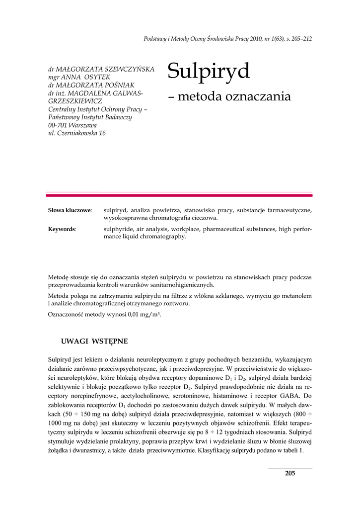 Podstawy i Metody Oceny Środowiska Pracy 2010, nr 1(63), s. 205–212 dr MAŁGORZATA SZEWCZYŃSKA mgr ANNA OSYTEK dr MAŁGORZATA POŚNIAK dr inż. MAGDALENA GALWASGRZESZKIEWICZ Centralny Instytut Ochrony Pracy – Państwowy Instytut Badawczy 00-701 Warszawa ul. Czerniakowska 16 Sulpiryd – metoda oznaczania Słowa kluczowe: sulpiryd, analiza powietrza, stanowisko pracy, substancje farmaceutyczne, wysokosprawna chromatografia cieczowa. Keywords: sulphyride, air analysis, workplace, pharmaceutical substances, high performance liquid chromatography. Metodę stosuje się do oznaczania stężeń sulpirydu w powietrzu na stanowiskach pracy podczas przeprowadzania kontroli warunków sanitarnohigienicznych. Metoda polega na zatrzymaniu sulpirydu na filtrze z włókna szklanego, wymyciu go metanolem i analizie chromatograficznej otrzymanego roztworu. Oznaczoność metody wynosi 0,01 mg/m3. UWAGI WSTĘPNE Sulpiryd jest lekiem o działaniu neuroleptycznym z grupy pochodnych benzamidu, wykazującym działanie zarówno przeciwpsychotyczne, jak i przeciwdepresyjne. W przeciwieństwie do większości neuroleptyków, które blokują obydwa receptory dopaminowe D1 i D2, sulpiryd działa bardziej selektywnie i blokuje początkowo tylko receptor D2. Sulpiryd prawdopodobnie nie działa na receptory norepinefrynowe, acetylocholinowe, serotoninowe, histaminowe i receptor GABA. Do zablokowania receptorów D1 dochodzi po zastosowaniu dużych dawek sulpirydu. W małych dawkach (50 ÷ 150 mg na dobę) sulpiryd działa przeciwdepresyjnie, natomiast w większych (800 ÷ 1000 mg na dobę) jest skuteczny w leczeniu pozytywnych objawów schizofrenii. Efekt terapeutyczny sulpirydu w leczeniu schizofrenii obserwuje się po 8 ÷ 12 tygodniach stosowania. Sulpiryd stymuluje wydzielanie prolaktyny, poprawia przepływ krwi i wydzielanie śluzu w błonie śluzowej żołądka i dwunastnicy, a także działa przeciwwymiotnie. Klasyfikację sulpirydu podano w tabeli 1. 205 Tabela 1. Klasyfikacja sulpirydu Symbol grupy Nazwa grupy N ośrodkowy układ nerwowy N 05 leki psycholeptyczne N 05 A leki przeciwpsychotyczne N 05 AL benzamidy N 05 AL 01 sulpiryd Sulpiryd powoli wchłania się z przewodu pokarmowego. Obecność pokarmu zmniejsza absorpcję o około 30%. Biodostępność leku jest mała (27 ÷ 34%) i zależy od różnic międzyosobniczych. Lek jest szybko rozmieszczany w tkankach, natomiast w niewielkim stopniu przenika przez barierę krew-mózg. Maksymalne stężenie we krwi osiąga po 3 ÷ 6 h po podaniu. Wiąże się z białkami osocza w około 40%, T0,5 we krwi wynosi 8 ÷ 9 h, a u pacjentów z ciężką niewydolnością nerek jest wydłużony do 20 ÷ 26 h po podaniu dożylnym. Lek jest wydalany z moczem i kałem, głównie w postaci niezmienionej. Wskazania do przyjmowania sulpirydu to ostre i przewlekłe psychozy schizofreniczne, zwłaszcza z objawami upośledzonej aktywności, a także stany depresyjne w przebiegu schizofrenii, zespoły urojeniowo-depresyjne, przewlekłe psychozy paranoidalne (bez pobudzenia), przewlekłe psychozy alkoholowe oraz zaburzenia psychosomatyczne. Sulpiryd bywa również lekiem pomocniczym w terapii uzależnienia alkoholowego. Rzadziej stosuje się go w: zaburzeniach żołądkowo-jelitowych (choroba wrzodowa żołądka i dwunastnicy oraz wrzodziejące zapalenie jelit), w migrenie i zawrotach głowy o różnej etiologii (m.in. choroba Meniera). Działanie niepożądane są zwykle łagodne i dotyczą głównie ośrodkowego układu nerwowego. Najczęściej występującym (u około 25% leczonych) działaniem niepożądanym jest nadmierne uspokojenie. Rzadziej obserwowano: senność, zawroty głowy, bezsenność i inne zaburzenia snu, bóle głowy, drażliwość, zaburzenia koncentracji i depresję. W pojedynczych przypadkach mogą wystąpić: objawy pozapiramidowe z niepokojem ruchowym i drżeniami mięśniowymi, późne dyskinezy i ataksje, a także późne dystonie. Donoszono o występowaniu drgawek, czasami u pacjentów bez wcześniejszych napadów w wywiadzie. Podobnie jak w przypadku innych leków neuroleptycznych może wystąpić tzw. złośliwy zespół neuroleptyczny (podwyższona temperatura, zmiany psychiczne, zaburzenia czynności układu autonomicznego i wzmożone napięcie mięśniowe). Po dużych dawkach leku może dochodzić do zwiększenia stężenia prolaktyny we krwi, co może być związane z wystąpieniem mlekotoku i zaburzeń cyklu miesiączkowego, bardzo rzadko ginekomastii. Może także wystąpić zwiększenie masy ciała. Ze strony układu krążenia obserwowano kołatanie serca i hipotonię ortostatyczną. Rzadko występują objawy ze strony przewodu pokarmowego: suchość błon śluzowych jamy ustnej, nudności, wymioty, zaparcie czy jadłowstręt. Notowano pojedyncze przypadki leukocytozy. Rzadko obserwowano żółtaczkę cholestatyczną i marskość żółciową pierwotną. Lek może wpływać na sprawność psychofizyczną w stopniu uniemożliwiającym prowadzenie pojazdów i obsługę urządzeń mechanicznych w ruchu. W czasie leczenia preparatem nie należy spożywać alkoholu. Substancja czynna została sklasyfikowana jako substancje drażniąca (Xn), działająca drażniąco na oczy, układ oddechowy i skórę (R36/37/38), (MSDS 73304, Fisherei 2004). Właściwości fizykochemiczne i toksykologiczne substancji zostały przedstawione w tabeli 2. 206 Tabela 2. Właściwości sulpirydu (EP V 2005; ChemIDplus) Nazwa Sulpiryd Wzór sumaryczny C15H23N3O4S Numer CAS 15676-16-1 Synonimy (RS)- N-[(1- etylopirolidyn-2-ylo)-metylo]-2-metoksy-5-sulfamoilobenzamid; 5-(aminosulfonyl)-N-((1-ethyl-2-pyrrolidinyl)methyl)-2methoxy-benzamid N-(1-ethyl-2-pyrrolidinyl)methyl)-5-sulfamoyl-o-anisamid Wzór strukturalny Kolor Kształt Temperatura wrzenia Temperatura topnienia Masa molowa logKow Rozpuszczalność Prężność par Inne właściwości Toksyczność biały krystaliczny proszek, dwie formy kryształków brak danych 178 oC 341,43 1,337 rozpuszczalny w wodzie (2280 mg/l 