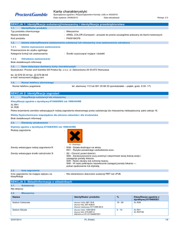 Karta charakterystyki Sporządzona zgodnie z Rozporządzeniem Komisji (UE) nr 453/2010 Data wydania: 25/06/2013 Data aktualizacji: Wersja: 2.0 SEKCJA 1: Identyfikacja substancji/mieszaniny i identyfikacja przedsiębiorstwa 1.1. Identyfikator produktu Typ produktu chemicznego : Mieszanina Nazwa handlowa : ARIEL COLOR (Compact) - proszek do prania szczególnie polecany do tkanin kolorowych Kod produktu : PA00184376 1.2. Istotne zidentyfikowane zastosowania substancji lub mieszaniny oraz zastosowania odradzane 1.2.1. Istotne wyznaczone zastosowania Przeznaczone do użytku ogólnego Kategoria funkcji lub zastosowania 1.2.2. : Środki czyszczące/ myjące i dodatki Odradzane zastosowanie Brak dodatkowych informacji 1.3. Dane dotyczące dostawcy karty charakterystyki Dystrybutor: Procter and Gamble DS Polska Sp. z o.o. ul. Zabraniecka 20 03-872 Warszawa tel. 22 678 55 44 fax. 22 678 86 64 e-mail: [email protected] 1.4. Numer telefonu alarmowego Numer telefonu pogotowia tel. alarmowy 112 lub 801 25 88 25 (poniedziałek – piątek, godz. 8:30 -17) SEKCJA 2: Identyfikacja zagrożeń 2.1. Klasyfikacja substancji lub mieszaniny Klasyfikacja zgodnie z dyrektywą 67/548/EWG lub 1999/45/WE Xi; R41 Xi; R38 Pełne brzemienie zwrotów wskazujących rodzaj zagrożenia stwarzanego przez substancję lub mieszaninę niebezpieczną: patrz sekcja 16. Efekty fizykochemiczne niepożądane dla zdrowia człowieka i dla środowiska Brak dodatkowych informacji 2.2. Elementy oznakowania Etykiety zgodne z dyrektywą 67/548/EWG lub 1999/45/WE Rodzaj zagrożenia : Zwroty wskazujące rodzaj zagrożenia R : R38 - Działa drażniąco na skórę. R41 - Ryzyko poważnego uszkodzenia oczu. Zwroty wskazujące środki ostrożności S : S2 - Chronić przed dziećmi. S26 - Zanieczyszczone oczy przemyć natychmiast dużą ilością wody i zasięgnąć porady lekarza. S39 - Nosić okulary lub ochronę twarzy. S46 - W razie połknięcia niezwłocznie zasięgnij porady lekarza — pokaż opakowanie lub etykietę. Xi - Drażniący 2.3. Inne zagrożenia Inne zagrożenia nie mające wpływu na klasyfikację : Nie stwierdzono obecności sustancji PBT lub vPvB. SEKCJA 3: Skład/informacja o składnikach 3.1. Substancje Nie dotyczy 3.2. Mieszaniny Nazwa Identyfikator produktu % Klasyfikacja zgodnie z dyrektywą 67/548/EEC Sodium Carbonate (Numer CAS) 497-19-8 (Numer WE) 207-838-8 (Numer indeksowy) 011-005-00-2 10 - 20 Xi; R36 Sodium Silicate (Numer CAS) 1344-09-8 (Numer WE) 215-687-4 (REACH-nr) 01-21194487251 5 - 10 Xi; R41 Xi; R37/38 03/07/2013 PL (Polski) 1/6 Karta charakterystyki Sporządzona zgodnie z Rozporządzeniem Komisji (UE) nr 453/2010 Nazwa Identyfikator produktu % Klasyfikacja zgodnie z dyrektywą 67/548/EEC Sodium C12-15 Pareth Sulfate (Numer CAS) 91648-56-5 (Numer WE) 293-918-8 1-5 Xi; R41 Xi; R38 Citric Acid (Numer CAS) 77-92-9 (Numer WE) 201-069-1 1-5 Xi; R36 C12-14 Pareth-7 (Numer CAS) 68439-50-9 (Numer WE) polymer 1-5 Xn; R22 Xi; R41 N; R50 Nazwa Identyfikator produktu % Klasyfikacja zgodnie z rozporzadzeniem (WE) Nr. 1272/2008 [UE-GHS/CLP] Sodium Carbonate (Numer CAS) 497-19-8 (Numer WE) 207-838-8 (Numer indeksowy) 011-005-00-2 10 - 20 Eye Irrit. 2, H319 Sodium Silicate (Numer CAS) 1344-09-8 (Numer WE) 215-687-4 (REACH-nr) 01-21194487251 5 - 10 Skin Irrit. 2, H315 Eye Dam. 1, H318 STOT SE 3, H335 Sodium C12-15 Pareth Sulfate (Numer CAS) 91648-56-5 (Numer WE) 293-918-8 1-5 Skin Irrit. 2, H315 Eye Dam. 1, H318 Citric Acid (Numer CAS) 77-92-9 (Numer WE) 201-069-1 1-5 Nie sklasyfikowany C12-14 Pareth-7 (Numer CAS) 68439-50-9 (Numer WE) polymer 1-5 Acute Tox. 4 (Oral), H302 Eye Dam. 1, H318 Pełne brzmienie zwrotów R-, H- i EUH: patrz sekcja 16. SEKCJA 4: Środki pierwszej pomocy 4.1. Opis środków pierwszej pomocy Pierwsza pomoc - środki po zainhalowaniu : W przypadku wystąpienia objawów: wyjść na powietrze i przewietrzyć podejrzane pomieszczenie. Przy problemach z oddychaniem: zasięgnąć porady lekarza/ przedstawiciela służby zdrowia. Pierwsza pomoc - środki po kontakcie ze skórą : W przypadku wystąpienia objawów: niezwłocznie przemyć znaczną ilością wody. Gdy podrażnienie się utrzymuje, udać się z poszkodowanym do lekarza. Pierwsza pomoc - środki po kontakcie z oczami : Natychmiast przemywać dużą ilością wody przez 15 minut. Gdy podrażnienie się utrzymuje, udać się z poszkodowanym do lekarza. Pierwsza pomoc - środki po połknięciu : Nie podawać wody do picia lub podać niewielką ilość. Nie dopuscić do wymiotów. Zasięgnąć porady lekarza/służby zdrowia. 4.2. Najważniejsze ostre i opóźnione objawy oraz skutki narażenia Symptomy/urazy w przypadku inhalacji : Może wywołać podrażnienie lub objawy przypominające astmę. Symptomy/urazy w przypadku kontaktu ze skórą : Może wywołać umiarkowane podrażnienie. Symptomy/urazy w przypadku kontaktu z oczami : Może wywołać silne podrażnienie. Symptomy/urazy w przypadku połknięcia : Skargi na żołądek/ jelita. 4.3. Wskazania dotyczące wszelkiej natychmiastowej pomocy lekarskiej i szczególnego postępowania z poszkodowanym Patrz sekcja 4.1. SEKCJA 5: Postępowanie w przypadku pożaru 5.1. Środki gaśnicze Odpowiednie środki gaśnicze 5.2. : suchy proszek chemiczny, piana odporna na alkohol, dwutlenek węgla (CO2). Szczególne zagrożenia związane z substancją lub mieszaniną Zagrożenie pożarowe : Nie ma zagrożenia pożarowego. Niepalny. Zagrożenie wybuchem : Produkt nie grozi wybuchem. Reaktywność : Reakcje niebezpieczne nie są znane. 5.3. Informacje dla straży pożarnej Instrukcja gaśnicza : Nie są wymagane specyficzne instrukcje gaśnicze. Ochrona podczas gaszenia pożaru : W przypadku niedostatecznej wentylacji stosować indywidualne środki ochrony dróg oddechowych. SEKCJA 6: Postępowanie w przypadku niezamierzonego uwolnienia do środowiska 6.1. Indywidualne środki ostrożności, wyposażenie ochronne i procedury w sytuacjach awaryjnych 6.1.1. Dla osób nienależących do personelu udzielająceg
