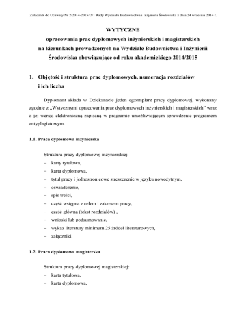Załącznik do Uchwały Nr 2/2014-2015/D/1 Rady Wydziału Budownictwa i Inżynierii Środowiska z dnia 24 września 2014 r. WYTYCZNE opracowania prac dyplomowych inżynierskich i magisterskich na kierunkach prowadzonych na Wydziale Budownictwa i Inżynierii Środowiska obowiązujące od roku akademickiego 2014/2015 1. Objętość i struktura prac dyplomowych, numeracja rozdziałów i ich liczba Dyplomant składa w Dziekanacie jeden egzemplarz pracy dyplomowej, wykonany zgodnie z „Wytycznymi opracowania prac dyplomowych inżynierskich i magisterskich” wraz z jej wersją elektroniczną zapisaną w programie umożliwiającym sprawdzenie programem antyplagiatowym. 1.1. Praca dyplomowa inżynierska Struktura pracy dyplomowej inżynierskiej: karty tytułowa, karta dyplomowa, tytuł pracy i jednostronicowe streszczenie w języku nowożytnym, oświadczenie, spis treści, część wstępna z celem i zakresem pracy, część główna (tekst rozdziałów) , wnioski lub podsumowanie, wykaz literatury minimum 25 źródeł literaturowych, załączniki. 1.2. Praca dyplomowa magisterska Struktura pracy dyplomowej magisterskiej: karta tytułowa, karta dyplomowa, tytuł pracy i jednostronicowe streszczenie w języku nowożytnym, oświadczenie, spis treści, część wstępna z celem i zakresem pracy, część główna (tekst rozdziałów), wnioski lub podsumowanie, wykaz literatury minimum 30 źródeł literaturowych, załączniki. 1.3. Prace projektowe z zakresu: architektury krajobrazu, urbanistyki i planowania przestrzennego W przypadku prac projektowych z zakresu: architektury krajobrazu, urbanistyki i planowania przestrzennego (dotyczy kierunków: architektura krajobrazu oraz gospodarka przestrzenna) integralną część pracy dyplomowej stanowi opracowanie projektowe zilustrowane na planszach o formacie 70 x 100 cm. W przypadku opracowań planistycznych wielkość części graficznej zależy od zakresu opracowania. Plansze opracowań projektowych należy złożyć w twardej teczce umożliwiającej archiwizowanie. Na okładce teczki należy umieścić kopię strony tytułowej pracy. W części opisowej pracy jako załącznik należy zamieścić wszystkie rysunki umieszczone na planszach. 1.4. Ustawienia strony Zasadnicze ustawienia strony: format: A4 (21 x 29,7 cm), styl tekstu pracy: standardowy, czcionka: Times New Roman – 12 pkt, styl czcionki normalny, odstęp między znakami normalny, interlinia 1,5 wiersza, wyrównanie tekstu – dwustronne (tekst wyjustowany), wyrównanie tytułów rozdziałów i podrozdziałów – do lewej, format akapitu: akapity wcięcie – 1,25 cm, marginesy: lewy – 3,00 cm prawy – 2,00 cm, górny – 2,50 cm, dolny – 2,50 cm; nagłówek: 1,25 cm; stopka: 1,25 cm. 1.5. Ogólne wytyczne do opracowania poszczególnych rozdziałów pracy dyplomowej Karta tytułowa – karta zaprezentowana na stronie internetowej stronie internetowej http://wb.pb.edu.pl/Dyplom.html Karta dyplomowa – kartę (zaprezentowaną na http://wb.pb.edu.pl/Dyplom.html) wypisuje promotor. Karta dyplomowa jest podstawowym dokumentem do opracowania pracy dyplomowej. Należy ściśle przestrzegać punktów z zakresu pracy, wpisanych do karty przez promotora. W pracy dyplomowej powinny być opracowane wszystkie punkty, które zostały zawarty w karcie dyplomowej. Tytuł pracy i streszczenie w języku obcym nowożytnym – streszczenie powinno obejmować 300-400 wyrazów. Oświadczenie - zaprezentowane na stronie internetowej http://wb.pb.edu.pl/Dyplom.html Spis treści – z wpisanymi numerami stron poszczególnych rozdziałów i punktów oraz z tytułami załączników. Część wstępna może składać się ze: wstępu (wprowadzenia do tematu), charakterystyki obszaru badań, celu i zakresu pracy. Wstęp jest merytorycznym wprowadzeniem do tematu i stanowi integralną część tekstu głównego pracy. Część wstępna może być jednym lub kilkoma rozdziałami. Struktura części wstępnej: uzasadnienie aktualności tematu; cel pracy; zakres pracy; Część główna – zawiera 2-5 rozdziałów. Kolejność rozdziałów powinna być logiczna i uporządkowana. W pierwszym przybliżeniu kolejność ta została zaproponowana w karcie dyplomowej. Rozdział 1. Zawsze jest przeglądem literatury. Tytuł rozdziału wynika z tematu przeglądu i nie koniecznie musi nazywać się „Przegląd literatury …”. Pozostałe rozdziały zależą od kierunku studiów, specjalności i tematu pracy dyplomowej. Powinny być omówione przez promotora pracy oraz podczas Seminarium dyplomowego. Wnioski – praca dyplomowa powinna być zakończona wnioskami. Literatura – należy szukać w odpowiednich do tematu pracy dyplomowej podręcznikach i monografiach naukowych. Najnowsze i bardziej szczegółowe informacje można uzyskać ze zbliżonych do tematu artykułów z czasopism oraz referatów z materiałów konferencyjnych. W pracach dyplomowych wykorzystuje się także aktualne normy i wytyczne. Można korzystać z artykułów i materiałów z Internetu. Załączniki – należy tu umieszczać materiały pomocnicze wykorzystane przy pisaniu pracy dyplomowej. W większości przypadków są to protokoły rejestracji pomiarów z badań laboratoryjnych czy wydruki wyników obliczeń za pomocą programów komputerowych, które są dowodem samodzielności autora w uzyskaniu tych wyników. Również w załączniku, zamieszcza się zaświadczenie o pozwoleniu na zastosowanie materiałów projektowych oraz udokumentowanie wdrożeń wyników badań autora w biurach projektowych czy firmach budowlanych. Wnioski/Podsumowanie, Literatura i Załączniki nie są rozdziałami, więc nie należy ich numerować. 2. Tytuł rozdziału 2.1. Tytuł podrozdziału Każdy rozdział rozpoczyna się od nowej strony. Zawartość każdego rozdziału czy podrozdziału powinna odpowiadać jego tytułowi. W pracy stosuje się numerację liczbową wielorzędową. Należy unikać stosowania stylów numeracji bardziej rozbudowanych niż x.x.x.